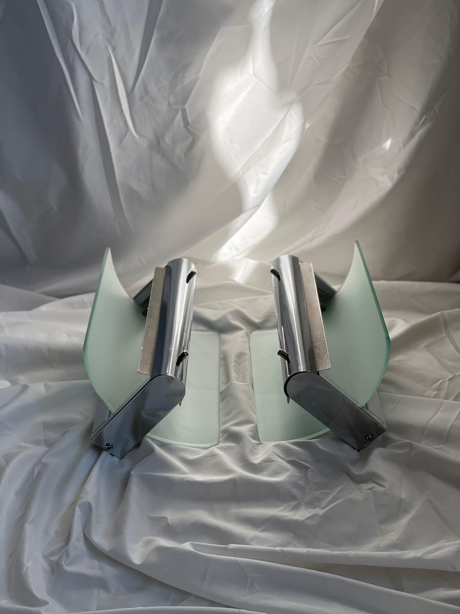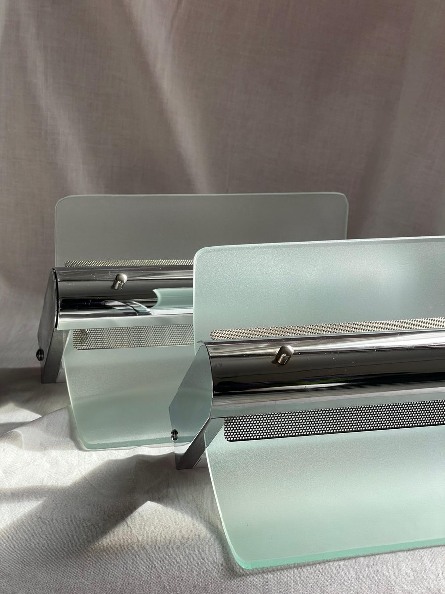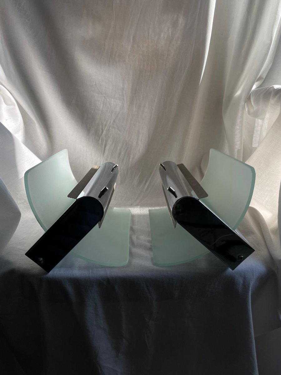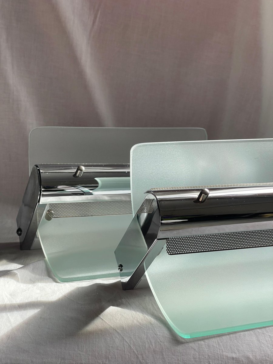 Lampade da parete vintage in metallo cromato e vetro sabbiato, anni '80, set di 2