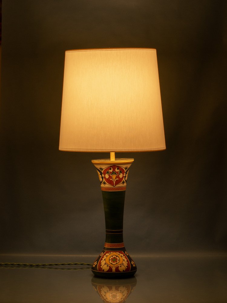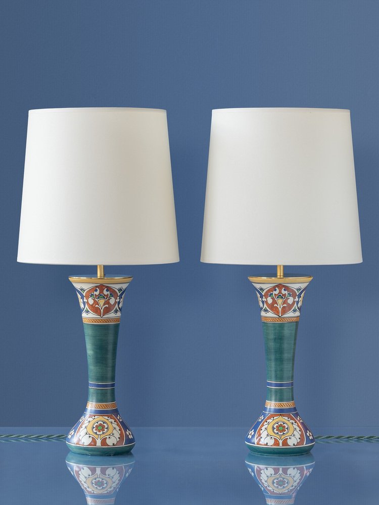 Meet Toni & Tini! These one-of-a-kind lamps are lovingly handcrafted from antique, rare vases from the renowned Arnhemsche Fayencefabriek. Each vase, forming the lamp's base, is a testament to the superb artistry of the past, featuring distinctive matte glazes with hand-painted colorful designs.