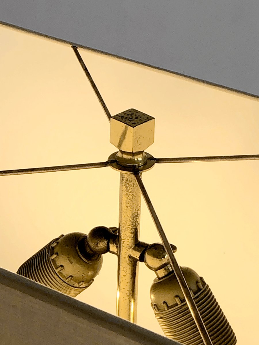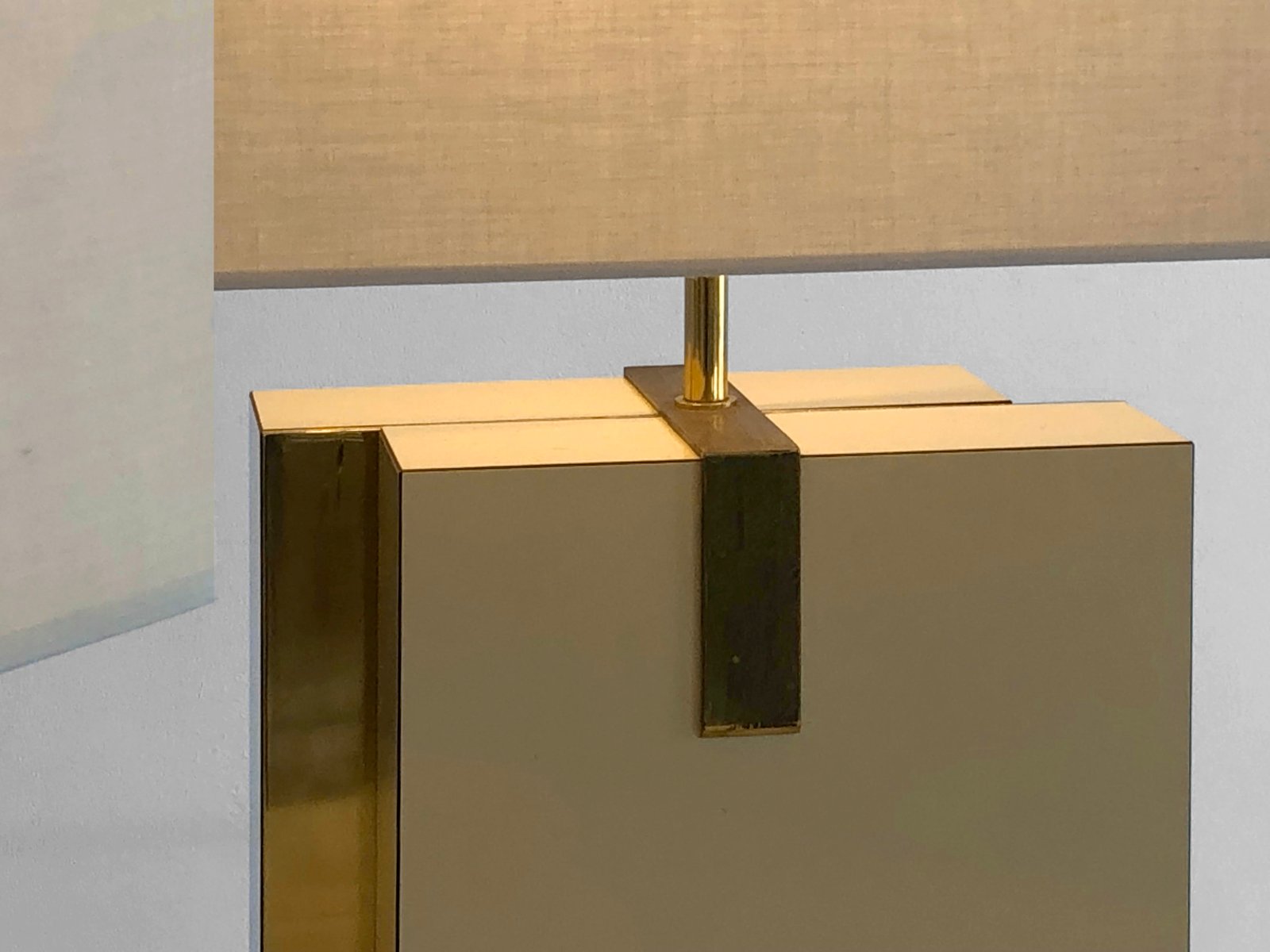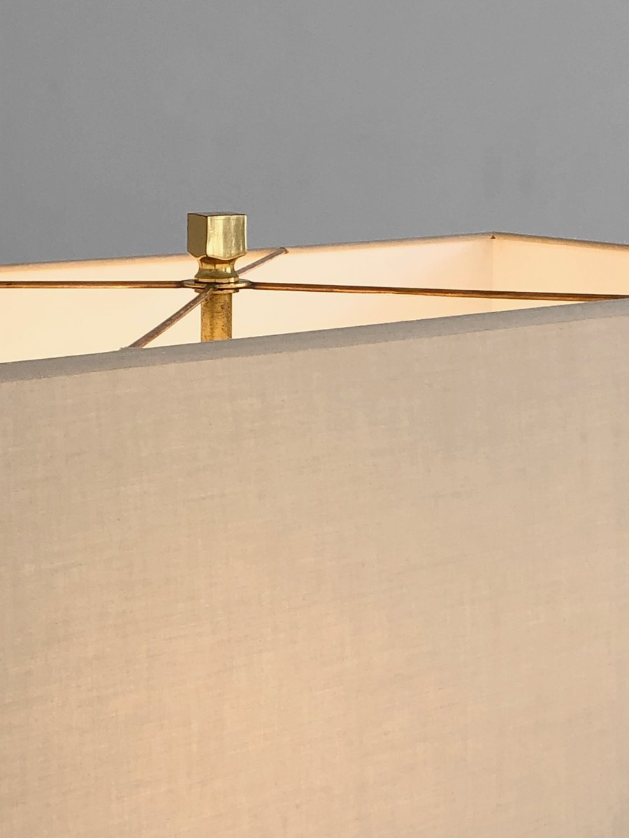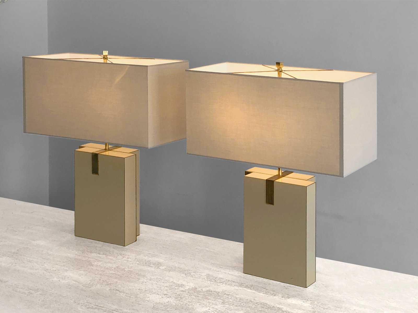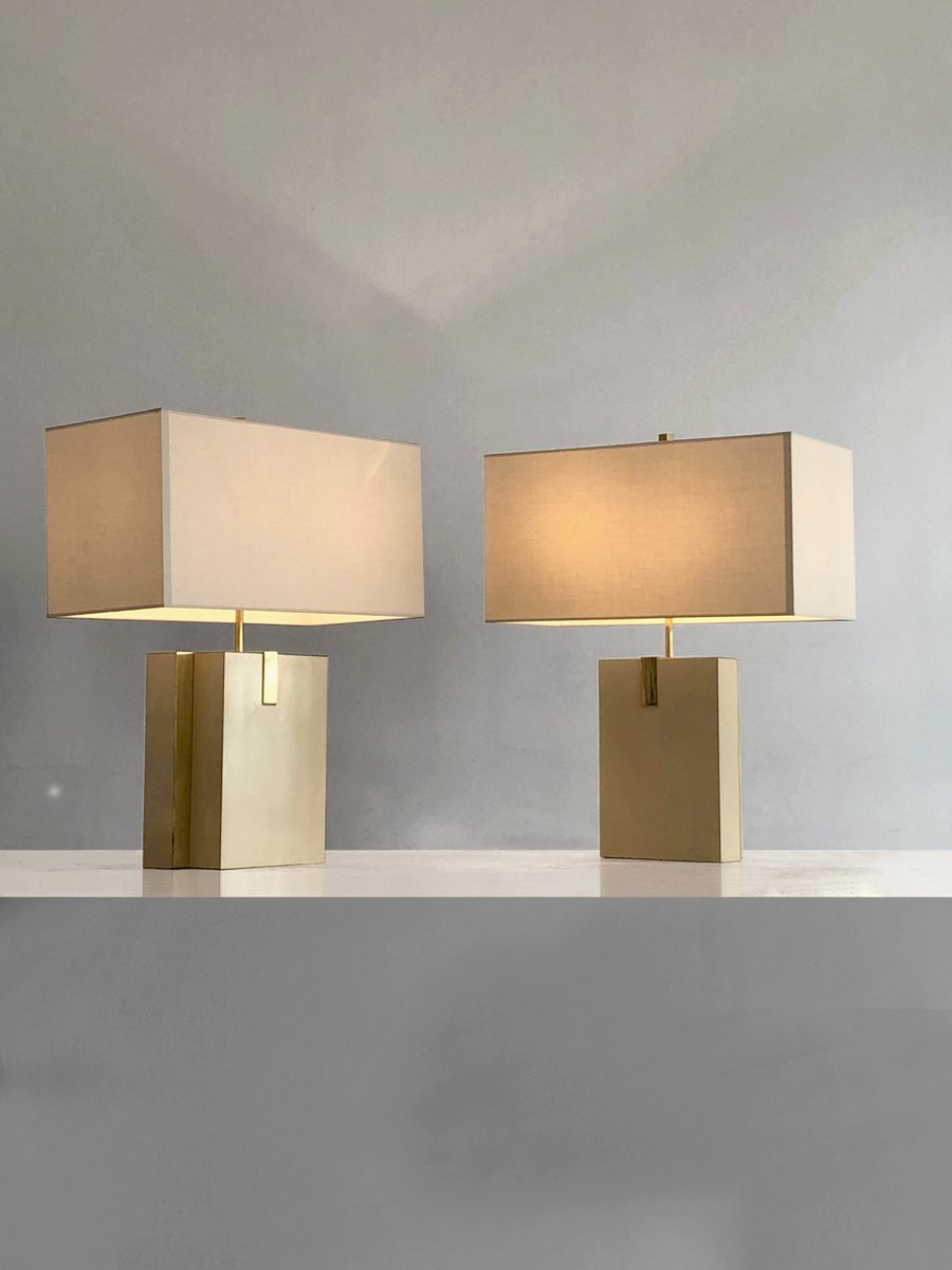 An important and rigorous pair of table lamps, Post-Modernist, Shabby-Chic, Neo-Classical, Seventies, asymmetrical compositions of 2 rectangular blocks in beige veneered wood, offset revealing golden edges, enhanced by bronze or brass structures patinated gold, each supporting a large horizontal cream-colored lampshade. Superb combination of classic luxury and seventies neo-constructivism, in the spirit of Roméo Rega, to be attributed, label mentioning the name of the model "Mara Grande Beige" and the distribution "Corinne Halma" Italy 1970-1980.