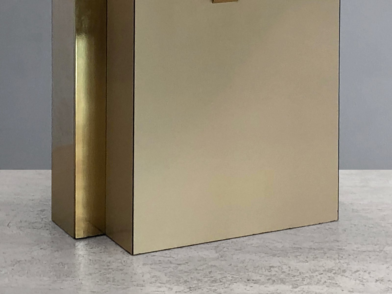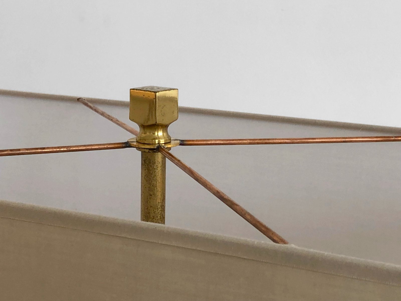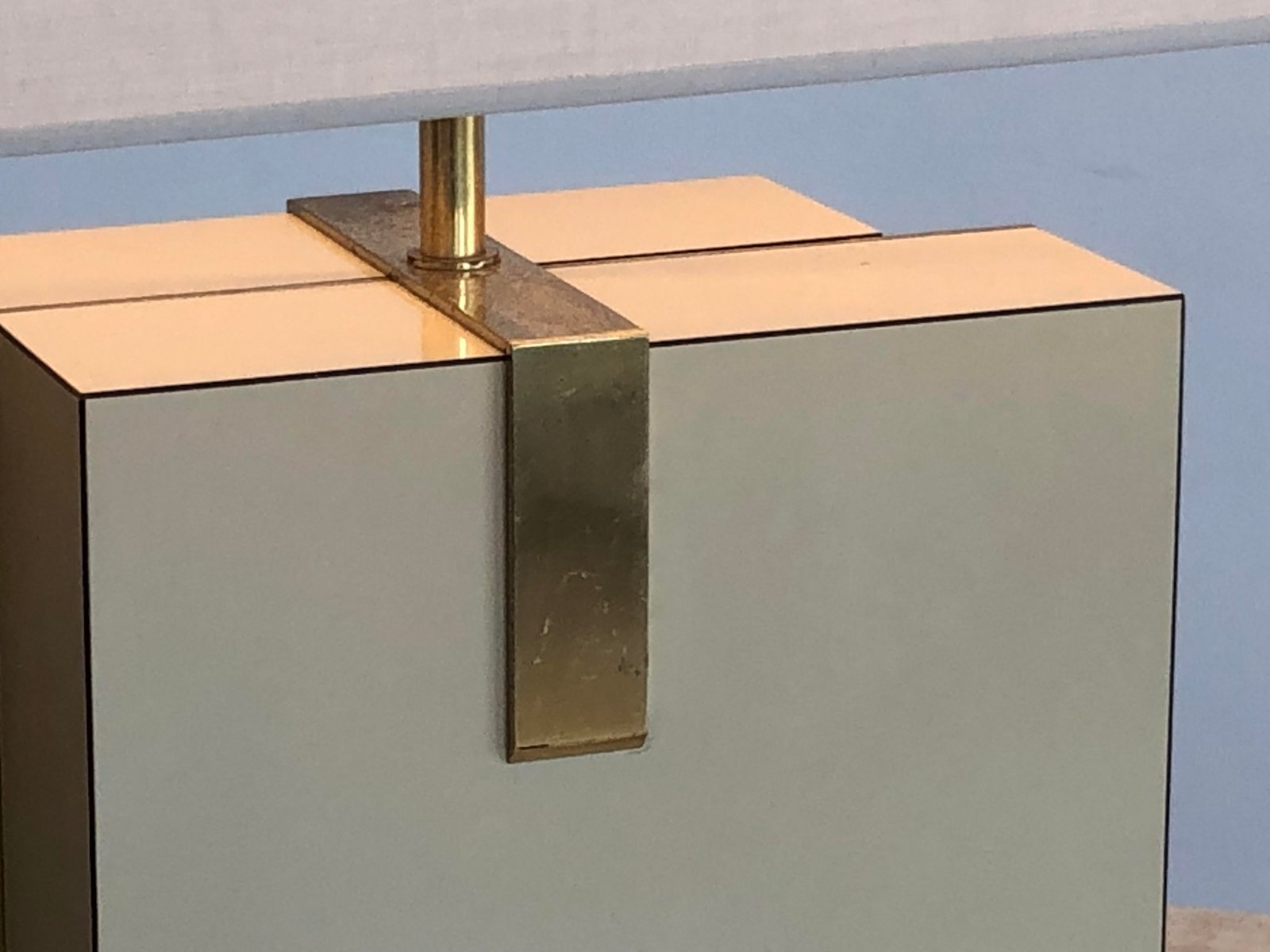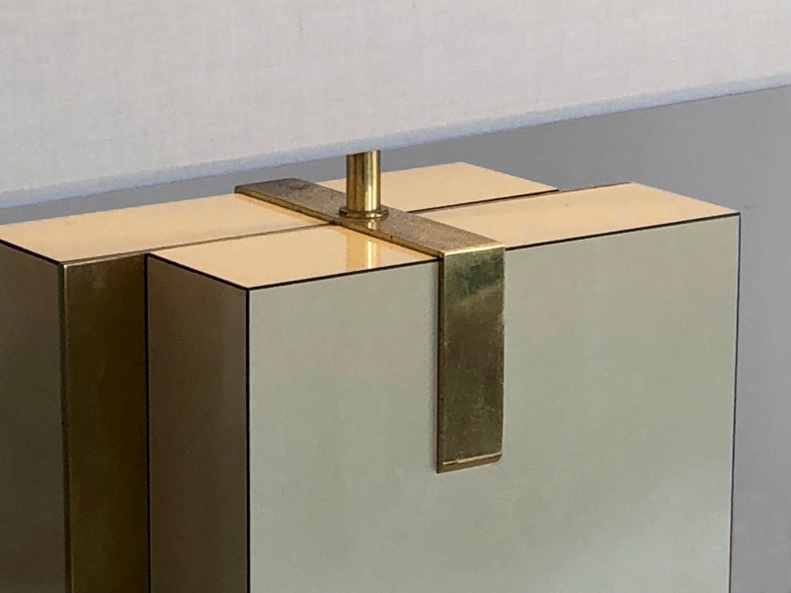 An important and rigorous pair of table lamps, Post-Modernist, Shabby-Chic, Neo-Classical, Seventies, asymmetrical compositions of 2 rectangular blocks in beige veneered wood, offset revealing golden edges, enhanced by bronze or brass structures patinated gold, each supporting a large horizontal cream-colored lampshade. Superb combination of classic luxury and seventies neo-constructivism, in the spirit of Roméo Rega, to be attributed, label mentioning the name of the model "Mara Grande Beige" and the distribution "Corinne Halma" Italy 1970-1980.