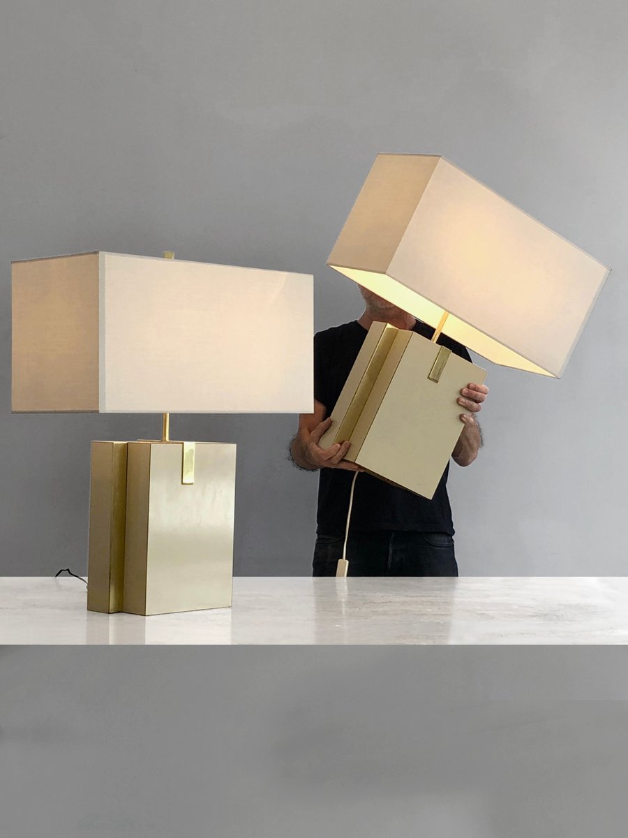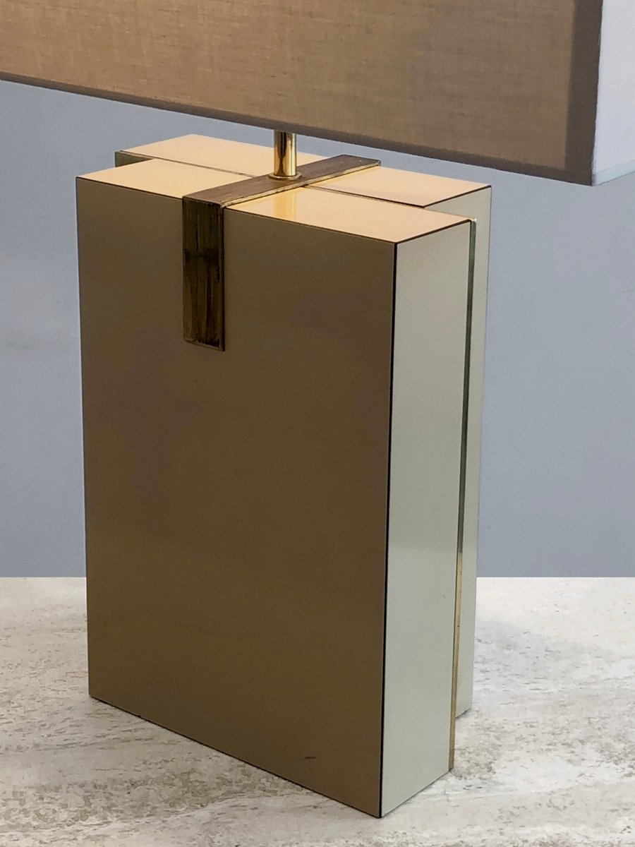 Importante e rigorosa coppia di lampade da tavolo, Post-Modernista, Shabby-Chic, Neo-Classico, Anni Settanta, composizioni asimmetriche di 2 blocchi rettangolari in legno impiallacciato beige, sfalsati che rivelano bordi dorati, impreziositi da strutture in bronzo o ottone patinato oro, ciascuno dei quali sostiene un grande paralume orizzontale color crema. Superba combinazione di lusso classico e neocostruttivismo anni Settanta, nello spirito di Roméo Rega, da attribuire, etichetta che cita il nome del modello "Mara Grande Beige" e la distribuzione "Corinne Halma" Italia 1970-1980.