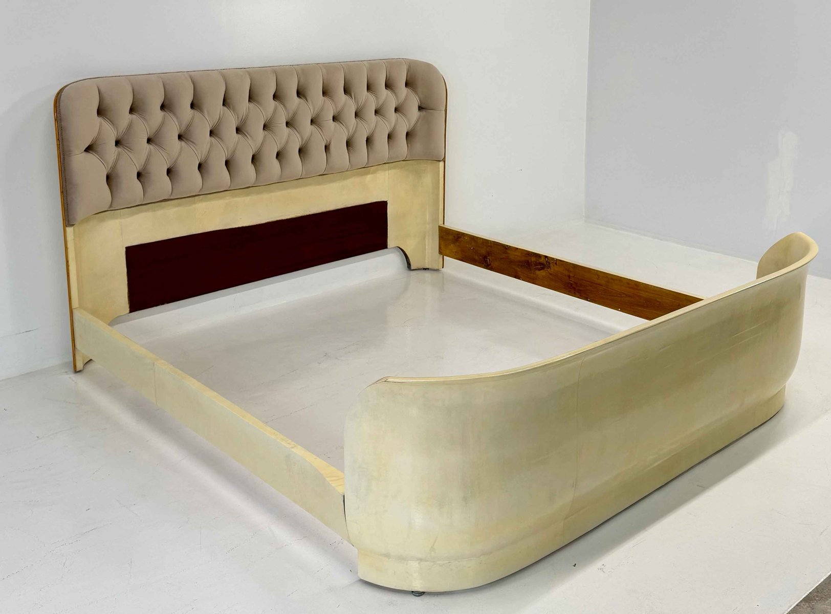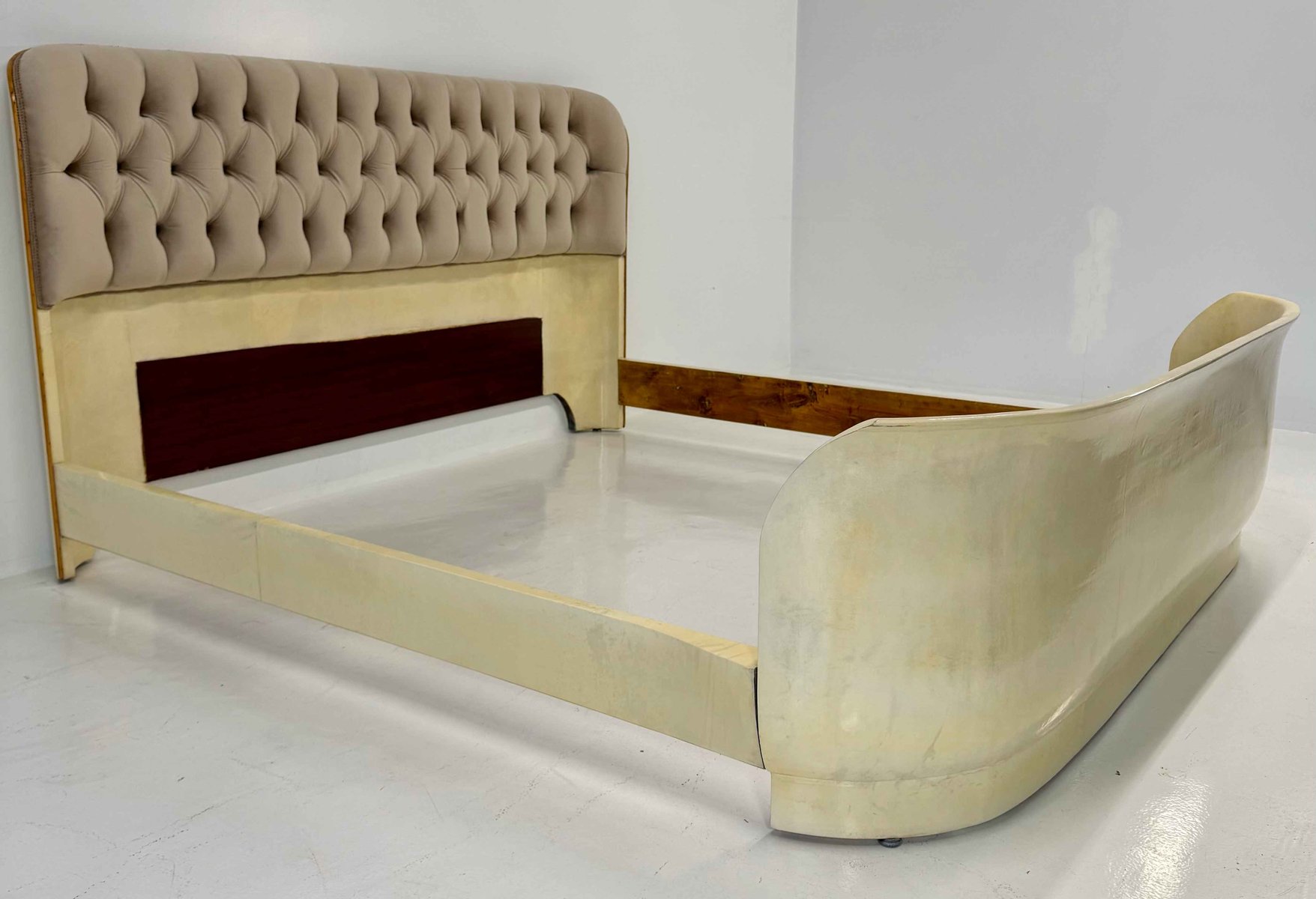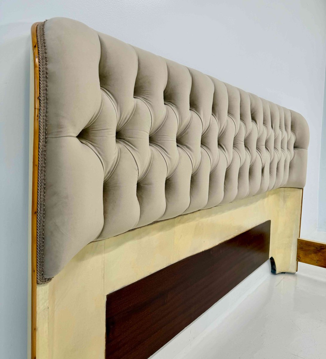 The headboard is enriched with a refined beige velvet capitonné, recently reupholstered and padded, creating a harmonious contrast in both texture and tone with the parchment leather upholstery of the bed frame.