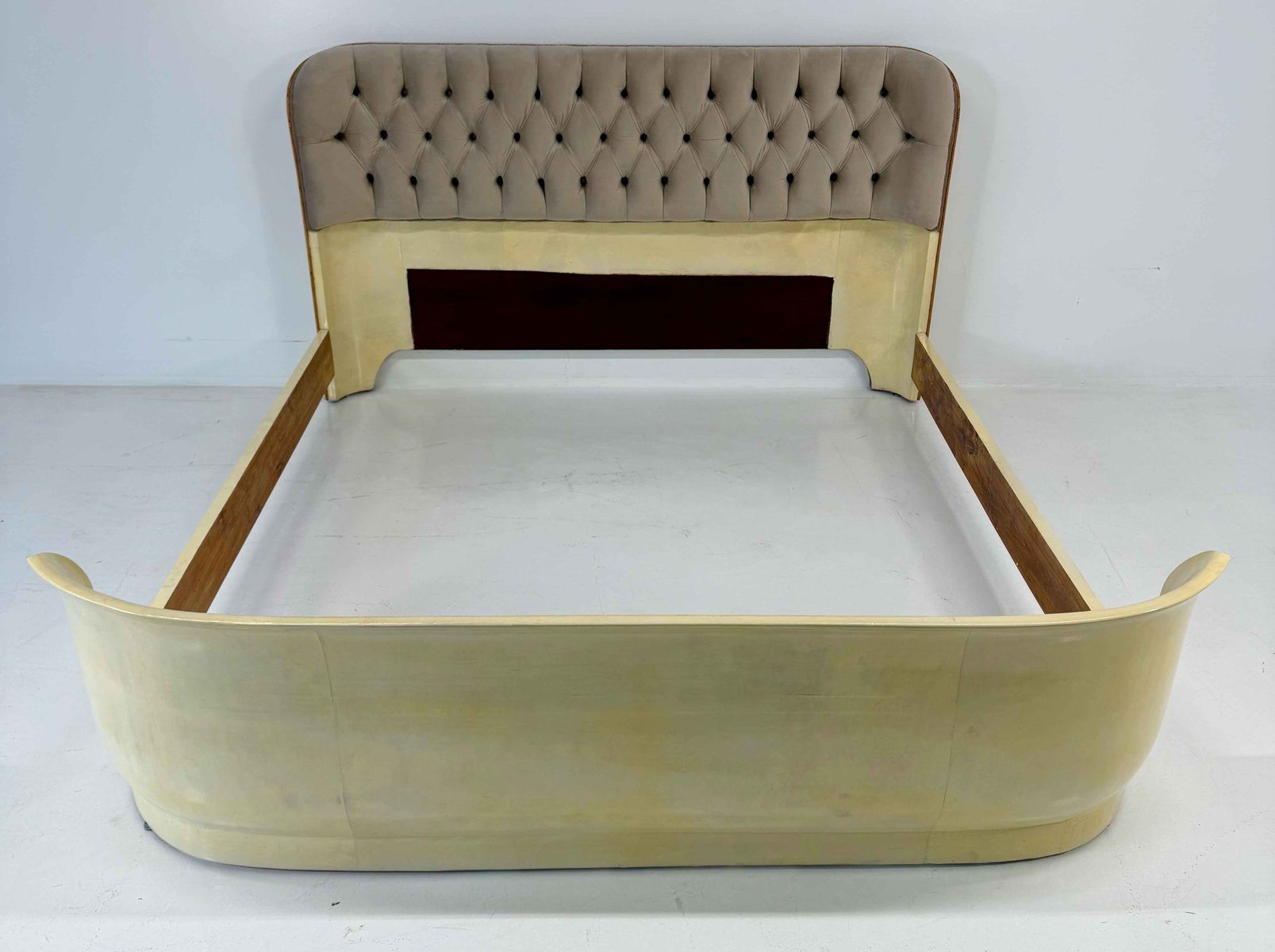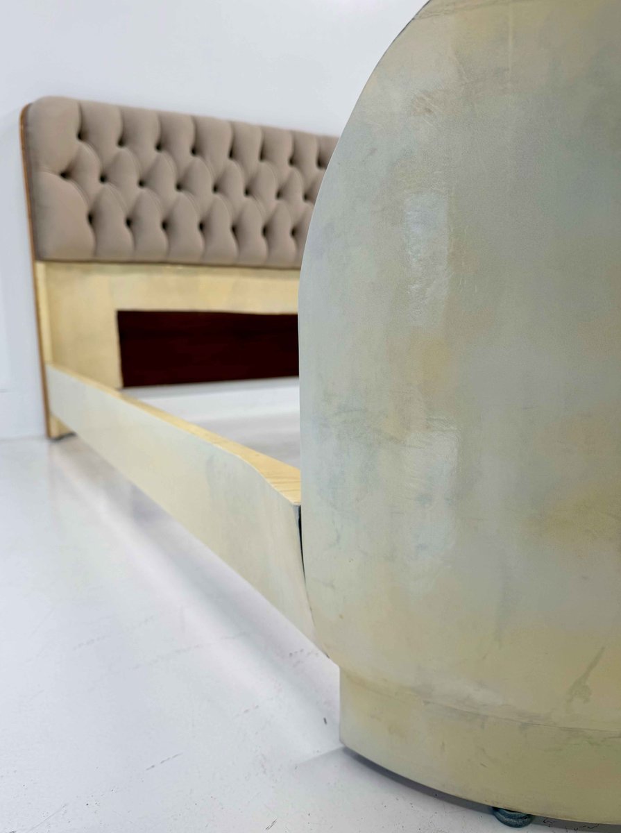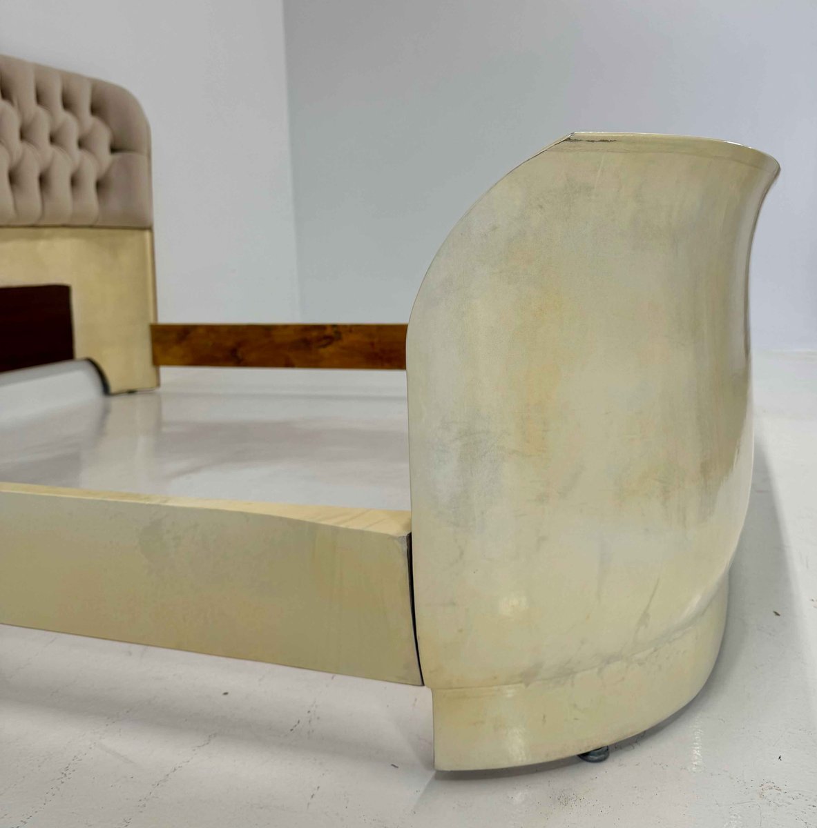 The headboard is enriched with a refined beige velvet capitonné, recently reupholstered and padded, creating a harmonious contrast in both texture and tone with the parchment leather upholstery of the bed frame.
