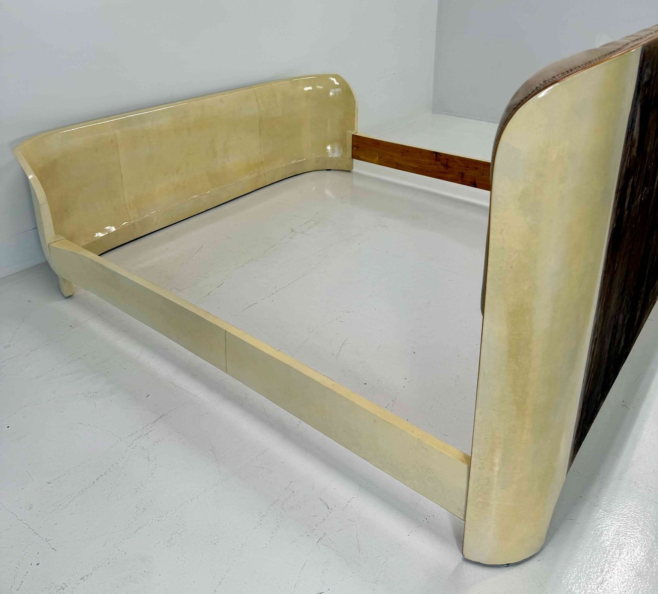 Importante ed eccezionalmente raro letto Art Déco italiano degli anni '40, interamente rivestito in pelle pergamena, materiale di eccezionale qualità e artigianalità.