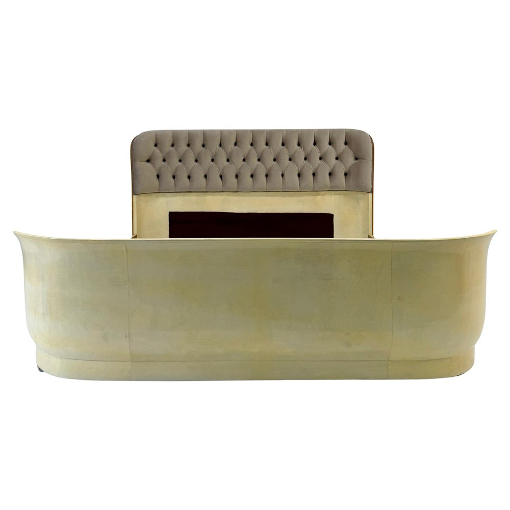 The structure features soft, enveloping lines typical of the finest Italian Art Deco production, with an elegant curved bed frame that gives the piece a strong sculptural presence and timeless sophistication.