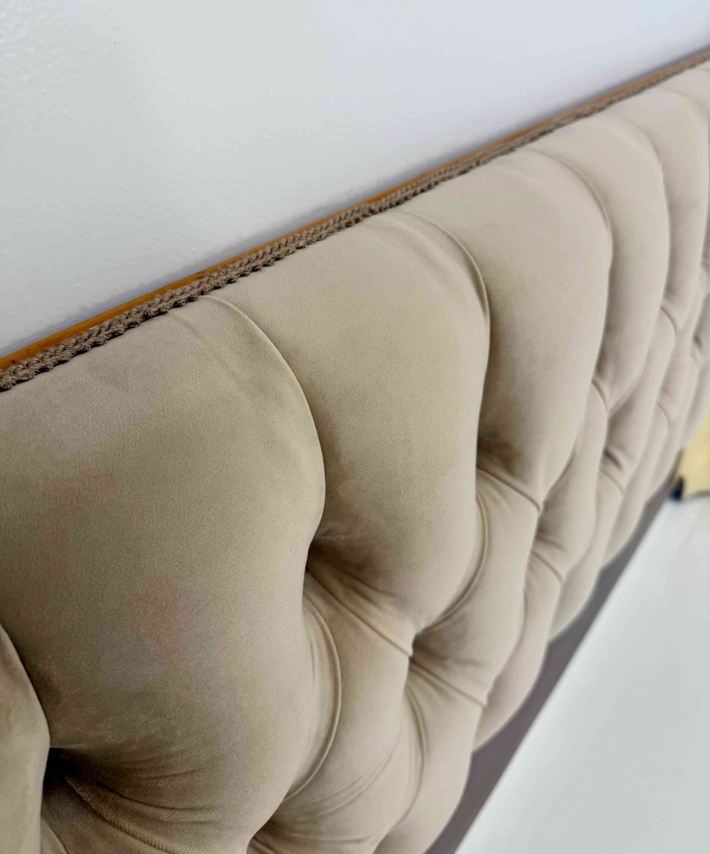 La testata è impreziosita da un raffinato velluto capitonné beige, recentemente ridipinto e imbottito, che crea un armonioso contrasto di texture e tonalità con il rivestimento in pelle pergamena del giroletto.