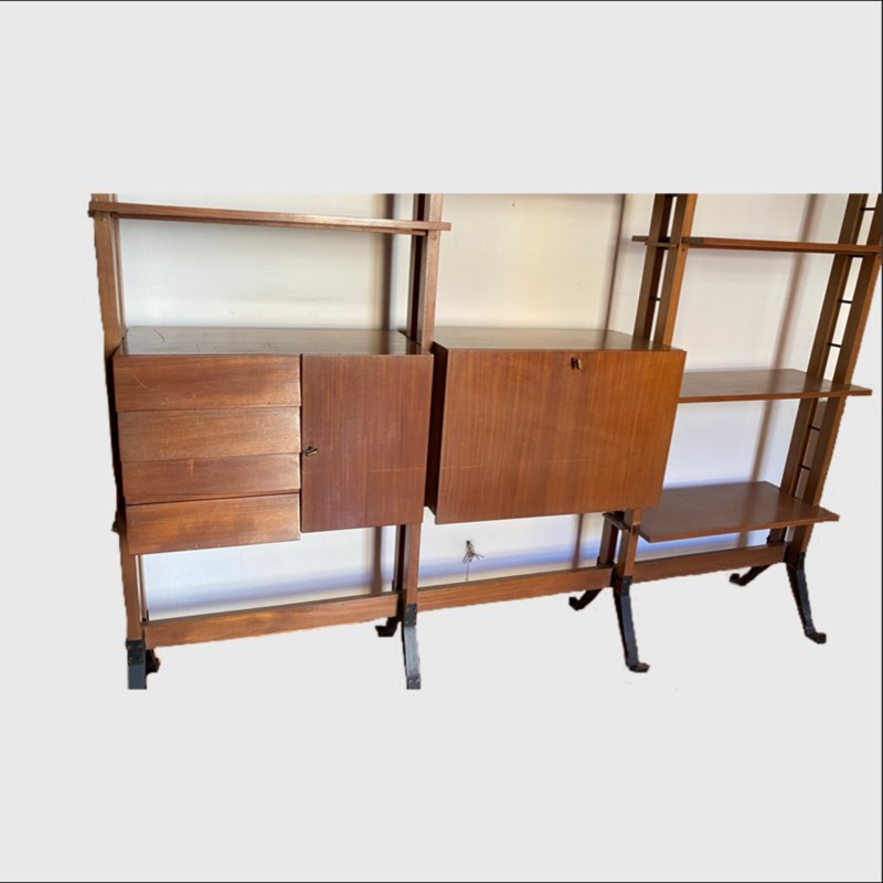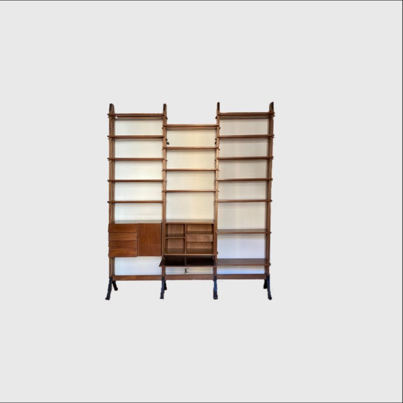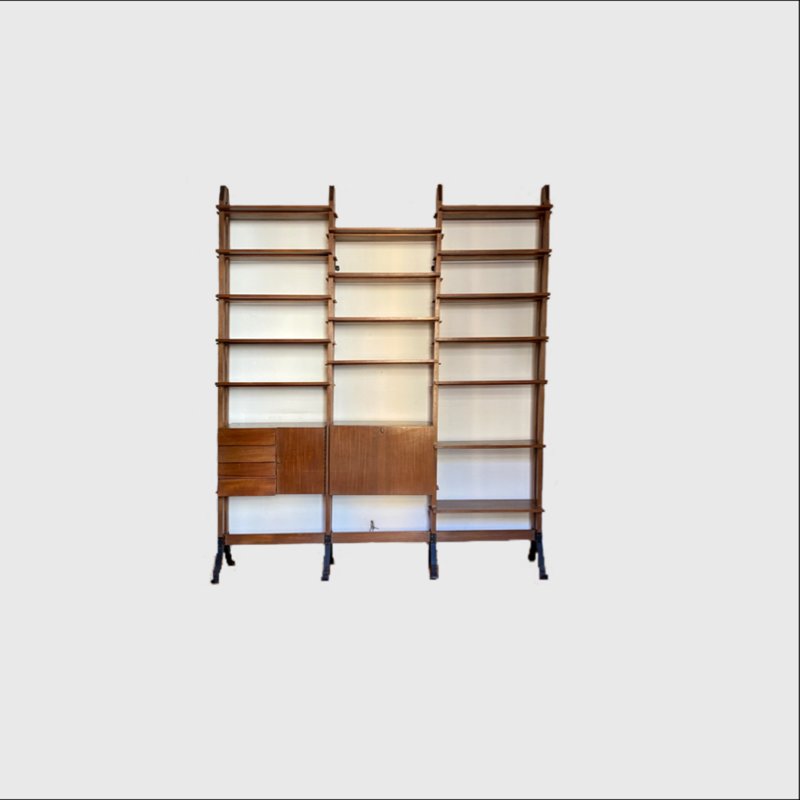 Grande libreria autoportante a tre campate, originale Italia anni 50.