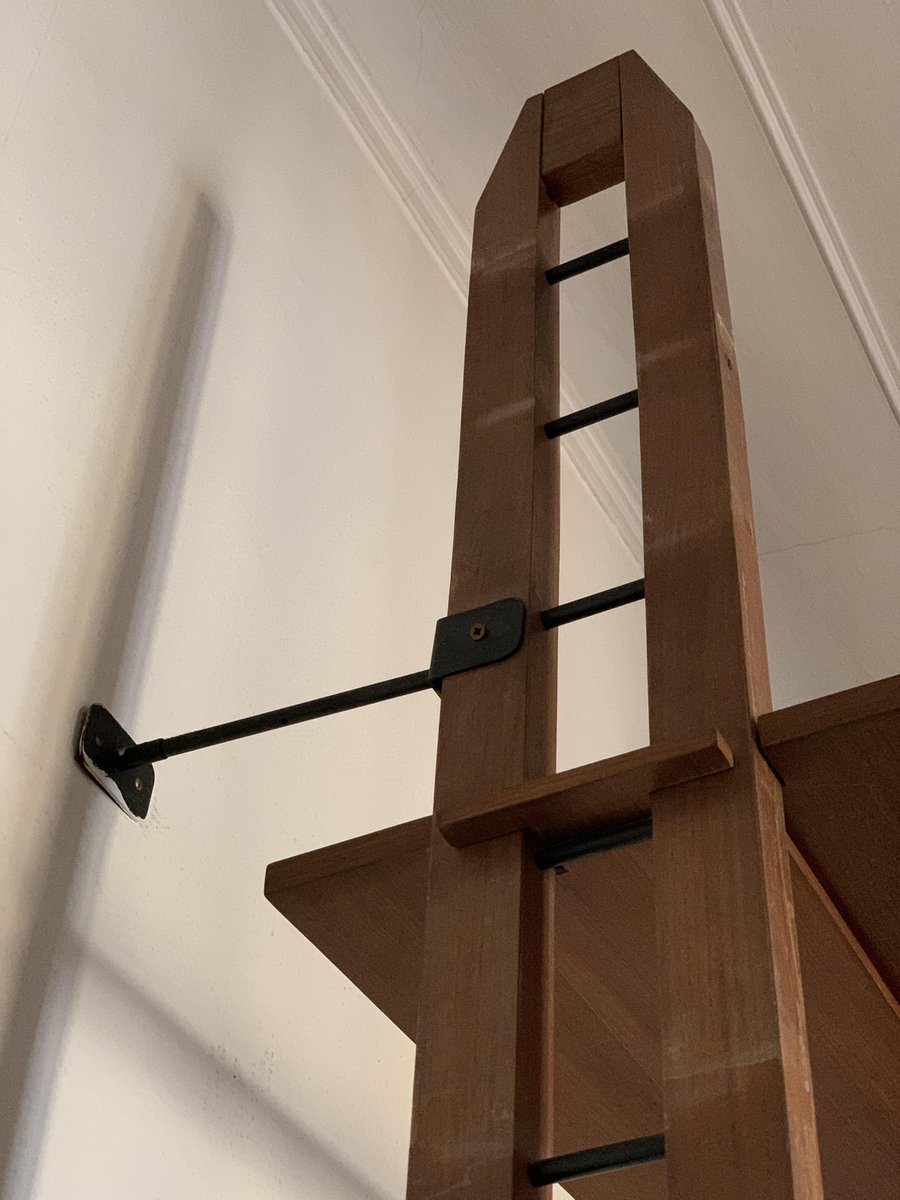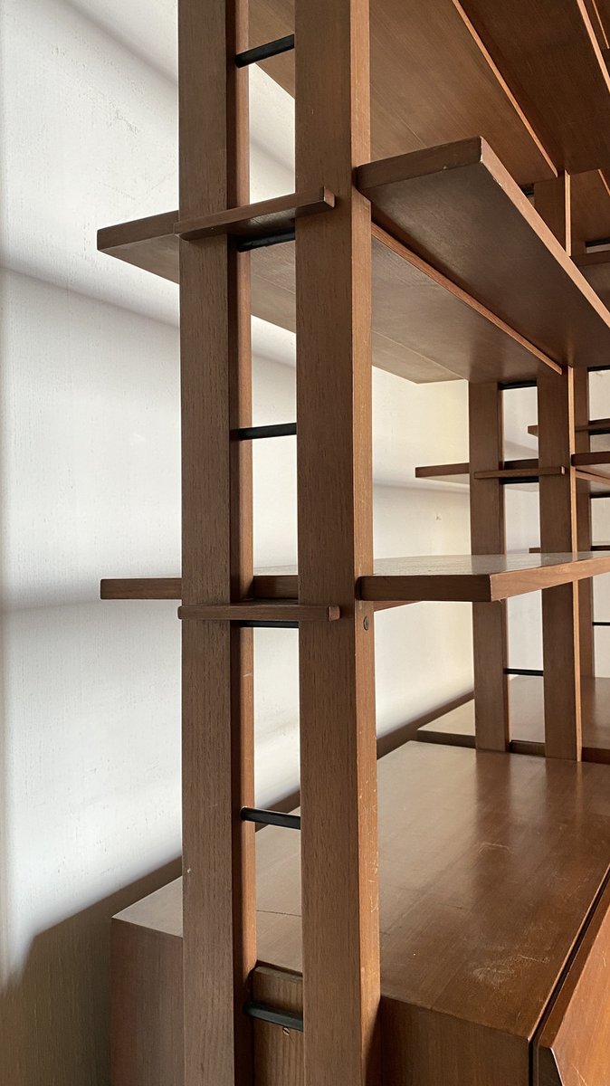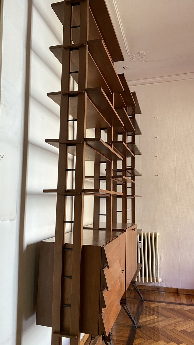 Extremely rare due to its height of 280 cm and the characteristics of its self-supporting structure, fixed to the wall behind the bookcase and not at the top like the more common floor-to-ceiling ones.