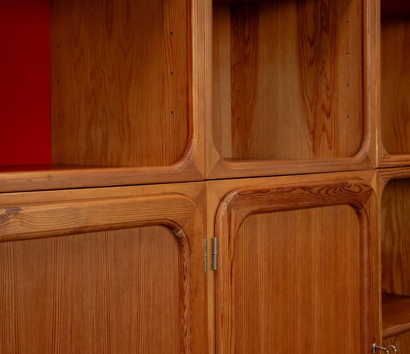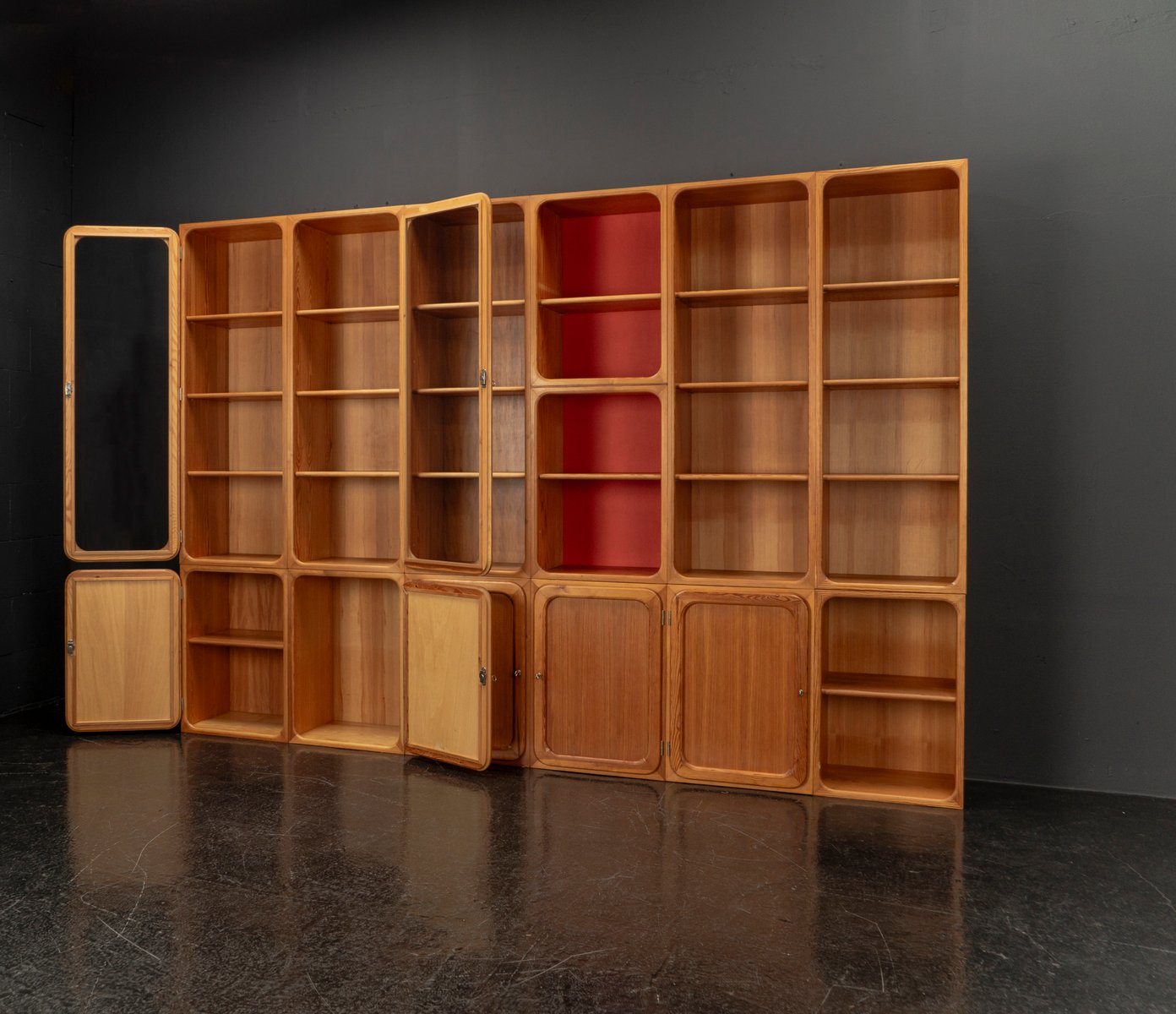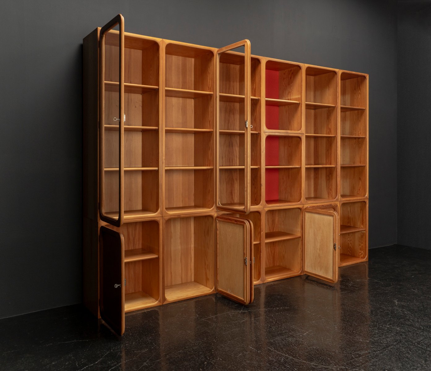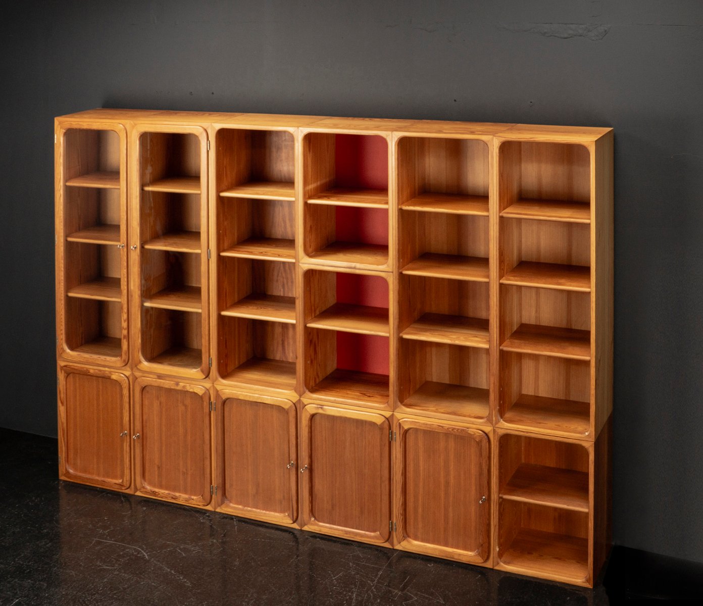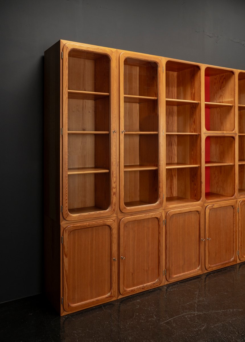 This exceptional wall unit with 14 pieces from the 1960s embodies the perfect balance between functionality and refined aesthetics. Crafted from warm pine veneer with solid pine doors, it exudes natural elegance and superb craftsmanship. Its well proportioned design reveals the hand of a talented though unknown designer who created a piece of timeless beauty through harmony and subtle detail. The ensemble consists of thirteen modules that together form an impressive architectural composition. Two large elements with glass doors elegantly display objects or books, while five smaller units with wooden doors provide concealed storage. Two modules feature a vivid cinnabarred back panel, introducing a bold modernist accent, and four open units add lightness and transparency to the overall structure.