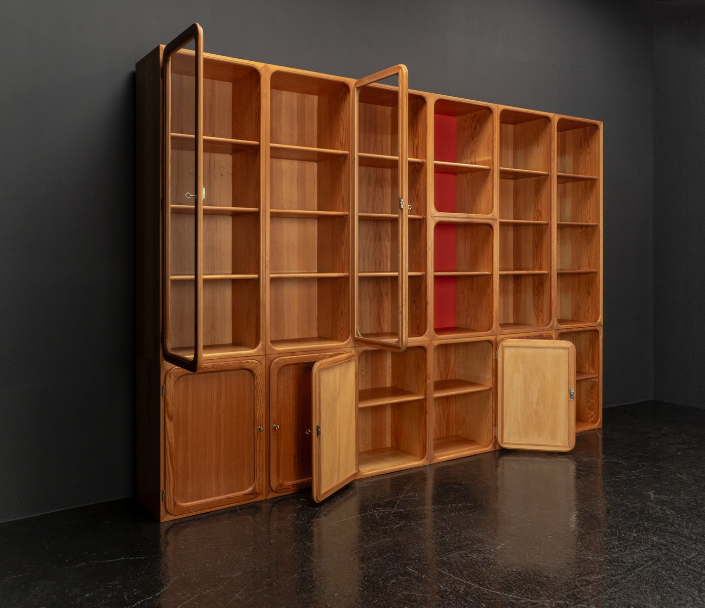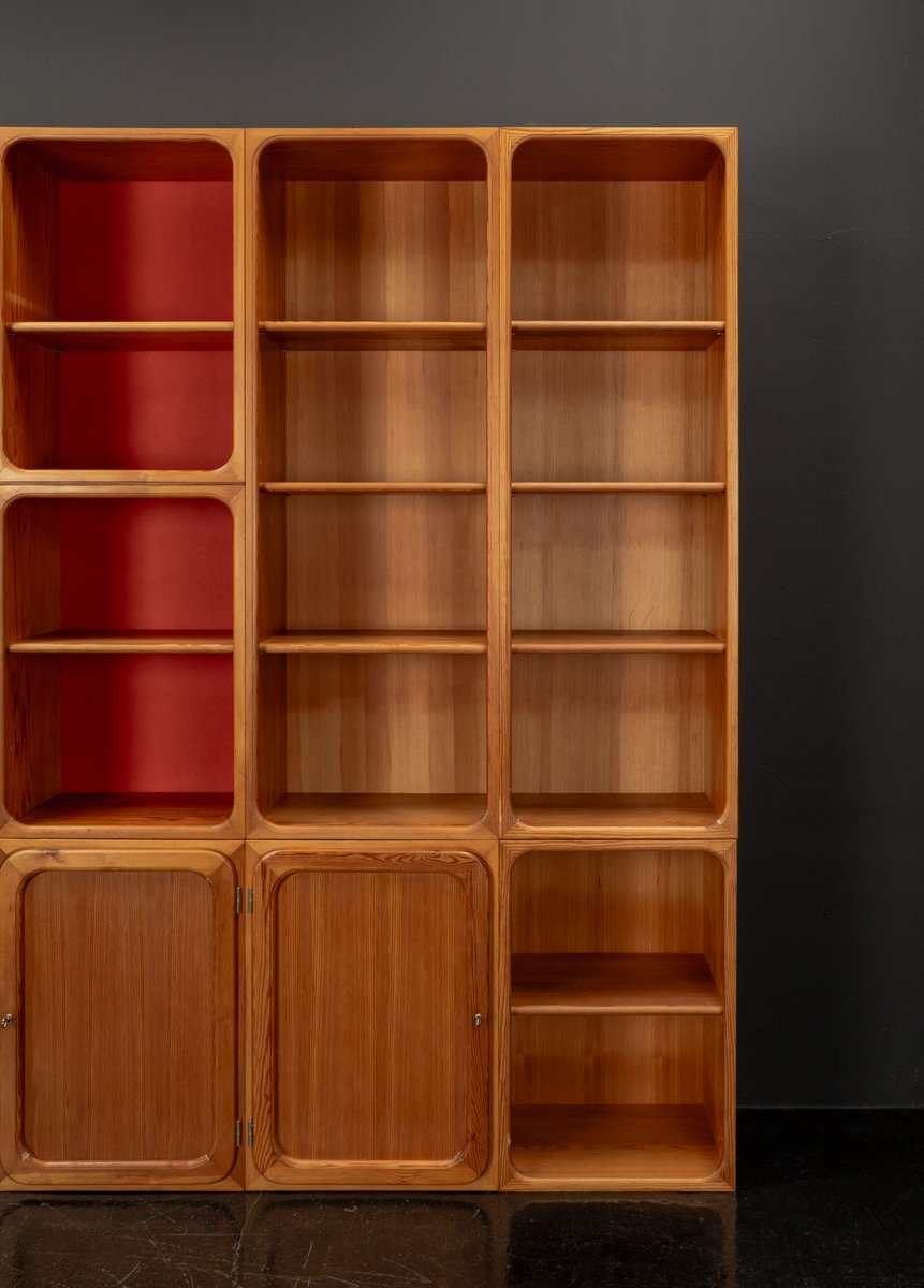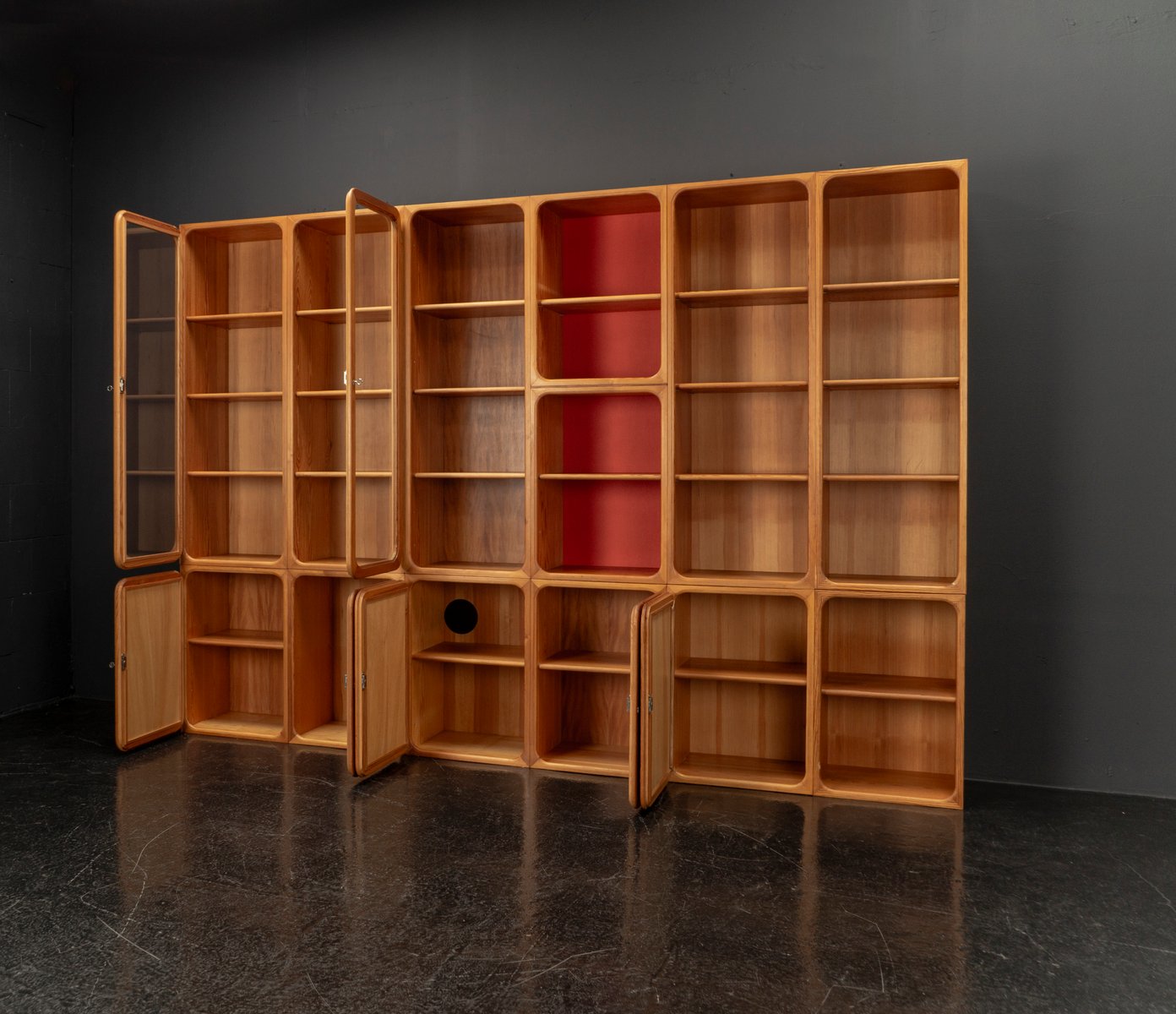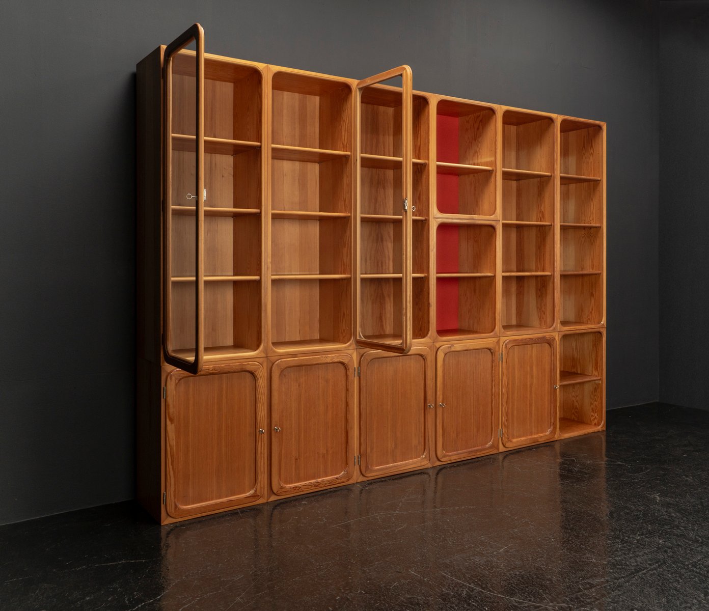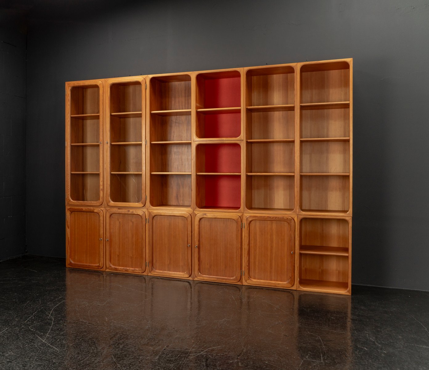 This exceptional wall unit with 14 pieces from the 1960s embodies the perfect balance between functionality and refined aesthetics. Crafted from warm pine veneer with solid pine doors, it exudes natural elegance and superb craftsmanship. Its well proportioned design reveals the hand of a talented though unknown designer who created a piece of timeless beauty through harmony and subtle detail. The ensemble consists of thirteen modules that together form an impressive architectural composition. Two large elements with glass doors elegantly display objects or books, while five smaller units with wooden doors provide concealed storage. Two modules feature a vivid cinnabarred back panel, introducing a bold modernist accent, and four open units add lightness and transparency to the overall structure.