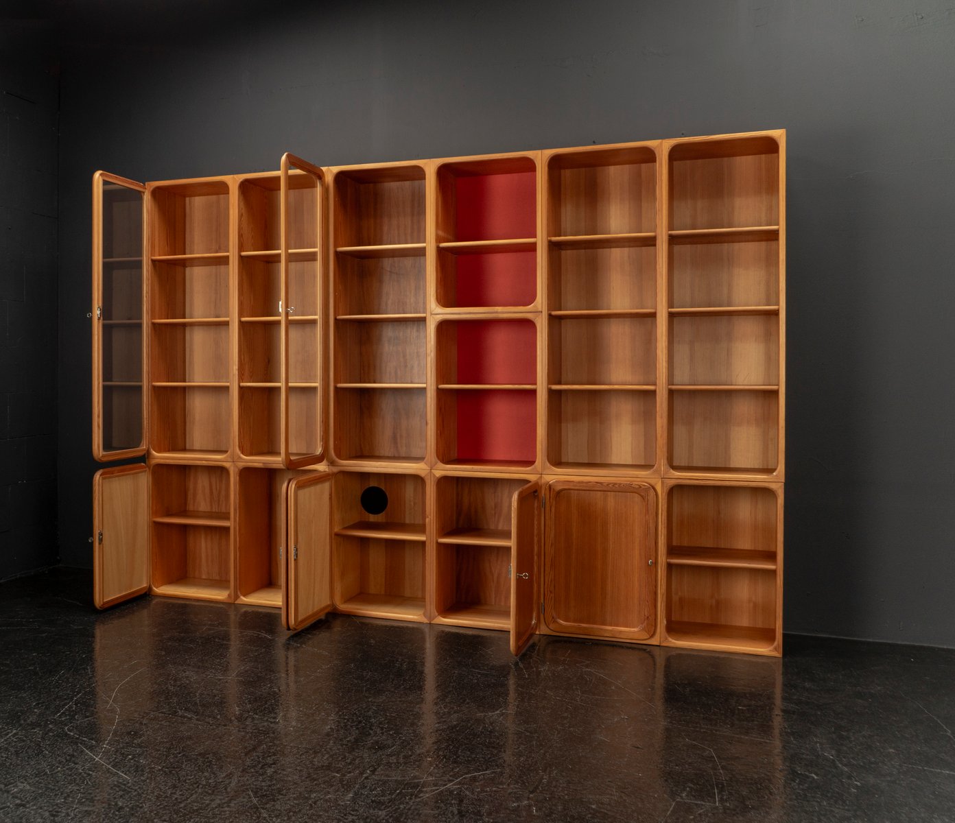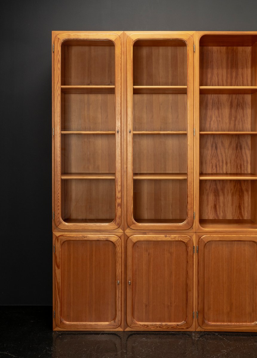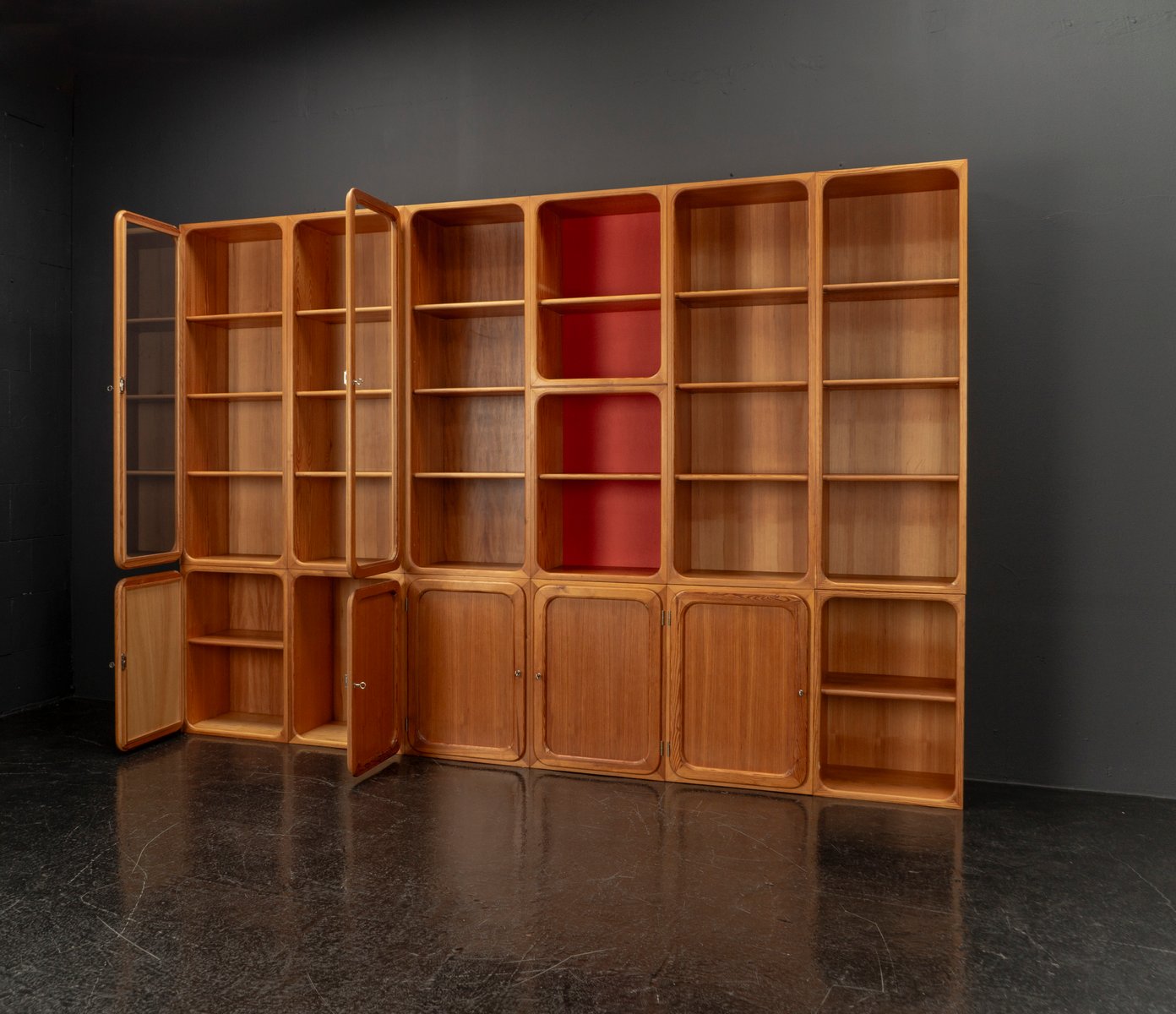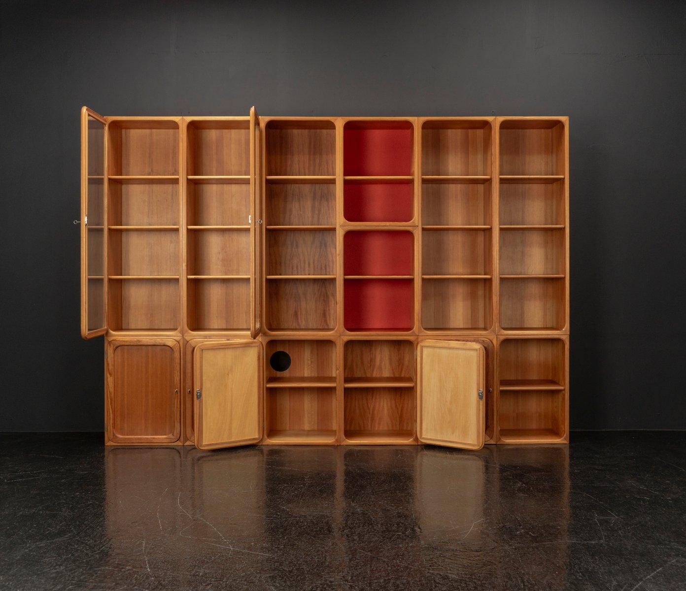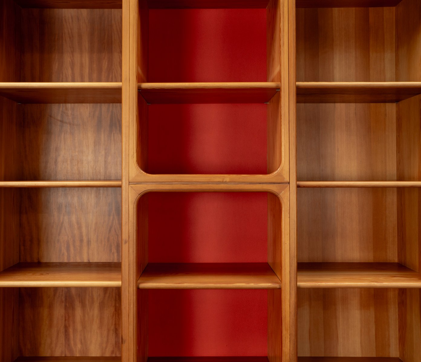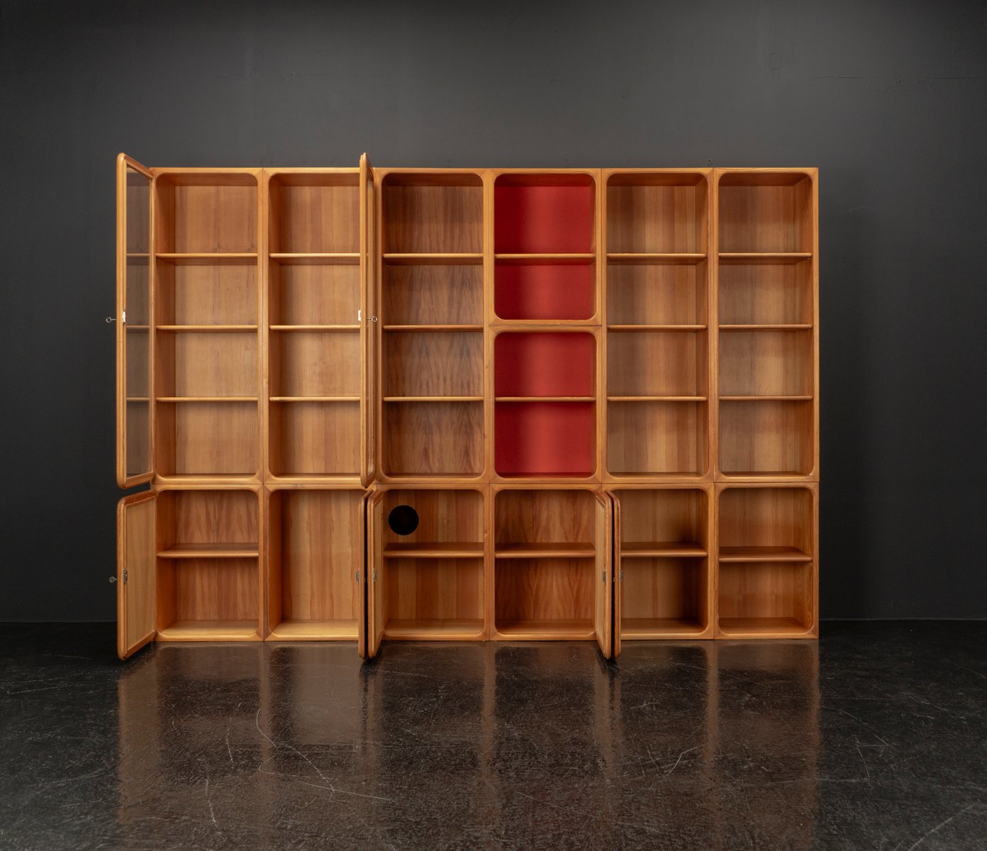This exceptional wall unit with 14 pieces from the 1960s embodies the perfect balance between functionality and refined aesthetics. Crafted from warm pine veneer with solid pine doors, it exudes natural elegance and superb craftsmanship. Its well proportioned design reveals the hand of a talented though unknown designer who created a piece of timeless beauty through harmony and subtle detail. The ensemble consists of thirteen modules that together form an impressive architectural composition. Two large elements with glass doors elegantly display objects or books, while five smaller units with wooden doors provide concealed storage. Two modules feature a vivid cinnabarred back panel, introducing a bold modernist accent, and four open units add lightness and transparency to the overall structure.