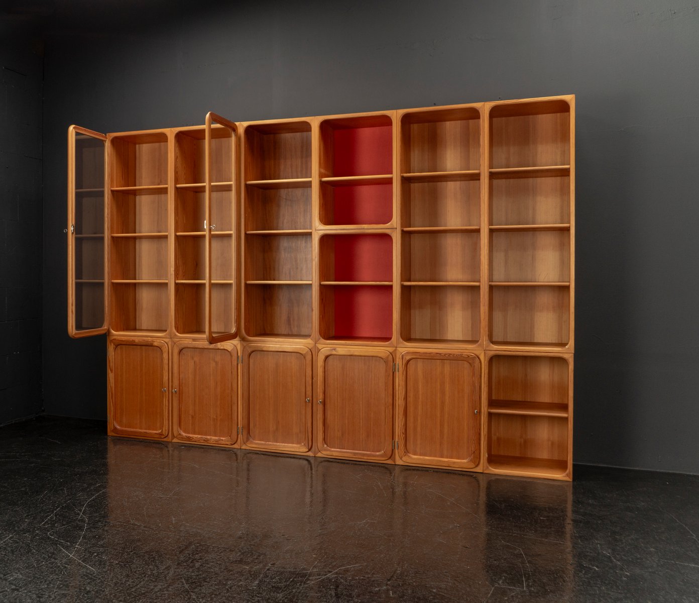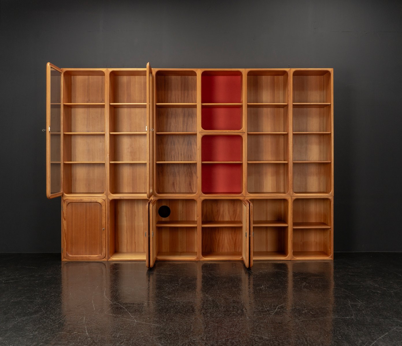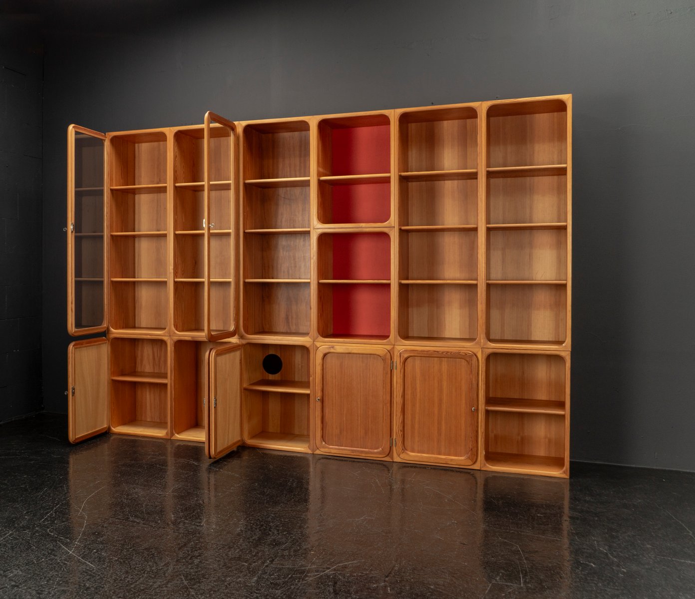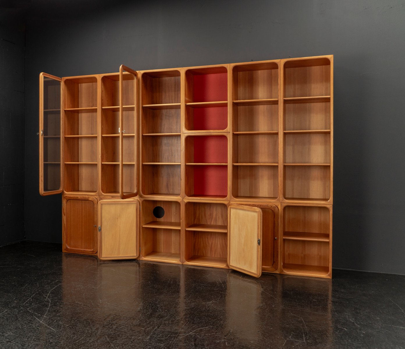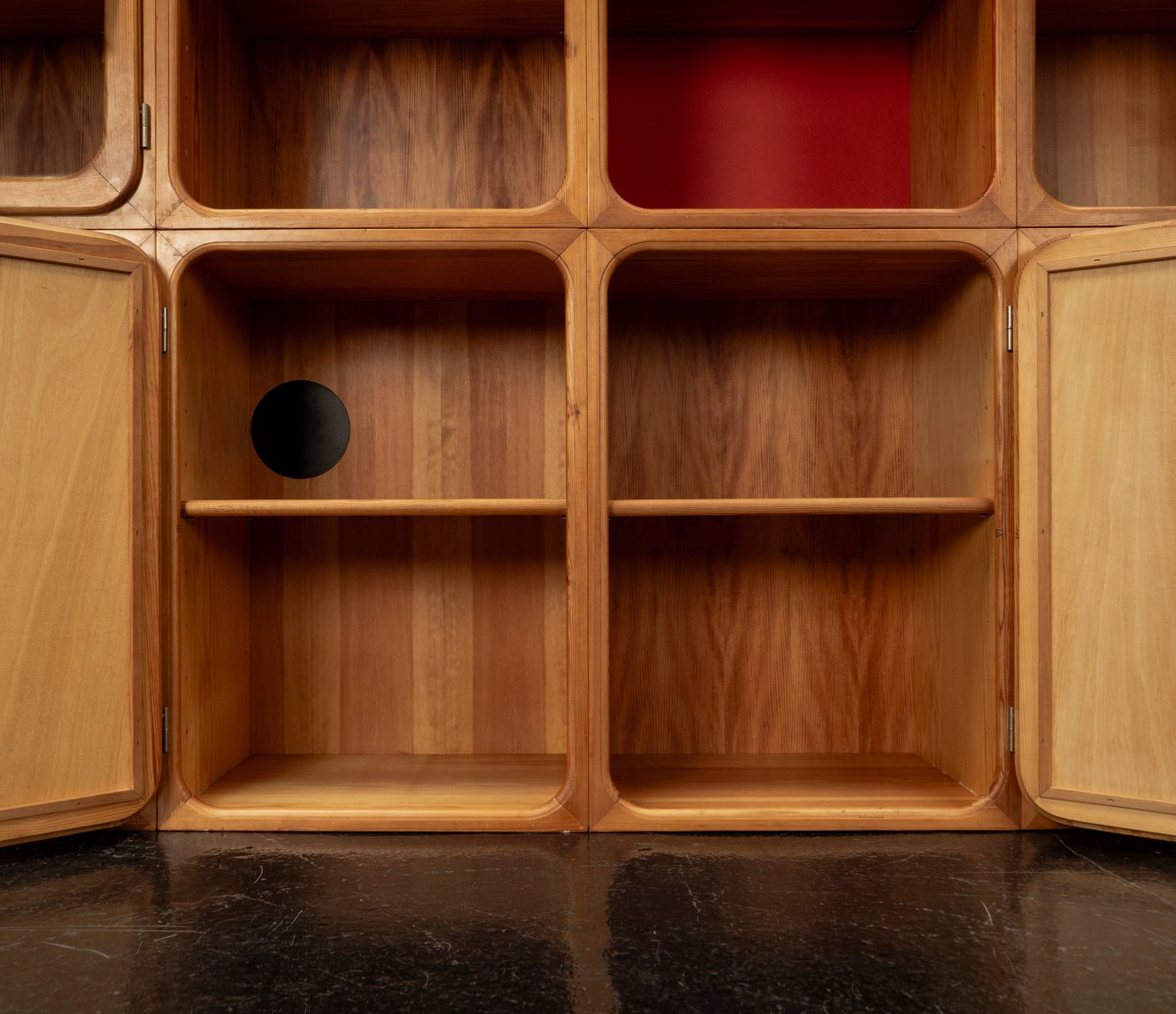 This exceptional wall unit with 14 pieces from the 1960s embodies the perfect balance between functionality and refined aesthetics. Crafted from warm pine veneer with solid pine doors, it exudes natural elegance and superb craftsmanship. Its well proportioned design reveals the hand of a talented though unknown designer who created a piece of timeless beauty through harmony and subtle detail. The ensemble consists of thirteen modules that together form an impressive architectural composition. Two large elements with glass doors elegantly display objects or books, while five smaller units with wooden doors provide concealed storage. Two modules feature a vivid cinnabarred back panel, introducing a bold modernist accent, and four open units add lightness and transparency to the overall structure.