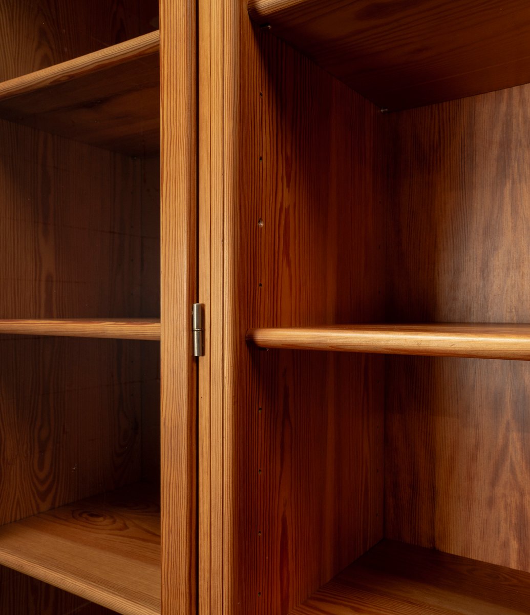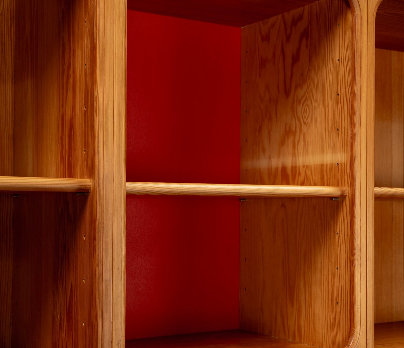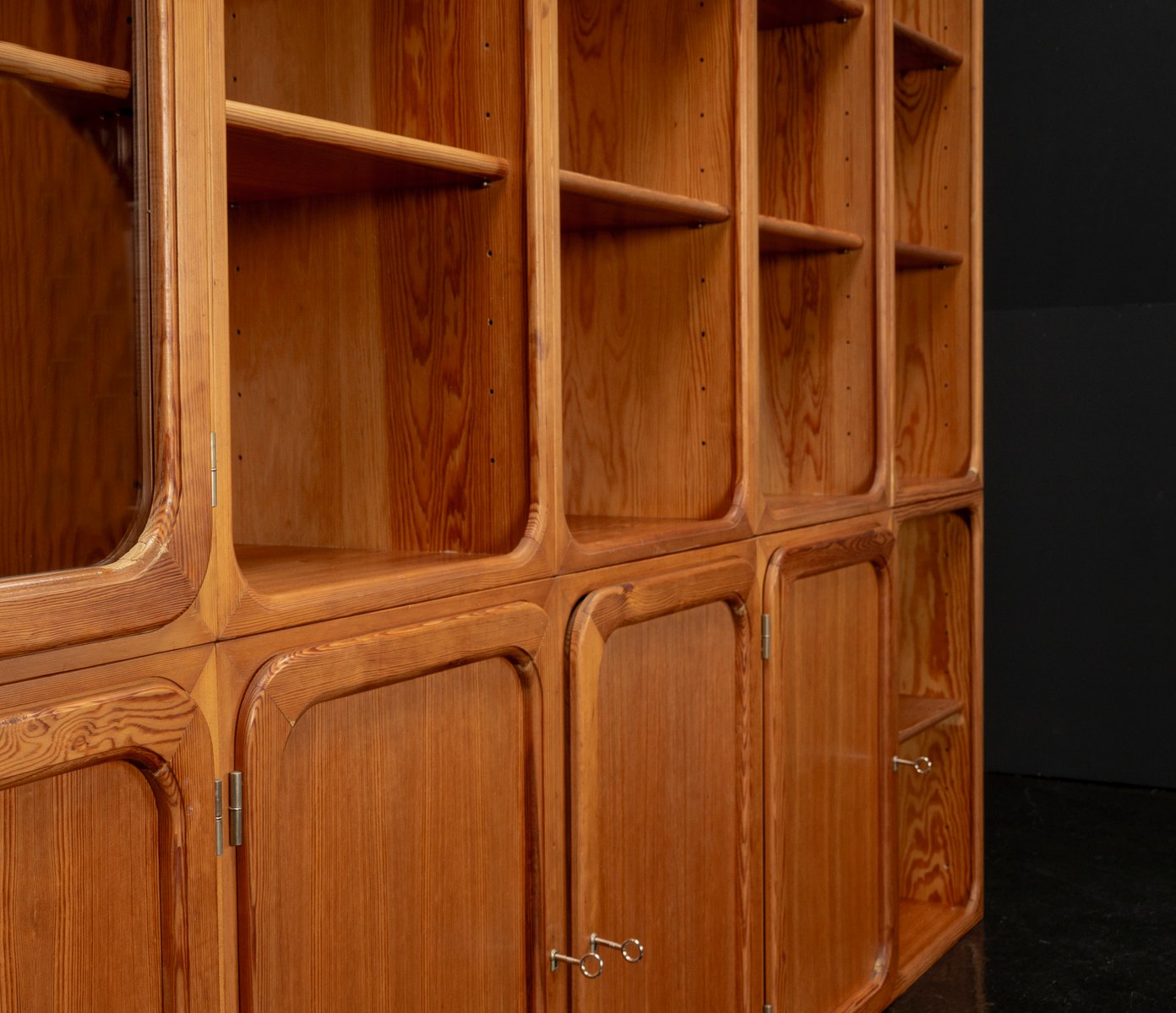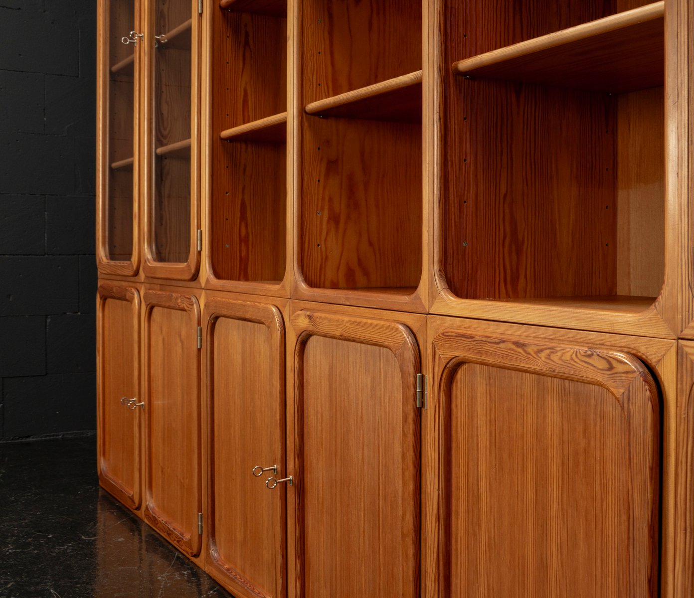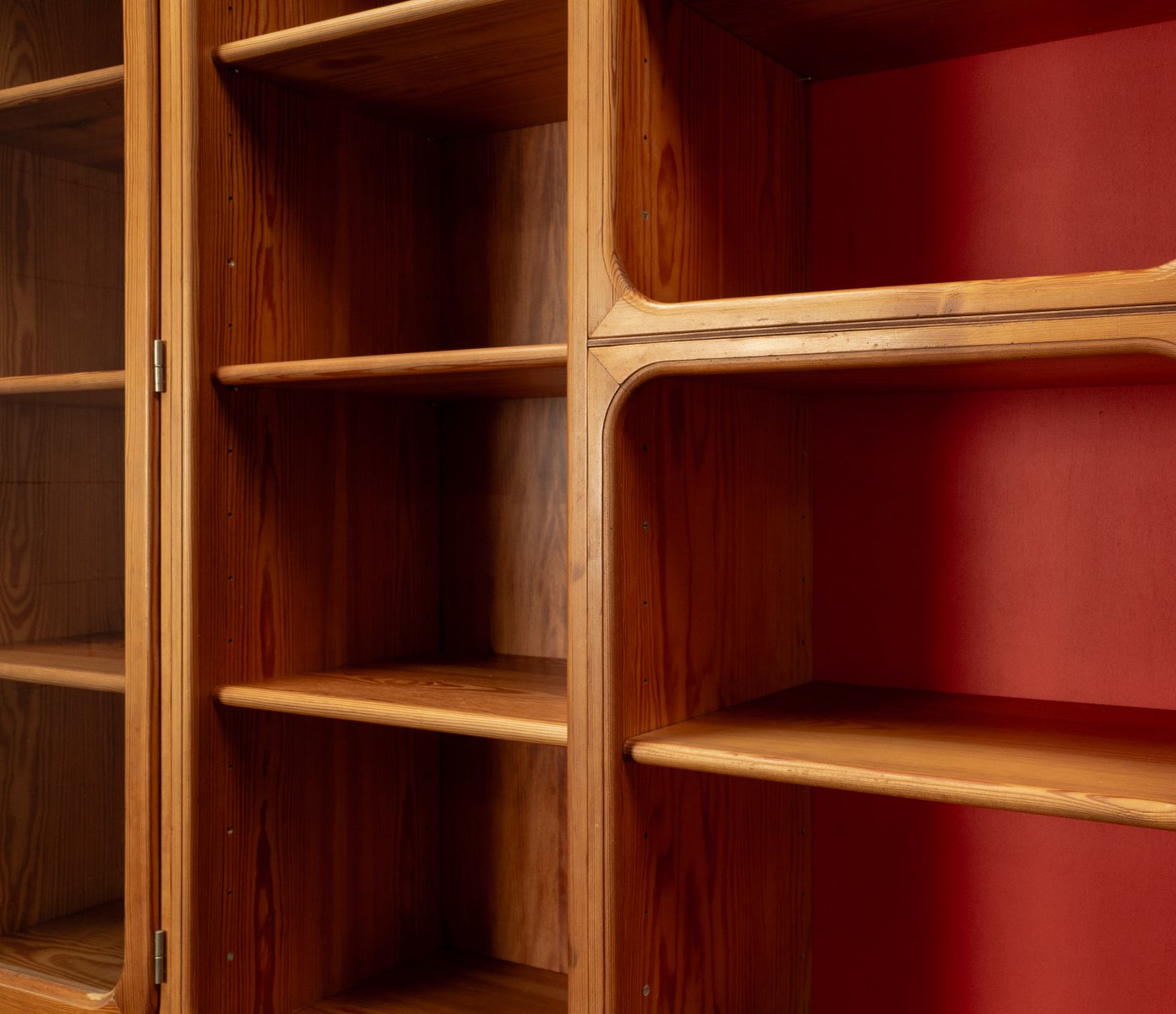 This exceptional wall unit with 14 pieces from the 1960s embodies the perfect balance between functionality and refined aesthetics. Crafted from warm pine veneer with solid pine doors, it exudes natural elegance and superb craftsmanship. Its well proportioned design reveals the hand of a talented though unknown designer who created a piece of timeless beauty through harmony and subtle detail. The ensemble consists of thirteen modules that together form an impressive architectural composition. Two large elements with glass doors elegantly display objects or books, while five smaller units with wooden doors provide concealed storage. Two modules feature a vivid cinnabarred back panel, introducing a bold modernist accent, and four open units add lightness and transparency to the overall structure.
