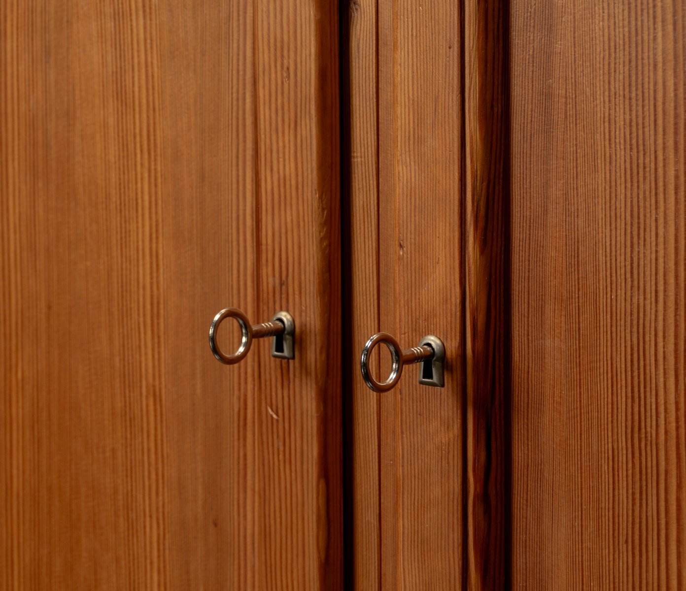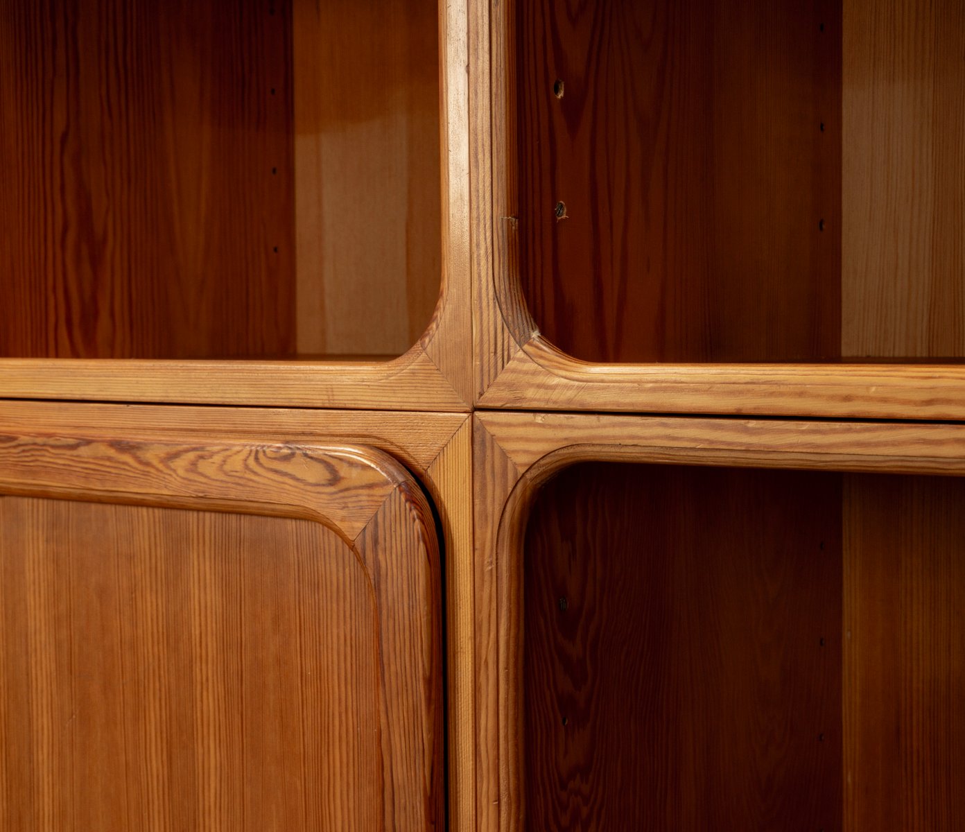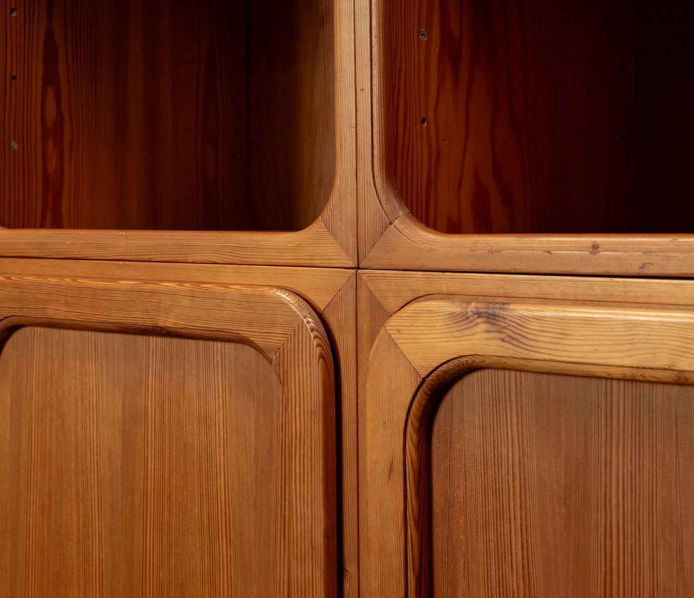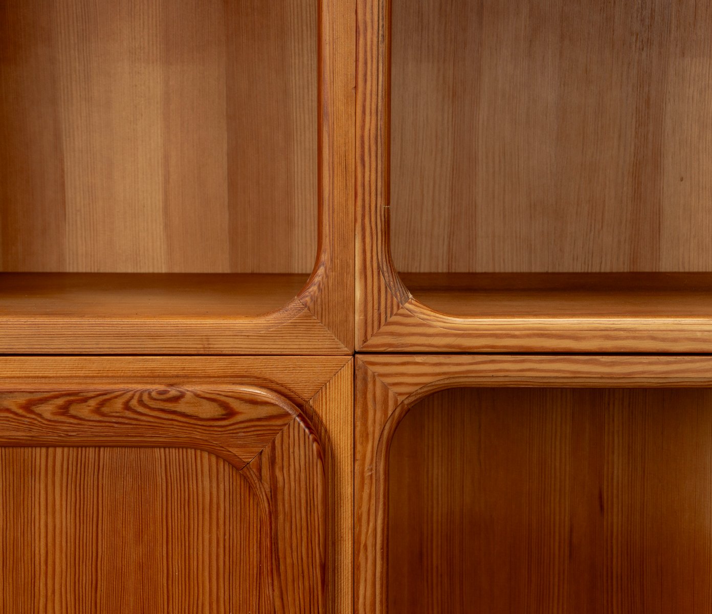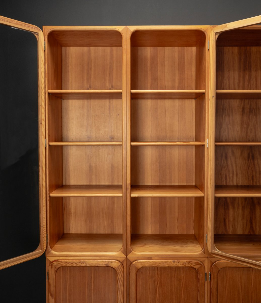This exceptional wall unit with 14 pieces from the 1960s embodies the perfect balance between functionality and refined aesthetics. Crafted from warm pine veneer with solid pine doors, it exudes natural elegance and superb craftsmanship. Its well proportioned design reveals the hand of a talented though unknown designer who created a piece of timeless beauty through harmony and subtle detail. The ensemble consists of thirteen modules that together form an impressive architectural composition. Two large elements with glass doors elegantly display objects or books, while five smaller units with wooden doors provide concealed storage. Two modules feature a vivid cinnabarred back panel, introducing a bold modernist accent, and four open units add lightness and transparency to the overall structure.