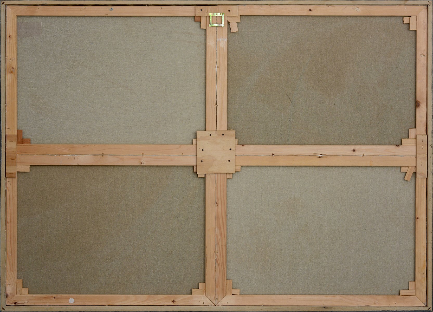 Questa straordinaria opera d'arte astratta, firmata dall'artista italiano Lucio Esposito nel 2011, è composta da quattro tele singole di 50x70 cm ciascuna, che insieme formano un'imponente composizione di 100x140 cm. Incorniciate in legno laccato blu, le dimensioni complessive raggiungono i 104x144 cm.