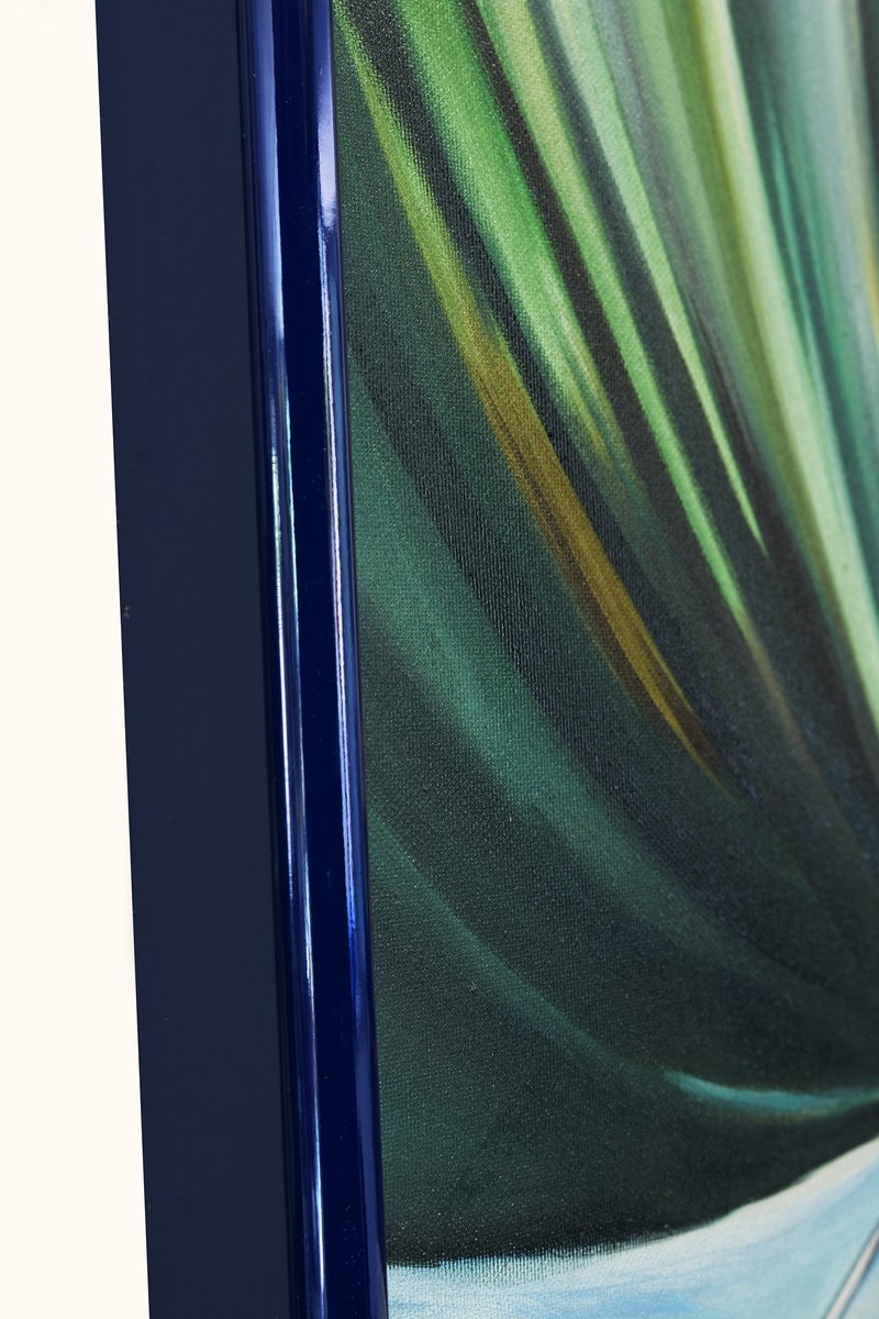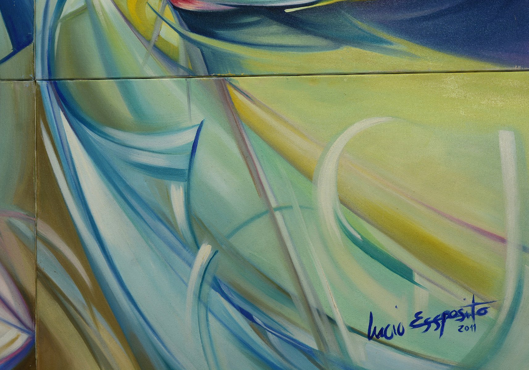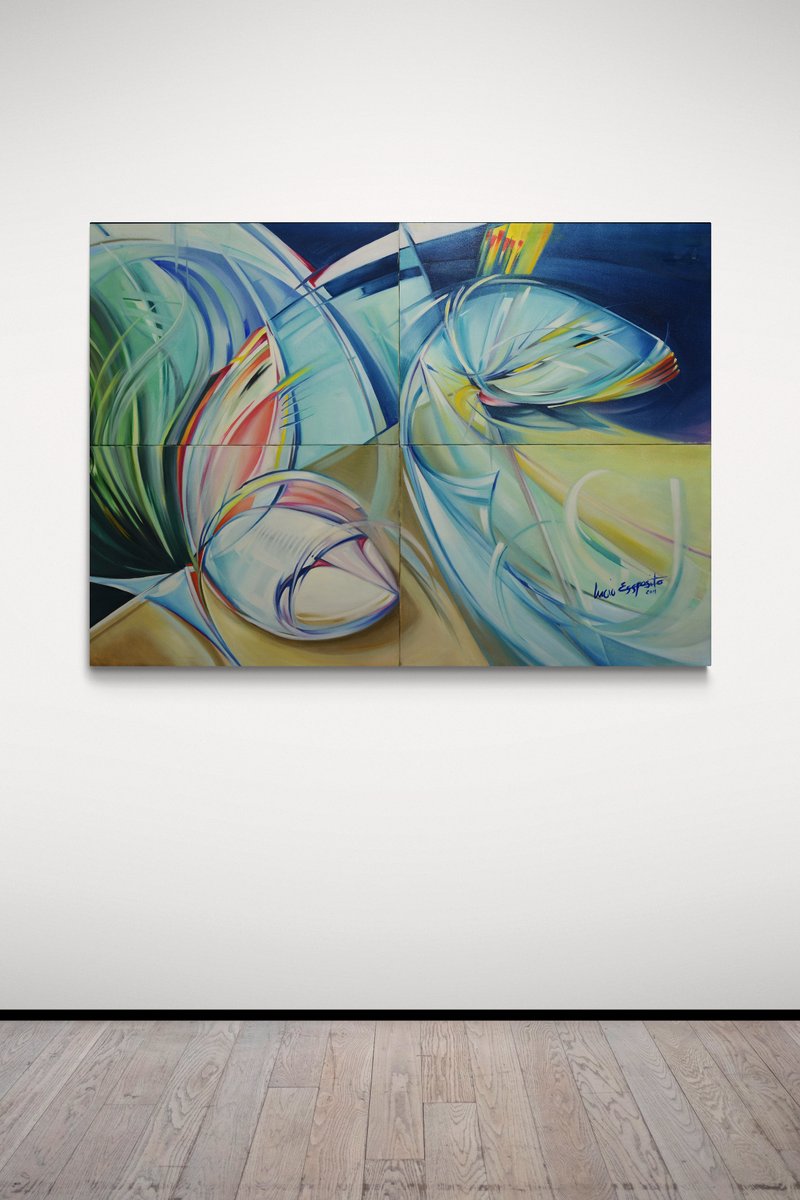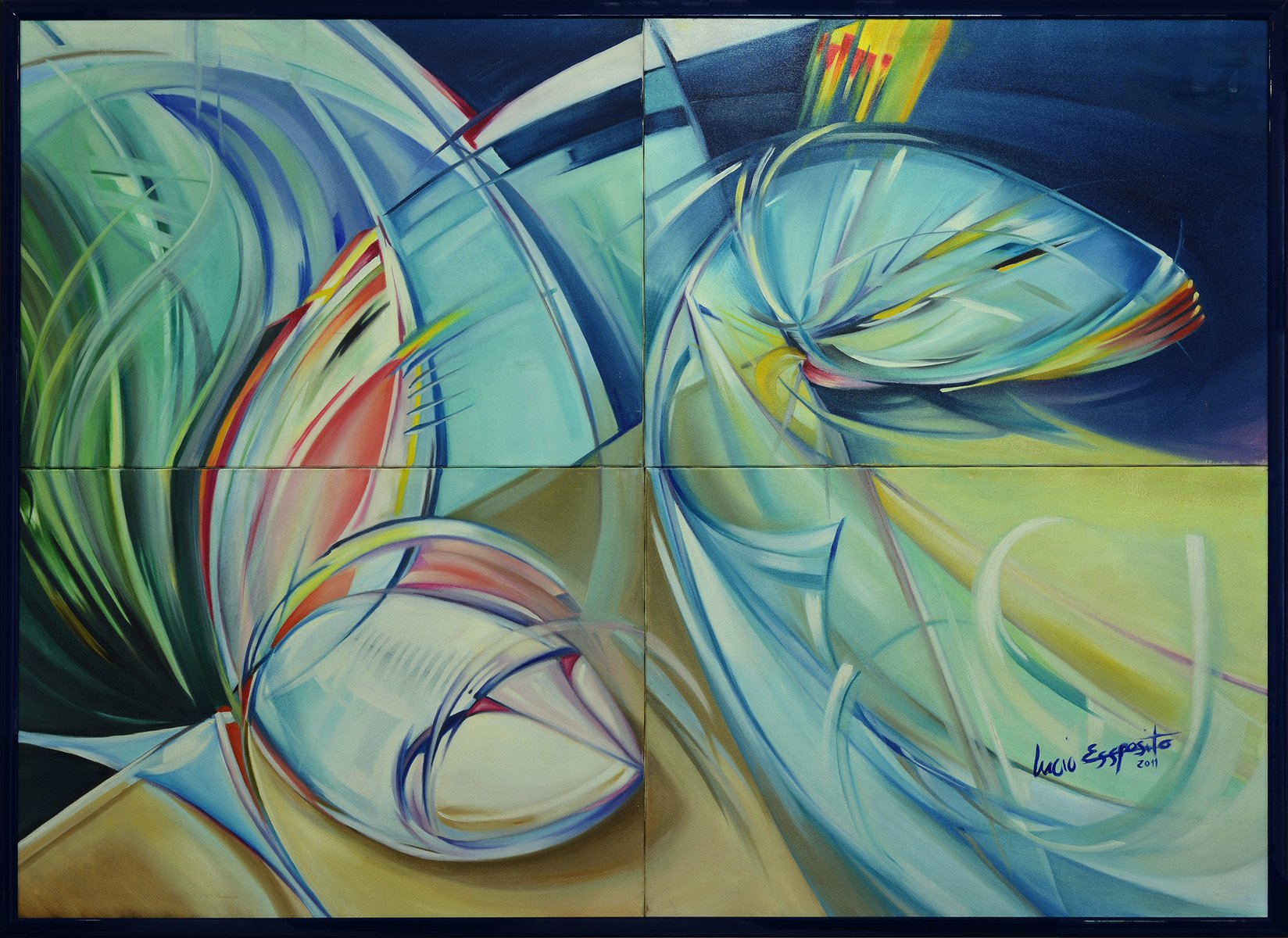 This extraordinary abstract artwork, signed by Italian artist Lucio Esposito in 2011, consists of four individual canvases measuring 50x70 cm each, which together form an impressive composition of 100x140 cm. Framed in lacquered blue wood, the overall dimensions reach 104x144 cm.