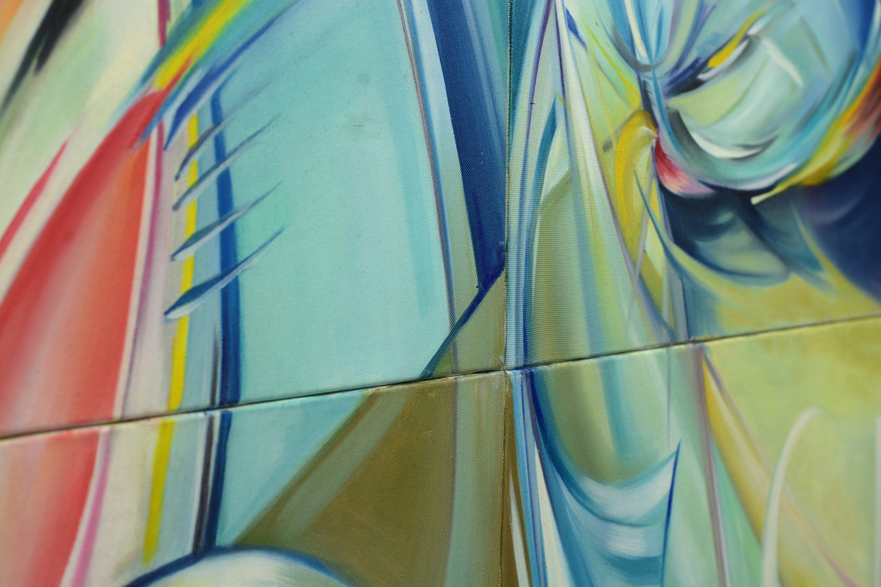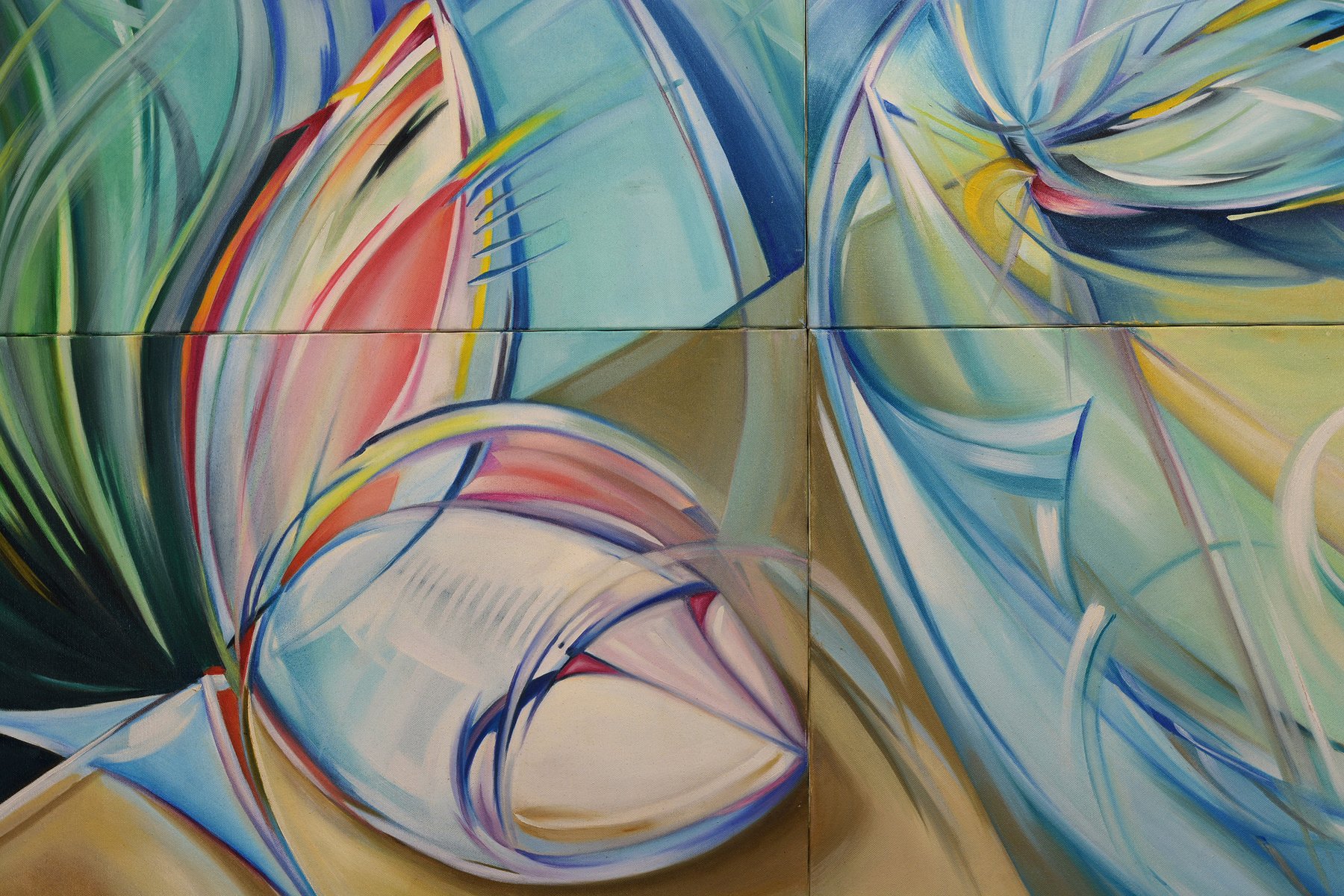 con colori vivaci e linee fluide, questa creazione moderna irradia energia e dinamismo, evocando un senso di movimento continuo. La struttura a quattro pannelli aggiunge profondità e unicità, rendendolo un pezzo di spicco perfetto per interni contemporanei e grandi spazi.