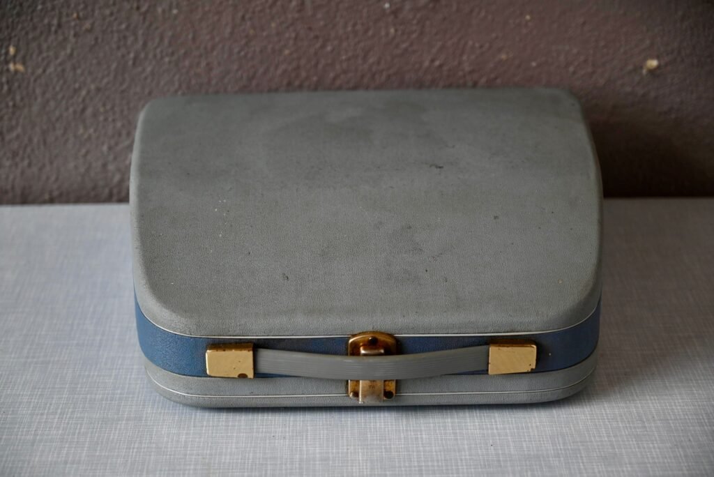 The typewriter is functional. The transport case is still present. Traces of use are visible on the plastic materials.