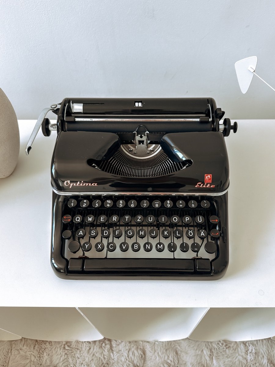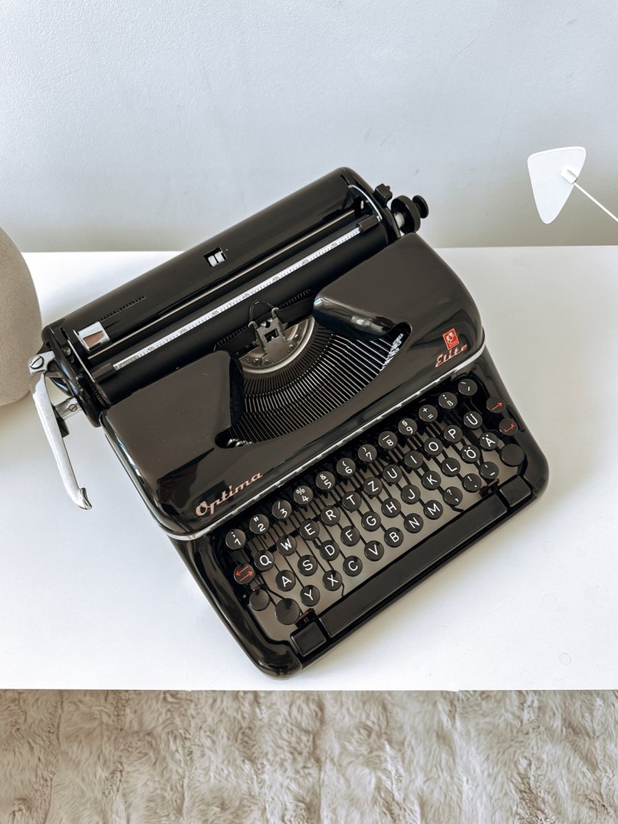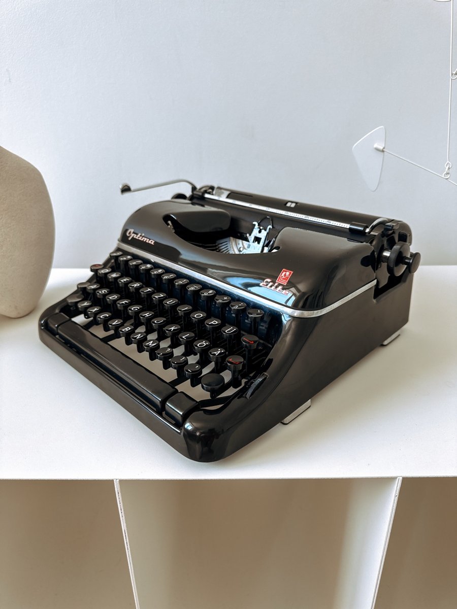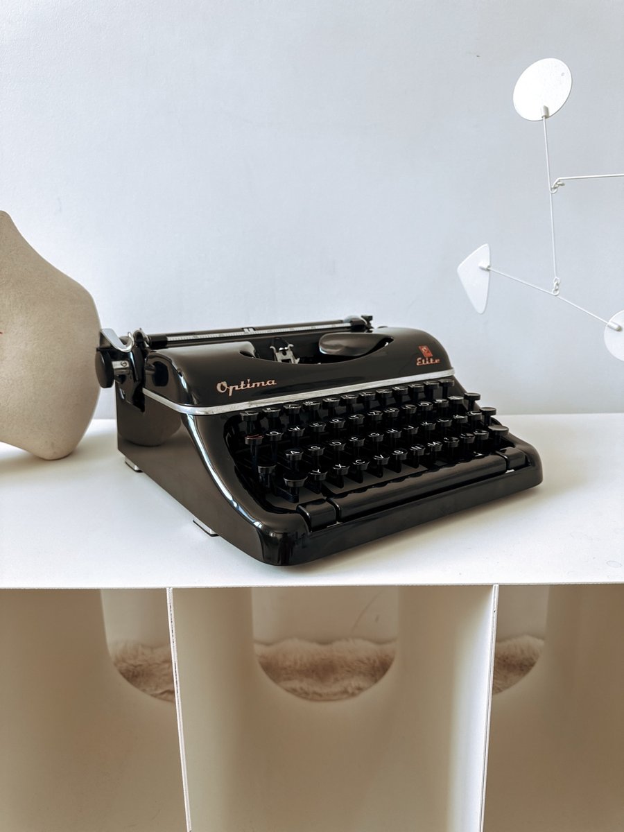 This vintage Optima Elite typewriter is more than just a writing instrument—it’s a striking design piece that instantly elevates any interior. with its glossy black enamel finish, chrome accents, and timeless silhouette, it embodies mid-century craftsmanship while adding a bold, decorative touch to a space.