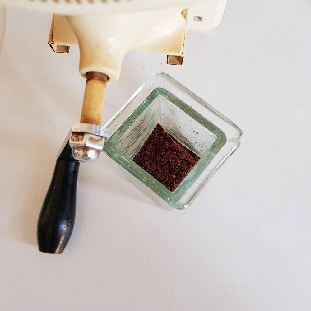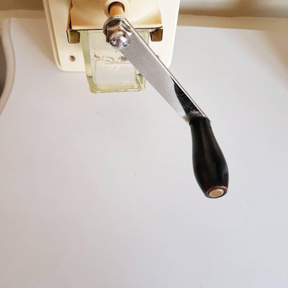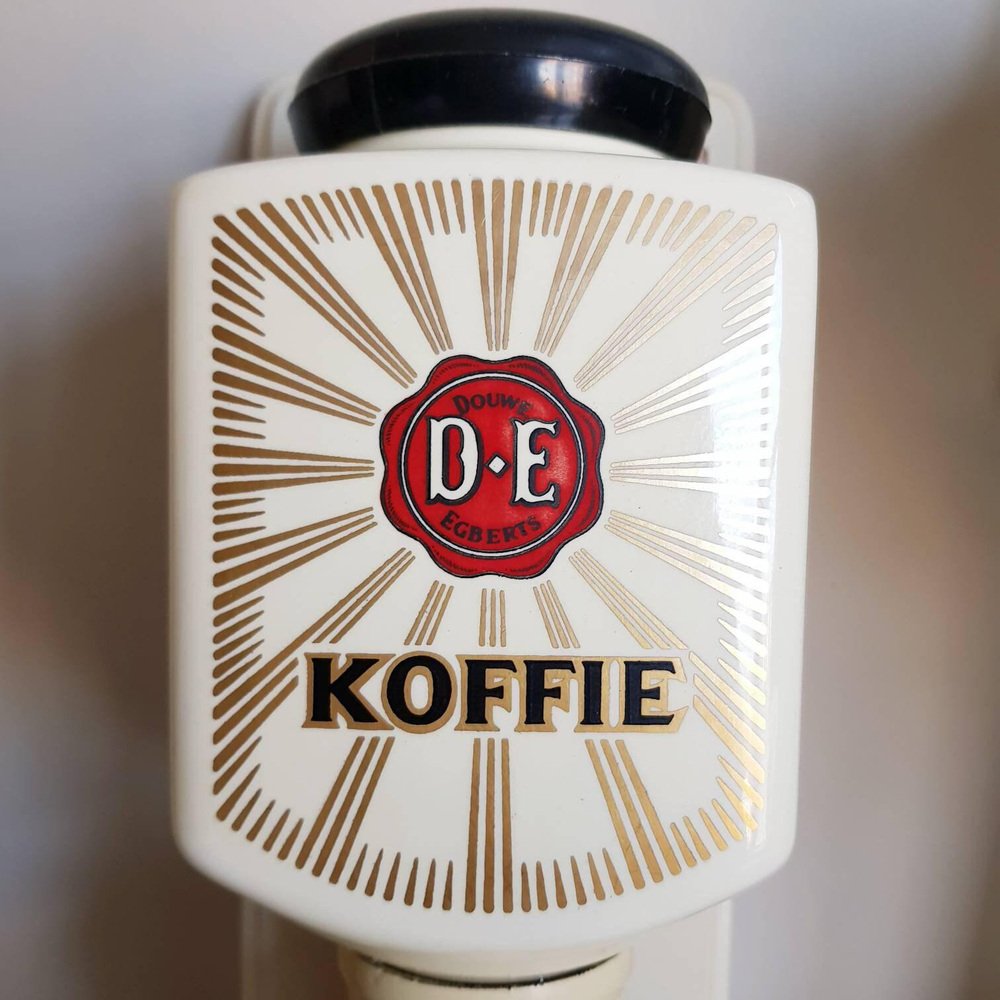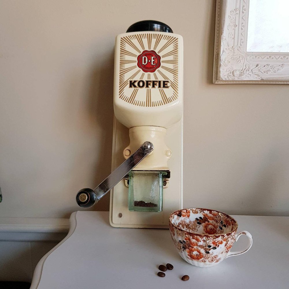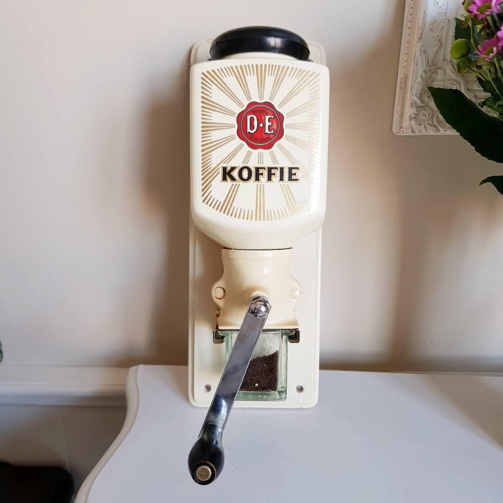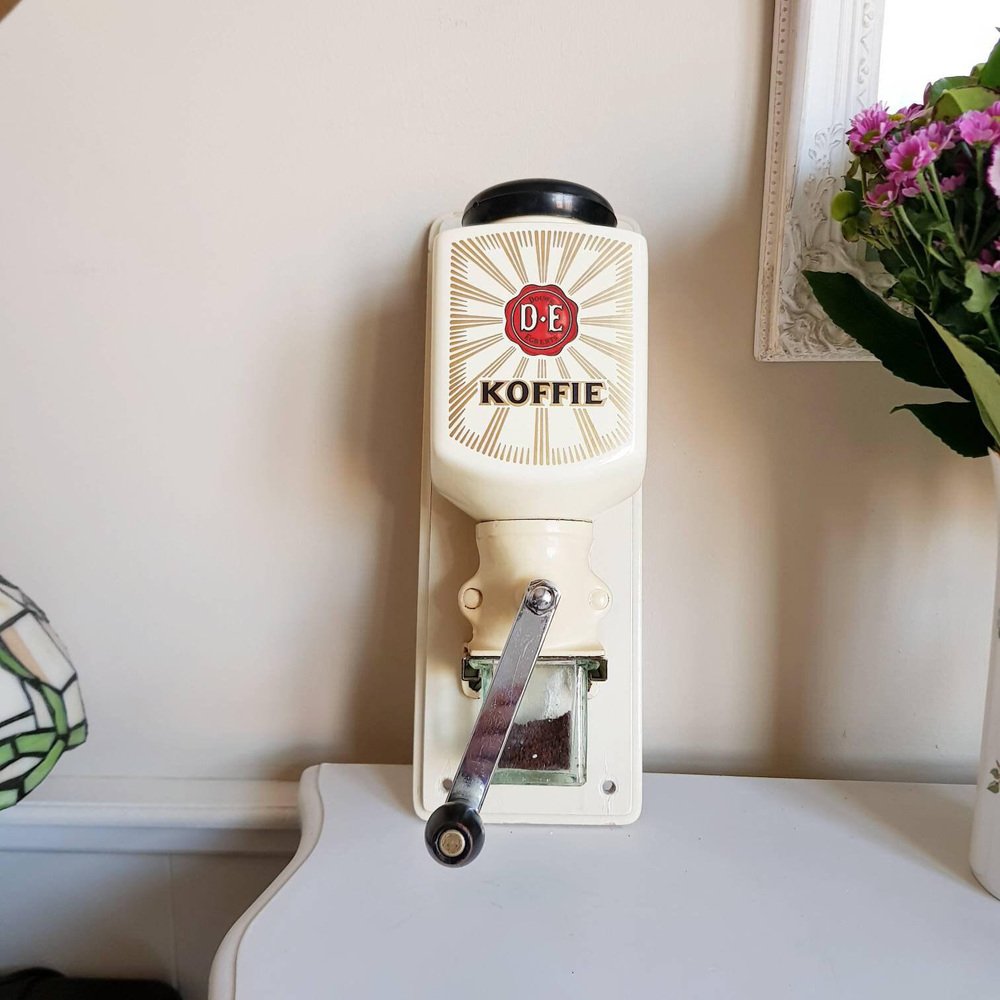 Wall coffee grinder from Douwe Egberts, original old coffee grinder, used in the 50s, from D.E (Douwe Egberts). Douwe Egberts is a famous Dutch coffee brand that started in 1753. Memorable and collectible coffee grinder. Measure: length: 33 cm / 13 Inches width: 12 cm / 4.72 Inches. Nice coffee grinder marked D.E. Made in Holland. The coffee grinder is functional and ready to be used, nice decorative for your kitchen or used also like old-fashion bar decor. As the majority of them, this coffee grinder has a ”greenway ” to create your morning coffee, relying on your own force, unlike electric grinders, which use a small dose of electricity. All the items in our shop are vintage, mostly used, also may have small manufacturing imperfections. Please take a good look at all the photos, before you purchase them, to be totally satisfied with your acquisition and for other questions, don’t hesitate to contact us. It has small damage at the container glass.