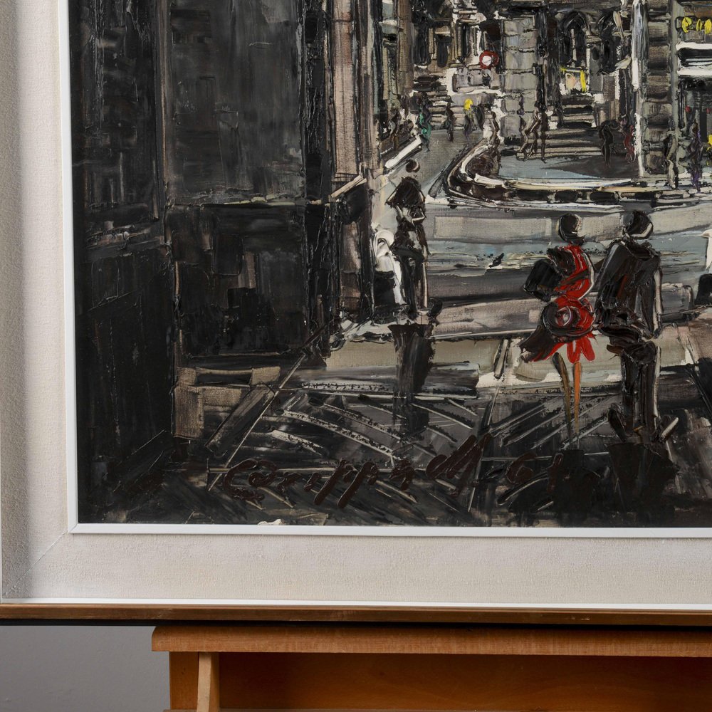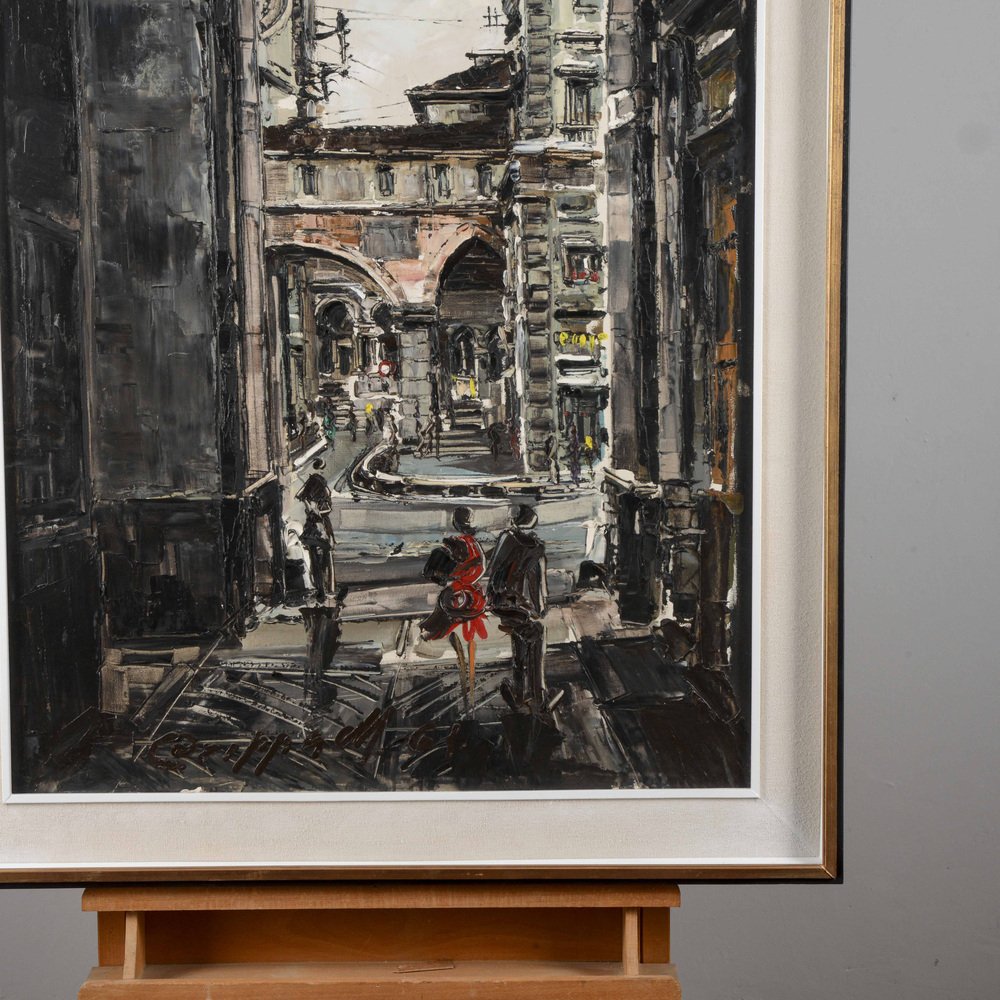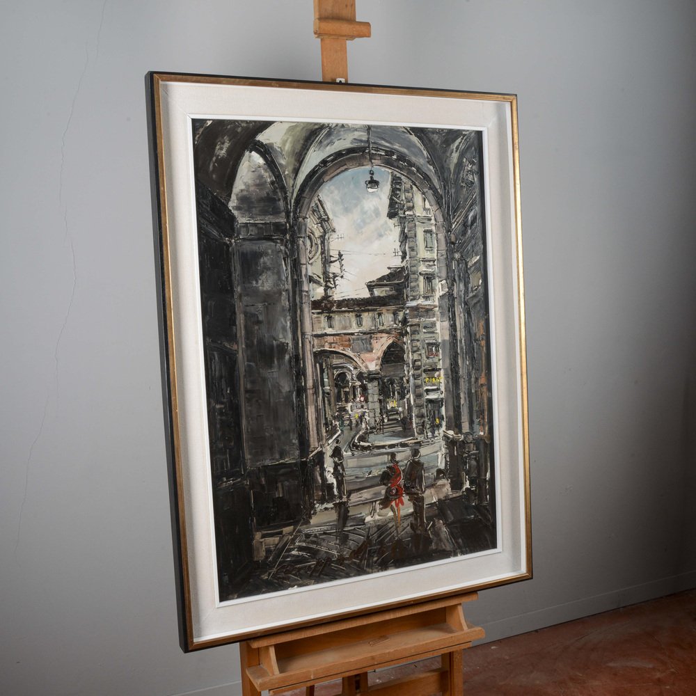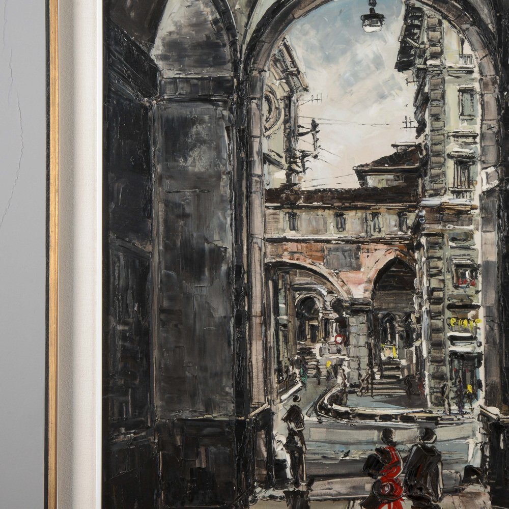 Marco Crippa, Passaggio a Milano, Veduta di Santa Margherita, Piazza Mercanti, 1961, Dipinto ad olio, Con cornice