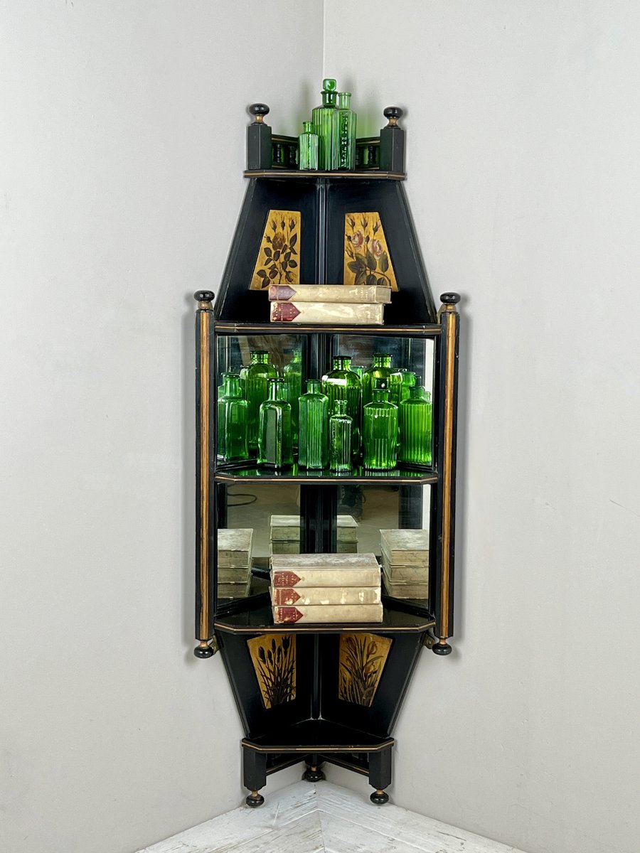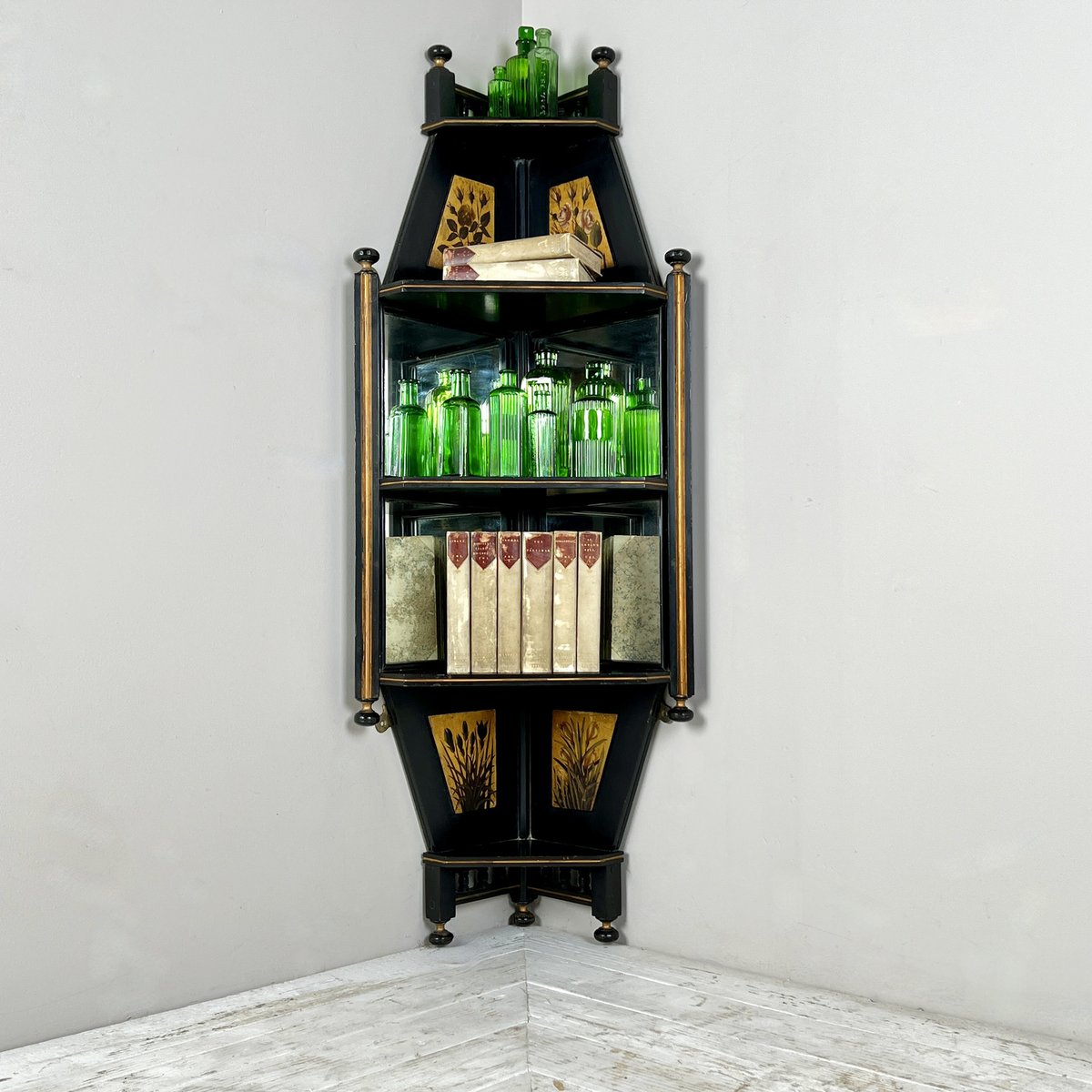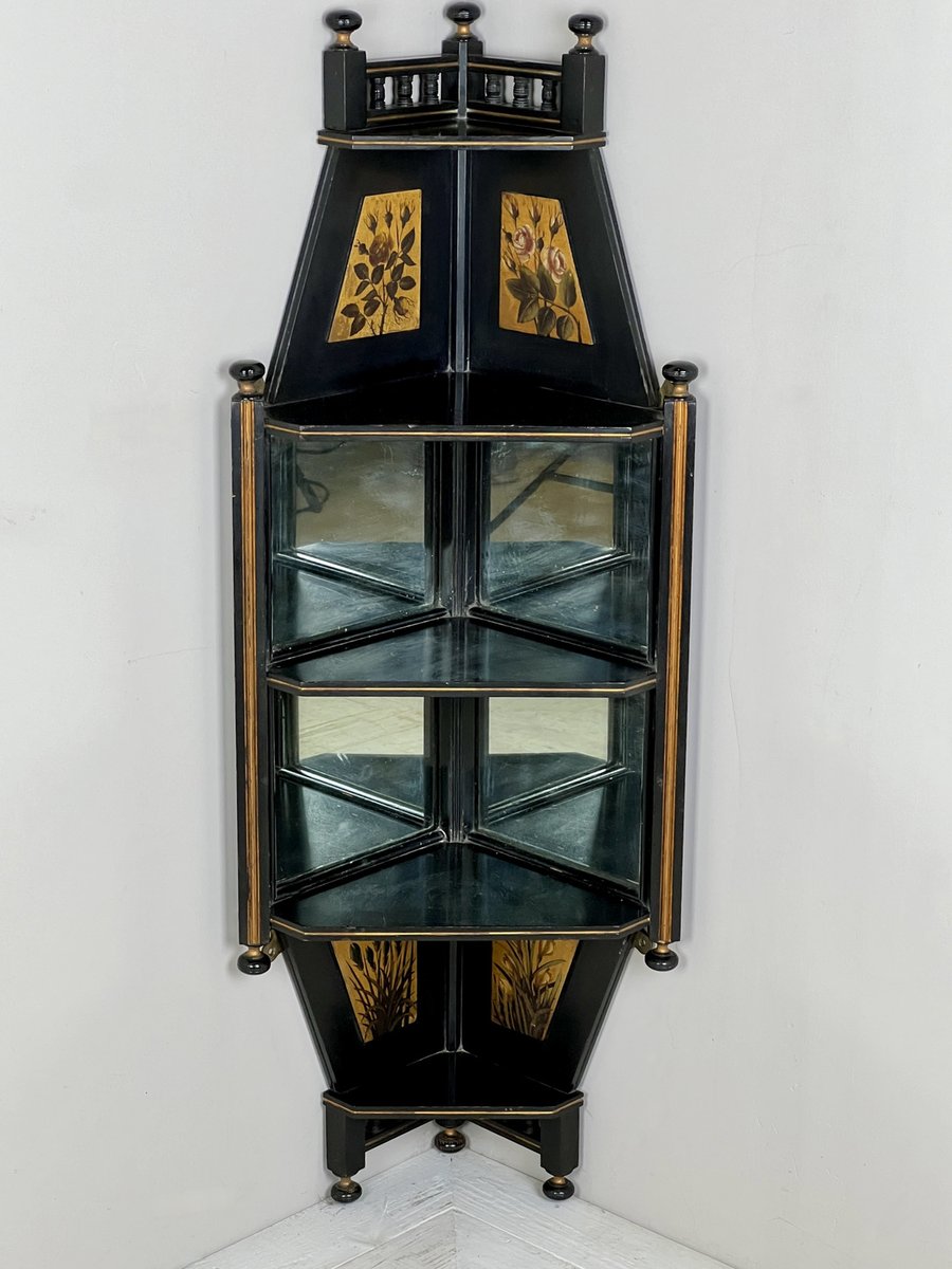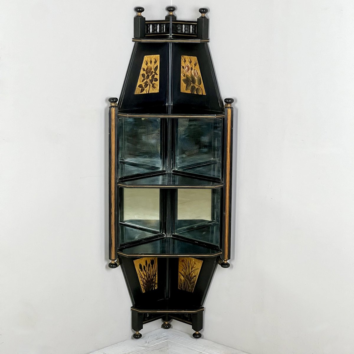 Dotato di cinque ripiani - tre centrali e due più piccoli, a galleria, con terminali decorativi torniti - offre stile e funzionalità. La sezione centrale è ornata da uno schienale a specchio, mentre i ripiani superiore e inferiore presentano pannelli floreali delicatamente dipinti a mano su uno sfondo dorato, caratteristico dell'epoca. Gli accenti scanalati e dorati lungo i lati e i frontali dei ripiani aggiungono un tocco di raffinatezza, creando un piacevole contrasto con la struttura ebanizzata.