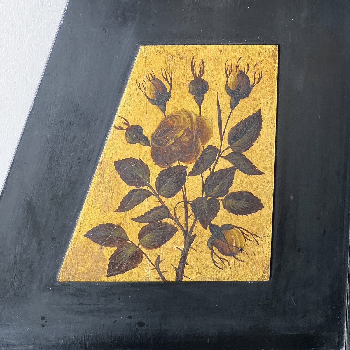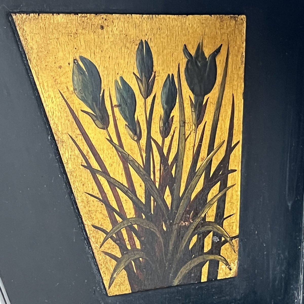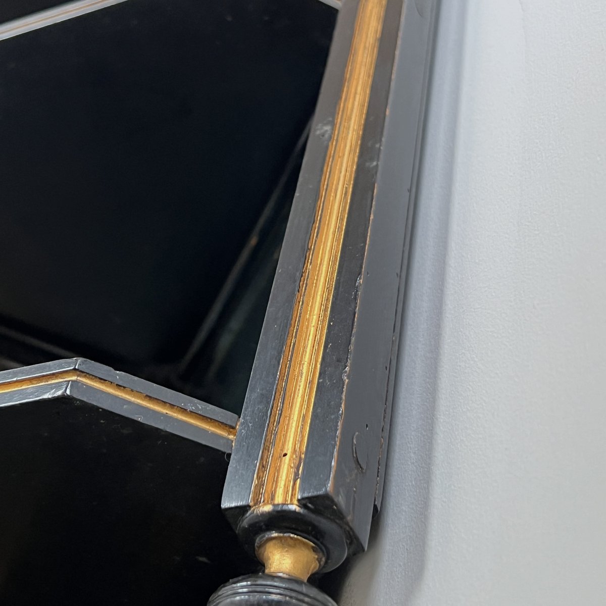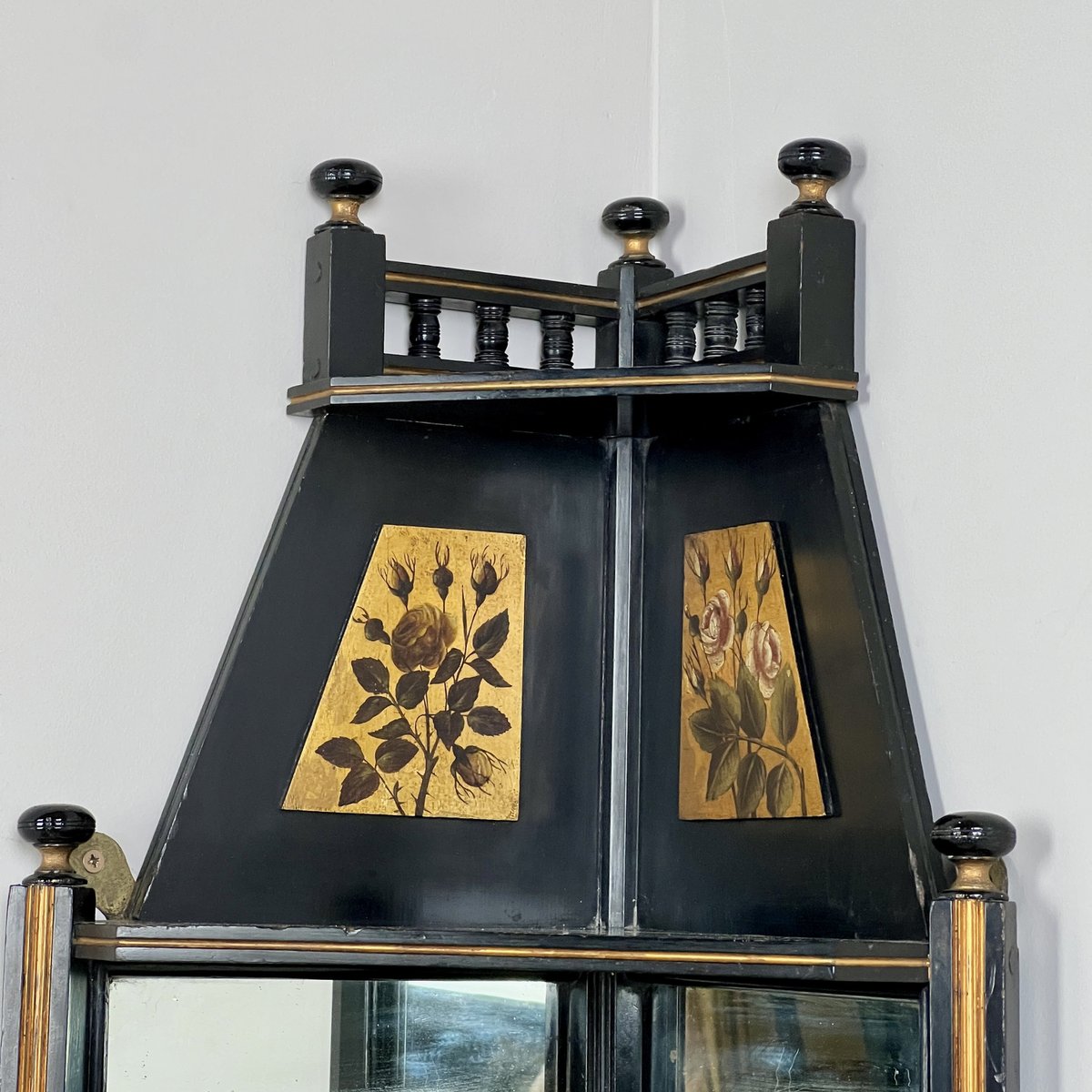 Dotato di cinque ripiani - tre centrali e due più piccoli, a galleria, con terminali decorativi torniti - offre stile e funzionalità. La sezione centrale è ornata da uno schienale a specchio, mentre i ripiani superiore e inferiore presentano pannelli floreali delicatamente dipinti a mano su uno sfondo dorato, caratteristico dell'epoca. Gli accenti scanalati e dorati lungo i lati e i frontali dei ripiani aggiungono un tocco di raffinatezza, creando un piacevole contrasto con la struttura ebanizzata.