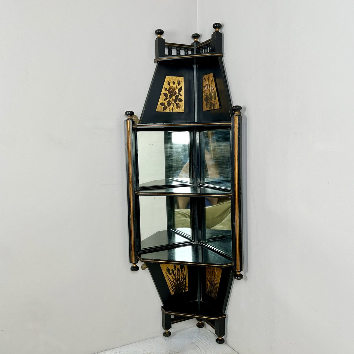 Scaffale da parete angolare ebanizzato del Movimento Estetico di fine Ottocento, in stile Eastlake