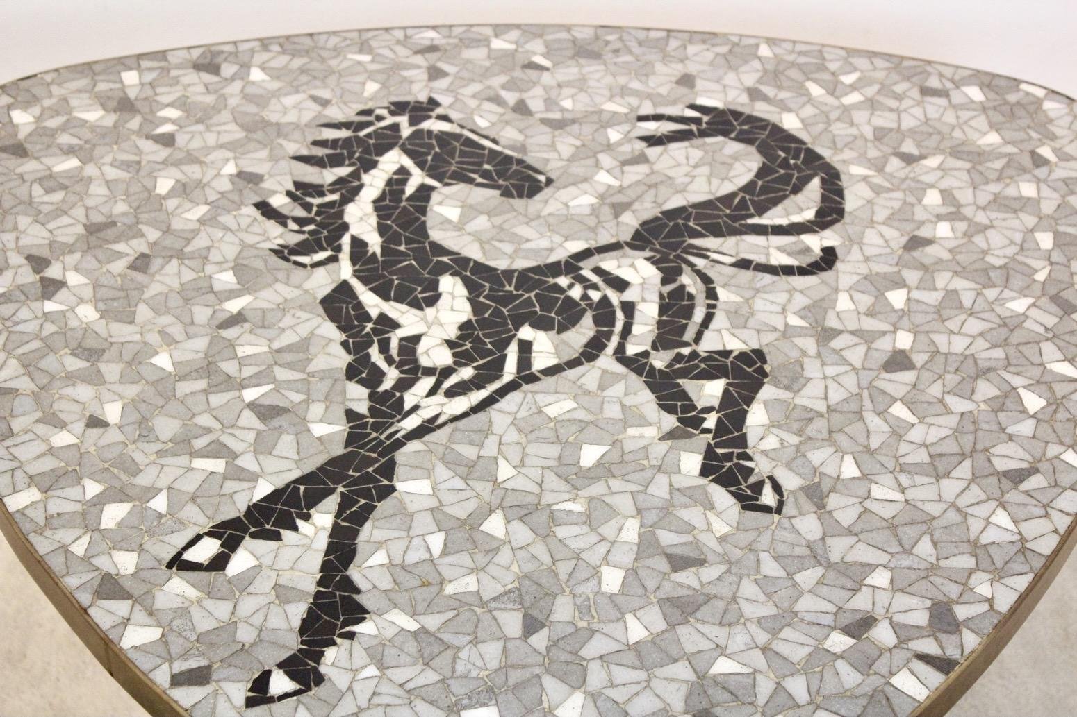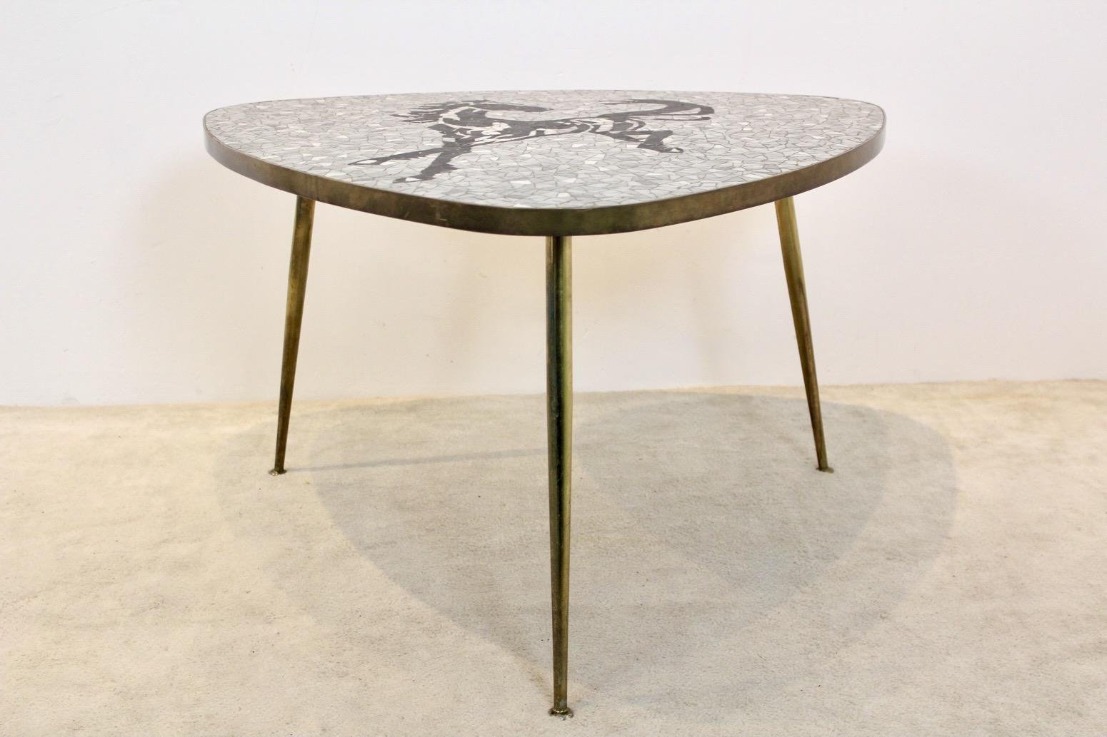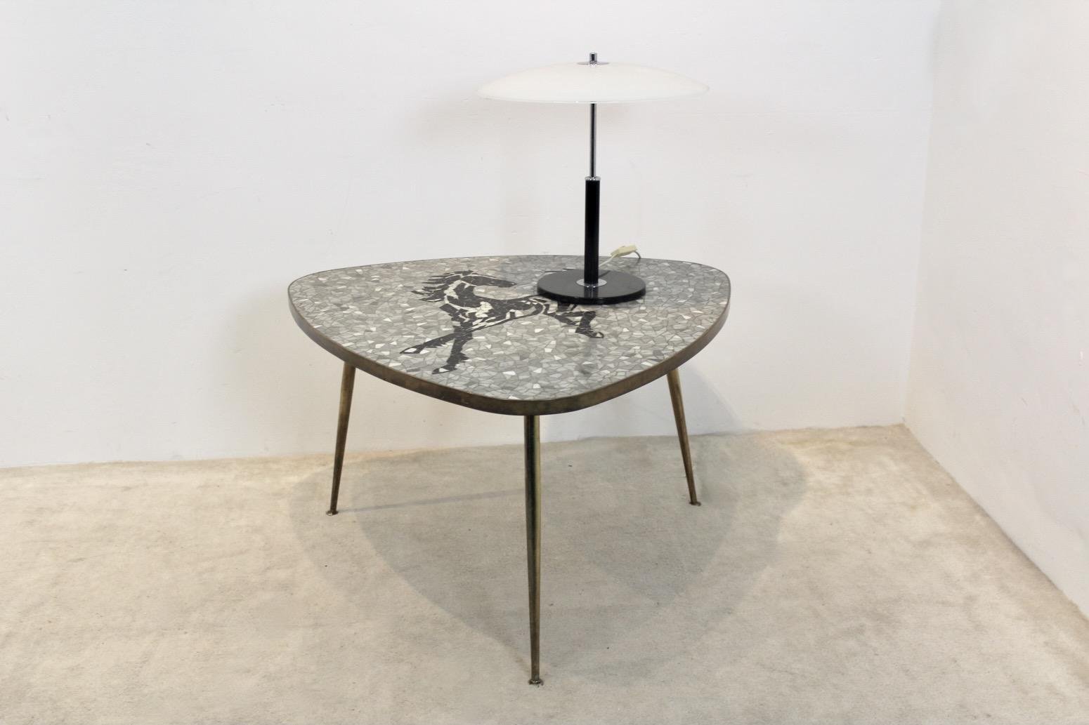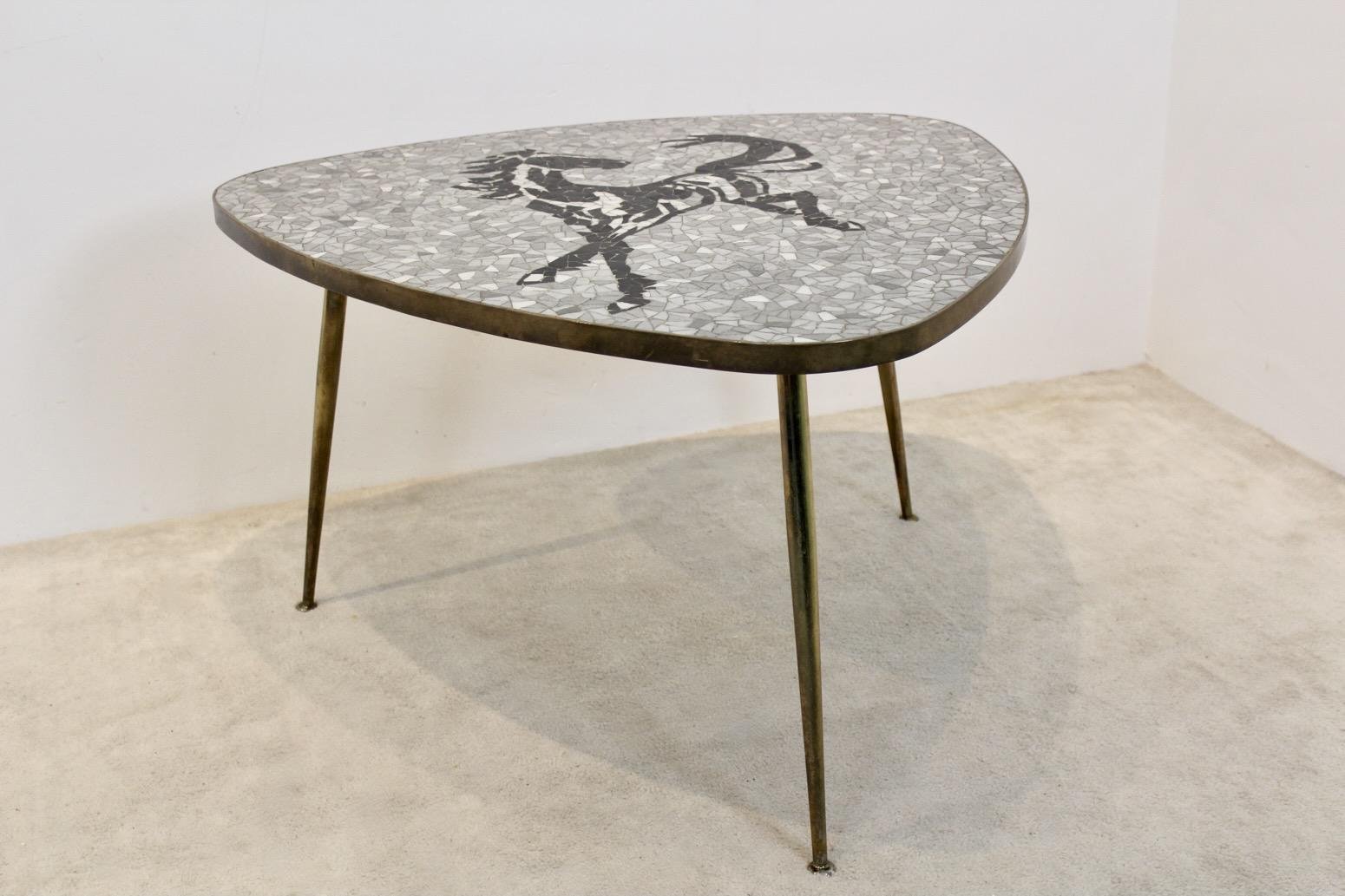 Beautiful, stylish and elegant Mosaic 1960's coffee table made by the sculptor Berthold Müller. Designed with the highest craftsmanship. A stunning mosaic pattern with the sculpture of a horse. Completed with solid brass surroundings and legs with original patina. In very good condition. Born in Oerlinghausen near Bielefeld in 1893, [ Berthold Müller, he himself added Oerlinghausen to his name later, began his studies of sculpture under Hans Perathoner at the Bielefeld College of Arts and Crafts in 1910 while still a schoolboy. Completing his grammar school education in the classical humanities in Bielefeld in 1912, he moved to Berlin in 1914 and studied at the Charlottenburg School of Applied Arts. During the First World War he was conscripted for service with cavalry regiments in Russia, Galicia and France. In 1919 he was able to continue his interrupted studies in Berlin under Hans Perathoner and Willy Jäckel. In 1922, together with his wife, Jenny Wiegmann, he converted to Catholicism at the Abbey of Maria Laach. During the 1920s he devoted himself to religious art. In 1933 he organized, and took part in, the Catholic section of the Exhibition of Ecclesiastical Art during the World’s Fair in Chicago. From then on he spent the summer months mainly in Kressbronn on Lake Constance. In 1936 he founded a mosaic workshop in Berlin. His studio, mosaic workshop and apartment in Berlin were destroyed in an air raid in 1944. After 1945 Berthold Müller-Oerlinghausen made important contributions to a revival of the cultural life of the communities on Lake Constance: the rebuilding of his mosaic workshop in Kressbronn in 1946, exhibitions in the Municipal Museum of Lindau, the founding in 1947 of the “Upper Swabian Secession” (renamed “Secession of Upper Swabia/Lake Constance” in 1950), the founding of the “Artists’ Society of the Town and District of Lindau” (renamed “Lindau Art Patrons’ Society” in 1956), solo exhibitions at the Wessenberg Haus in Constance and elsewhere, a retrospective exhibition at the Municipal Museum of Lindau in 1963 marking his 70th birthday. A monograph of the work of Berthold Müller-Oerlinghausen, written by Ulrich Gertz, was published in 1974. Berthold Müller-Oerlinghausen died in Kressbronn in 1979, too soon to receive the planned honorary title of professor from the State of Baden-Württemberg.