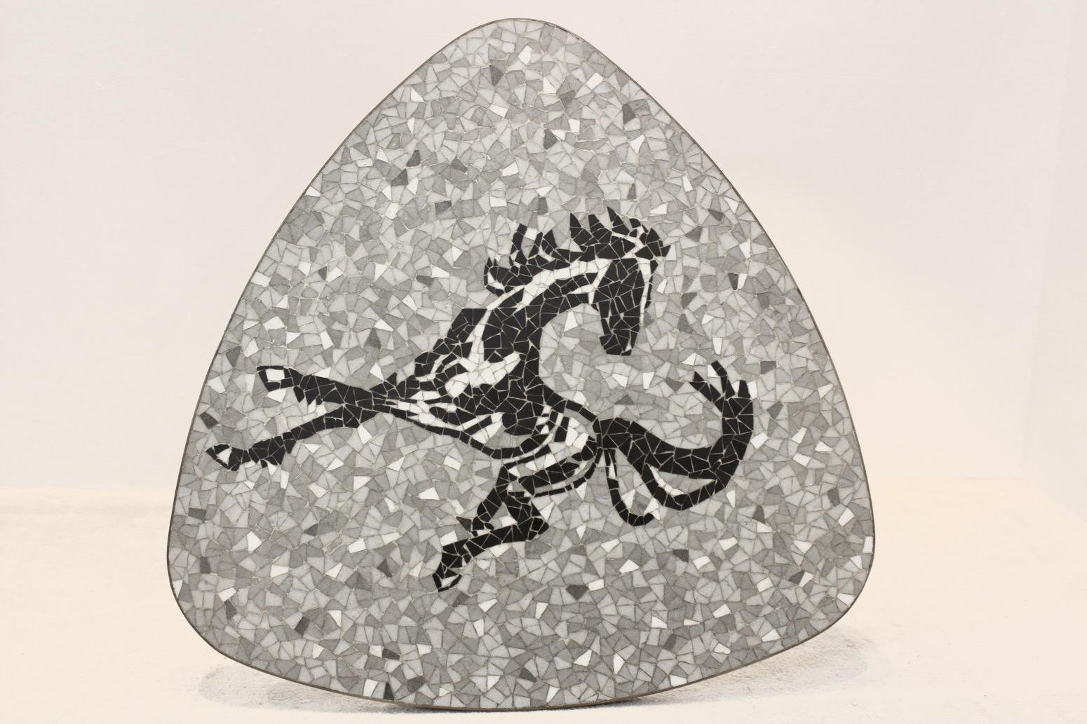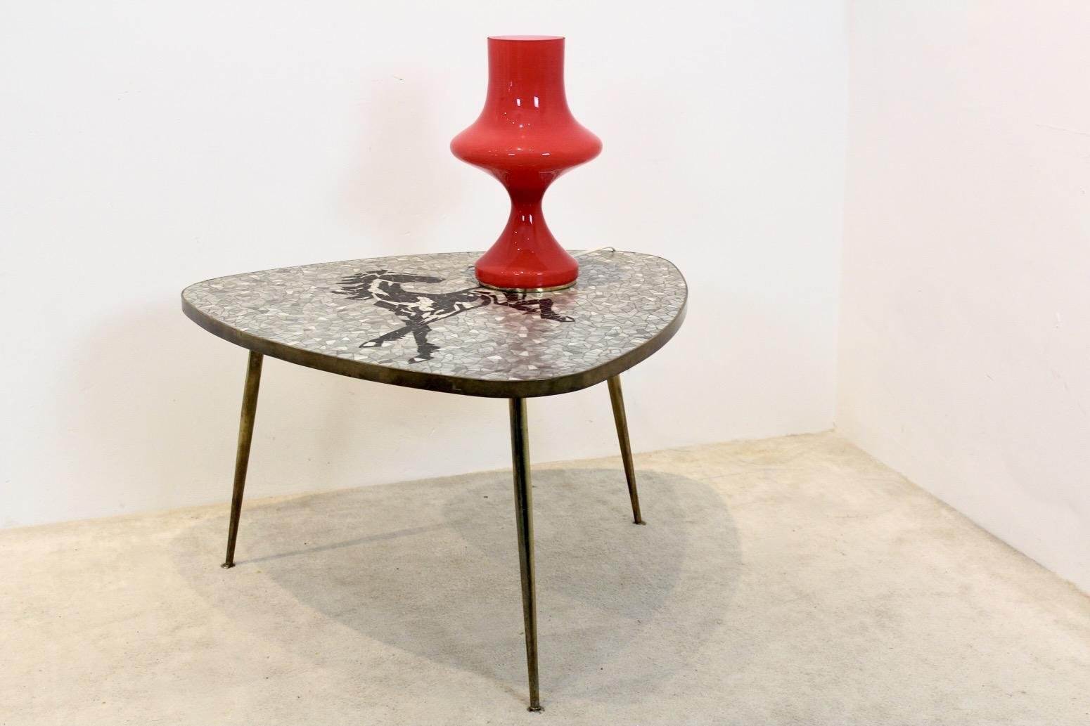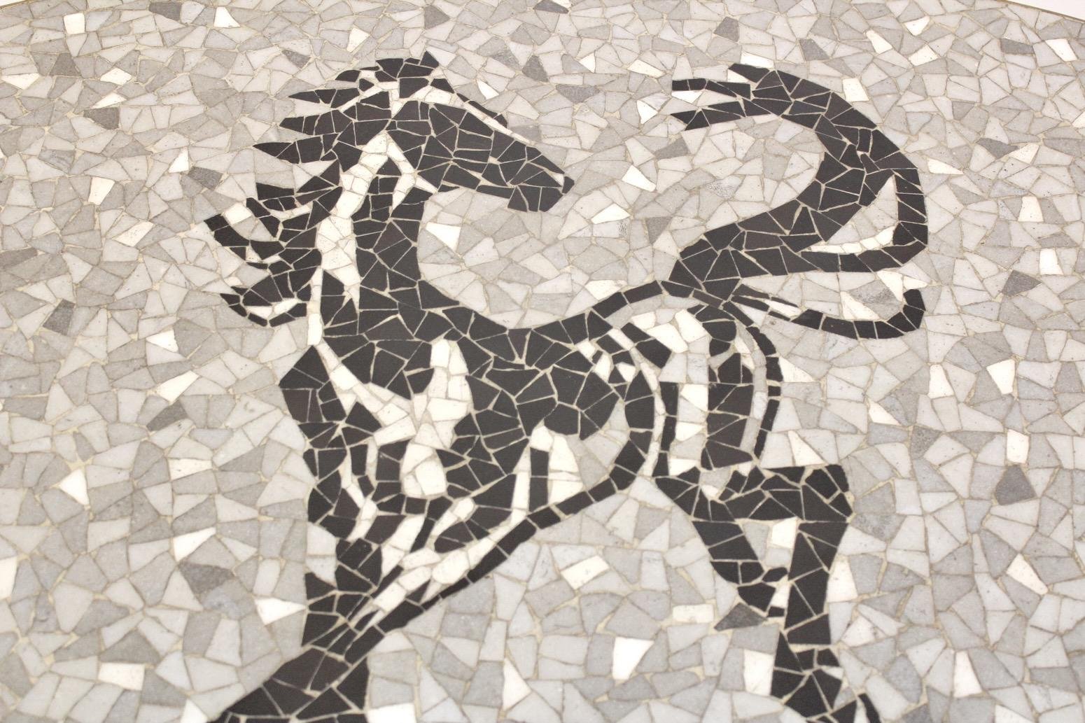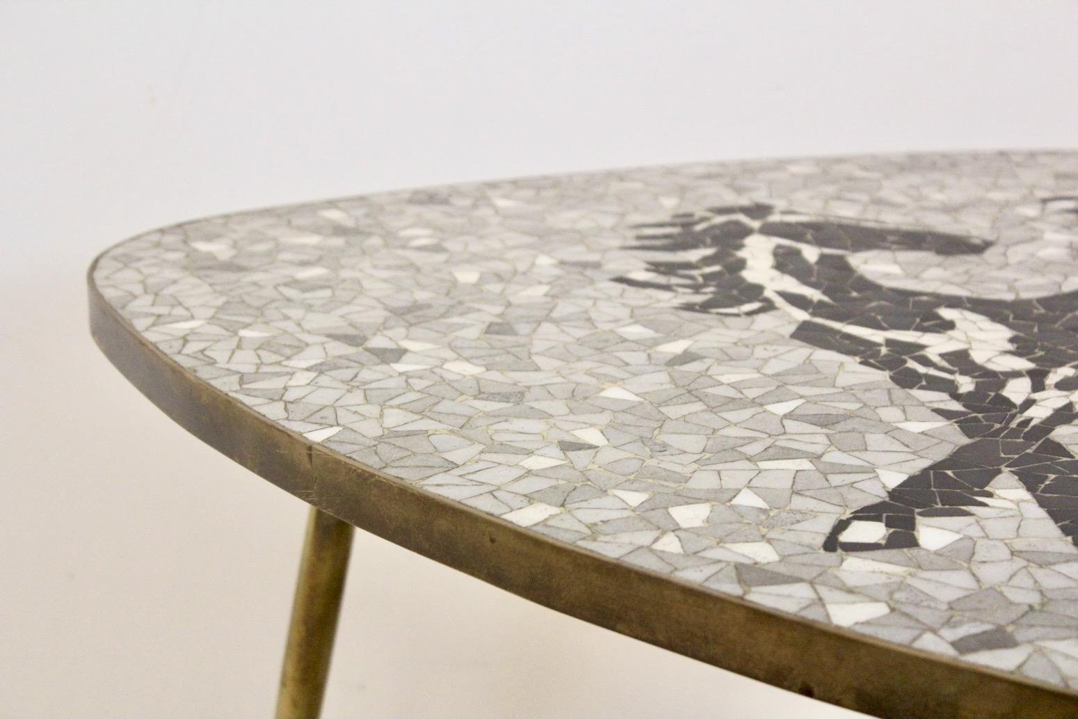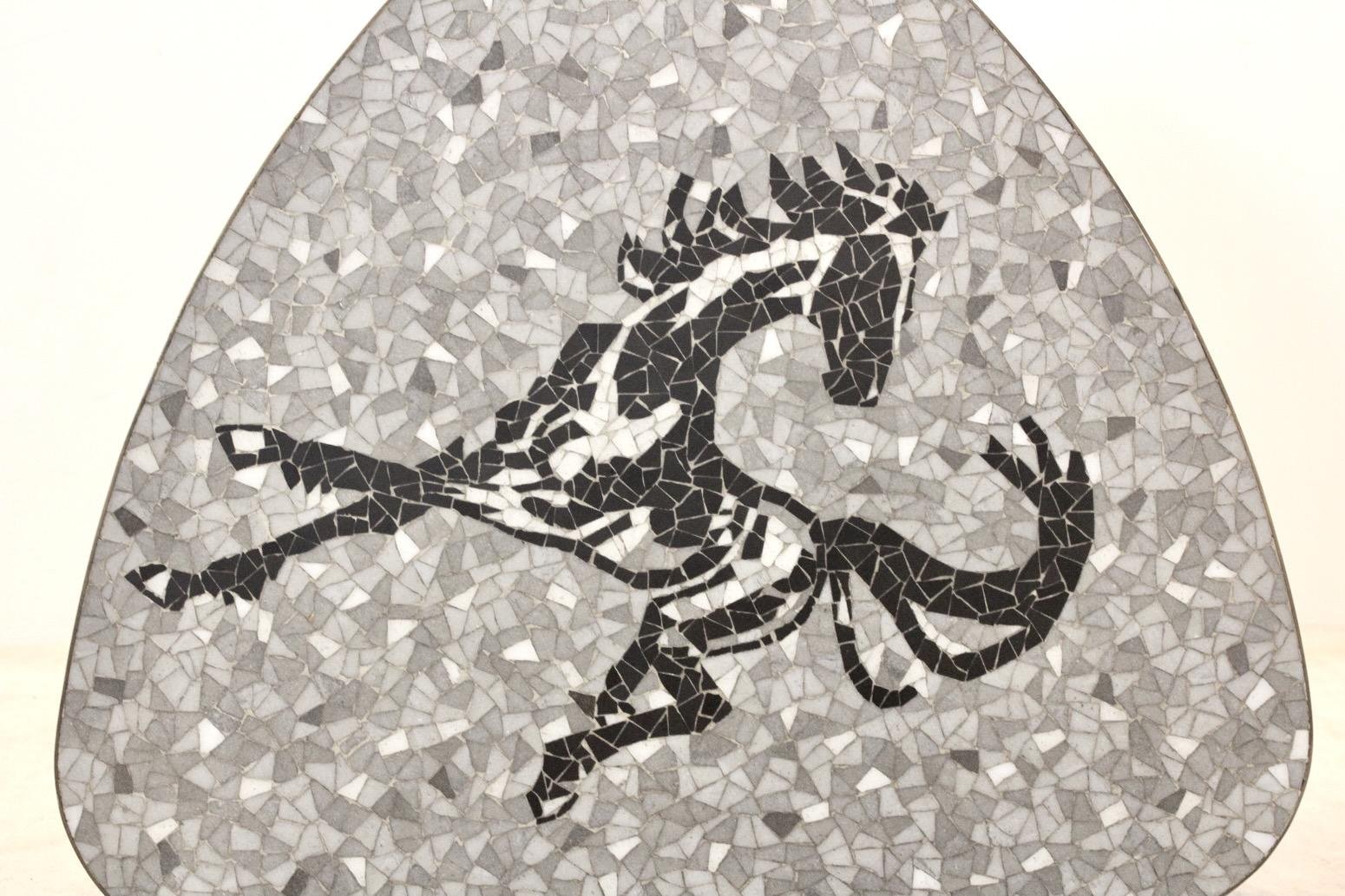 Beautiful, stylish and elegant Mosaic 1960's coffee table made by the sculptor Berthold Müller. Designed with the highest craftsmanship. A stunning mosaic pattern with the sculpture of a horse. Completed with solid brass surroundings and legs with original patina. In very good condition. Born in Oerlinghausen near Bielefeld in 1893, [ Berthold Müller, he himself added Oerlinghausen to his name later, began his studies of sculpture under Hans Perathoner at the Bielefeld College of Arts and Crafts in 1910 while still a schoolboy. Completing his grammar school education in the classical humanities in Bielefeld in 1912, he moved to Berlin in 1914 and studied at the Charlottenburg School of Applied Arts. During the First World War he was conscripted for service with cavalry regiments in Russia, Galicia and France. In 1919 he was able to continue his interrupted studies in Berlin under Hans Perathoner and Willy Jäckel. In 1922, together with his wife, Jenny Wiegmann, he converted to Catholicism at the Abbey of Maria Laach. During the 1920s he devoted himself to religious art. In 1933 he organized, and took part in, the Catholic section of the Exhibition of Ecclesiastical Art during the World’s Fair in Chicago. From then on he spent the summer months mainly in Kressbronn on Lake Constance. In 1936 he founded a mosaic workshop in Berlin. His studio, mosaic workshop and apartment in Berlin were destroyed in an air raid in 1944. After 1945 Berthold Müller-Oerlinghausen made important contributions to a revival of the cultural life of the communities on Lake Constance: the rebuilding of his mosaic workshop in Kressbronn in 1946, exhibitions in the Municipal Museum of Lindau, the founding in 1947 of the “Upper Swabian Secession” (renamed “Secession of Upper Swabia/Lake Constance” in 1950), the founding of the “Artists’ Society of the Town and District of Lindau” (renamed “Lindau Art Patrons’ Society” in 1956), solo exhibitions at the Wessenberg Haus in Constance and elsewhere, a retrospective exhibition at the Municipal Museum of Lindau in 1963 marking his 70th birthday. A monograph of the work of Berthold Müller-Oerlinghausen, written by Ulrich Gertz, was published in 1974. Berthold Müller-Oerlinghausen died in Kressbronn in 1979, too soon to receive the planned honorary title of professor from the State of Baden-Württemberg.