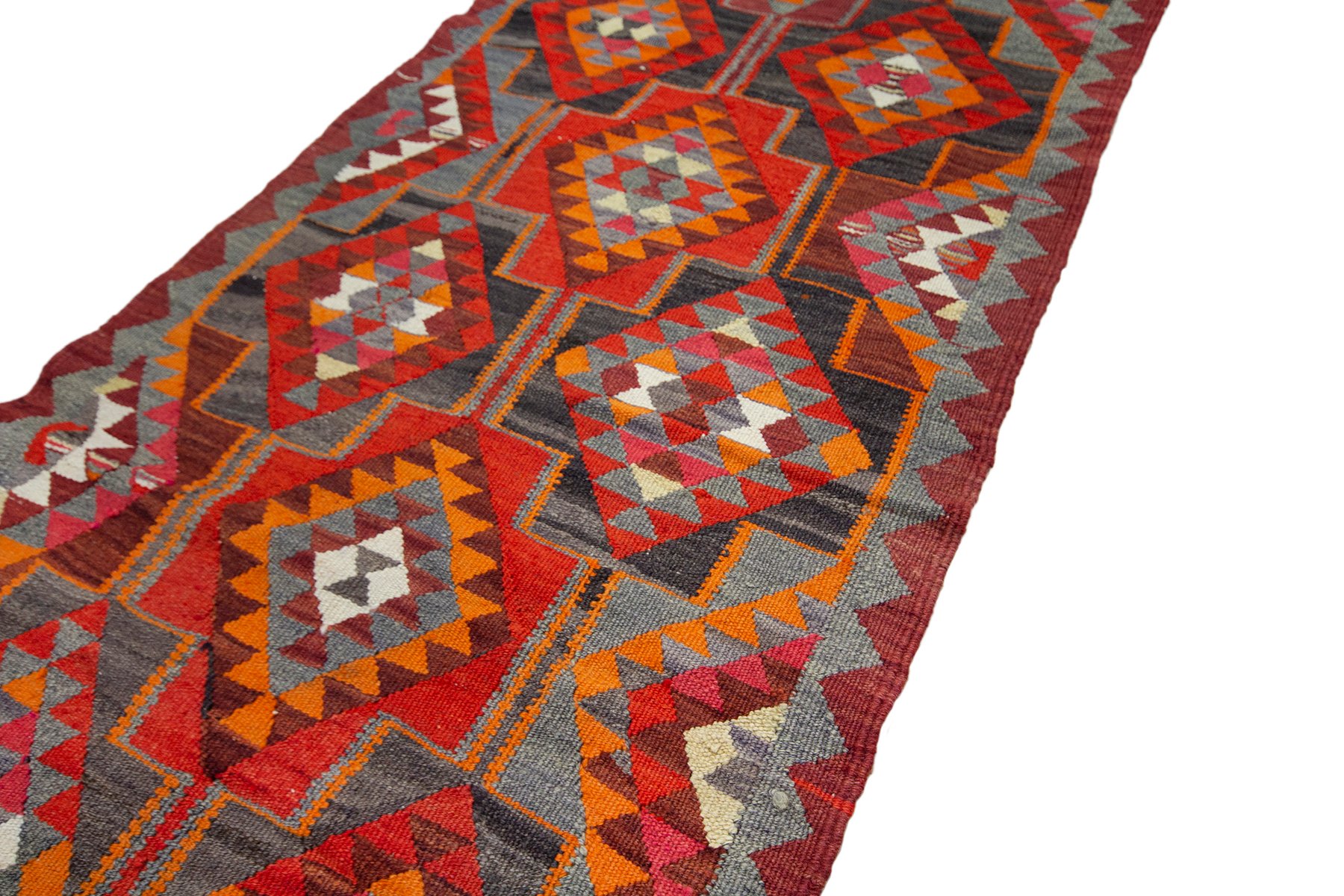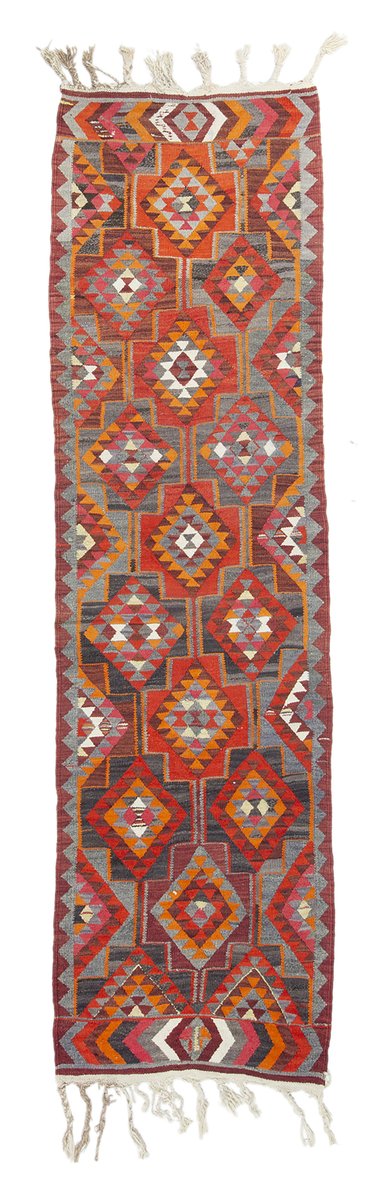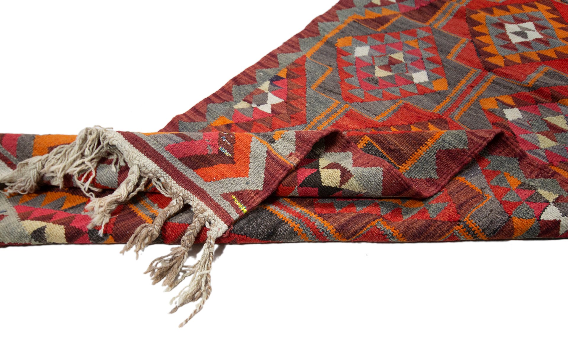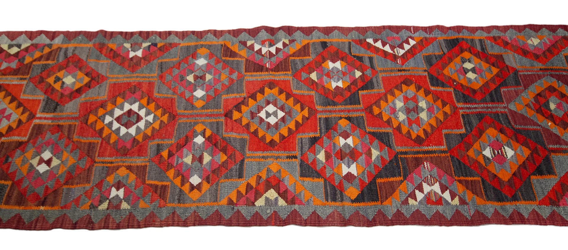 This gorgeous runner flat weave kilim rug is made from wool and has a rough durable texture. This woven piece of art is one-of-a-kind and was made for self use. The pattern and symbols on kilims always have special meanings. They are standing for protection, blessings, abundance or the unity of lovers.