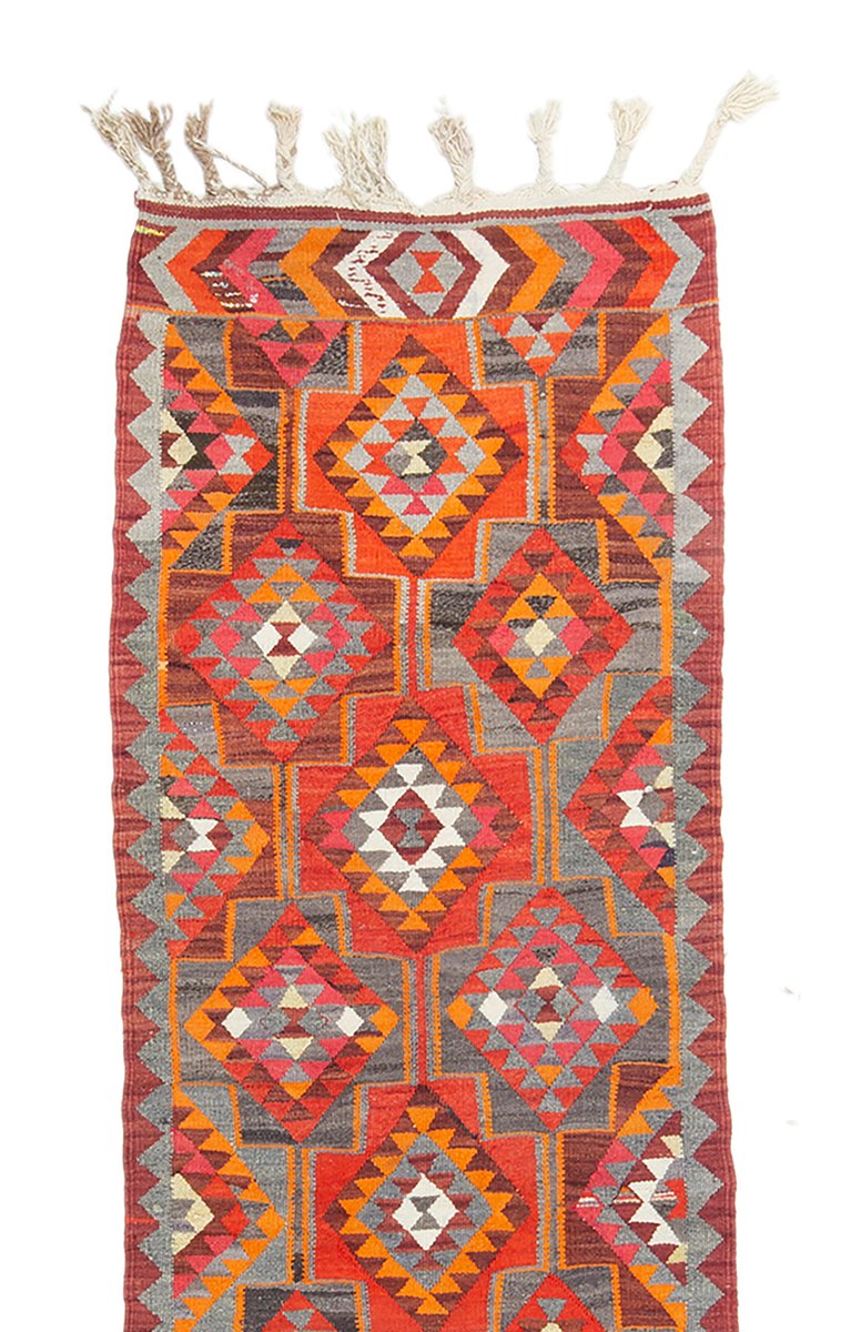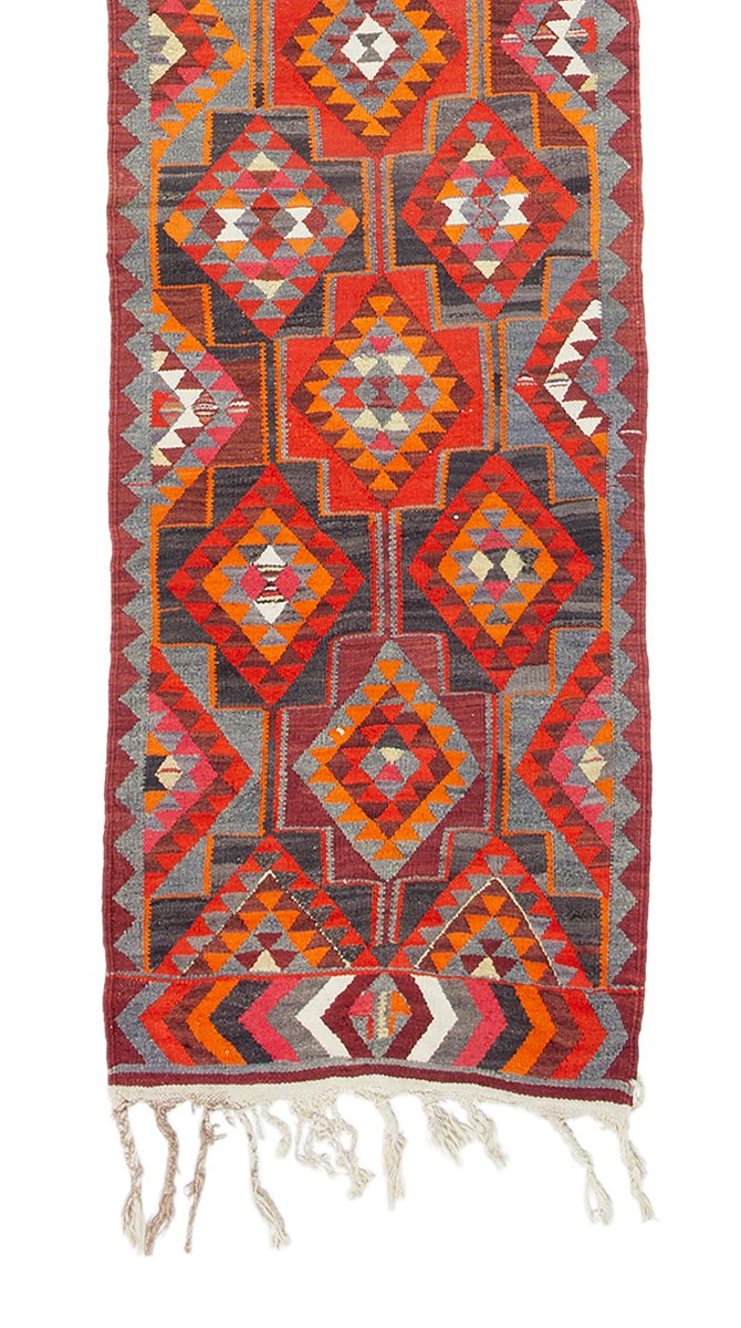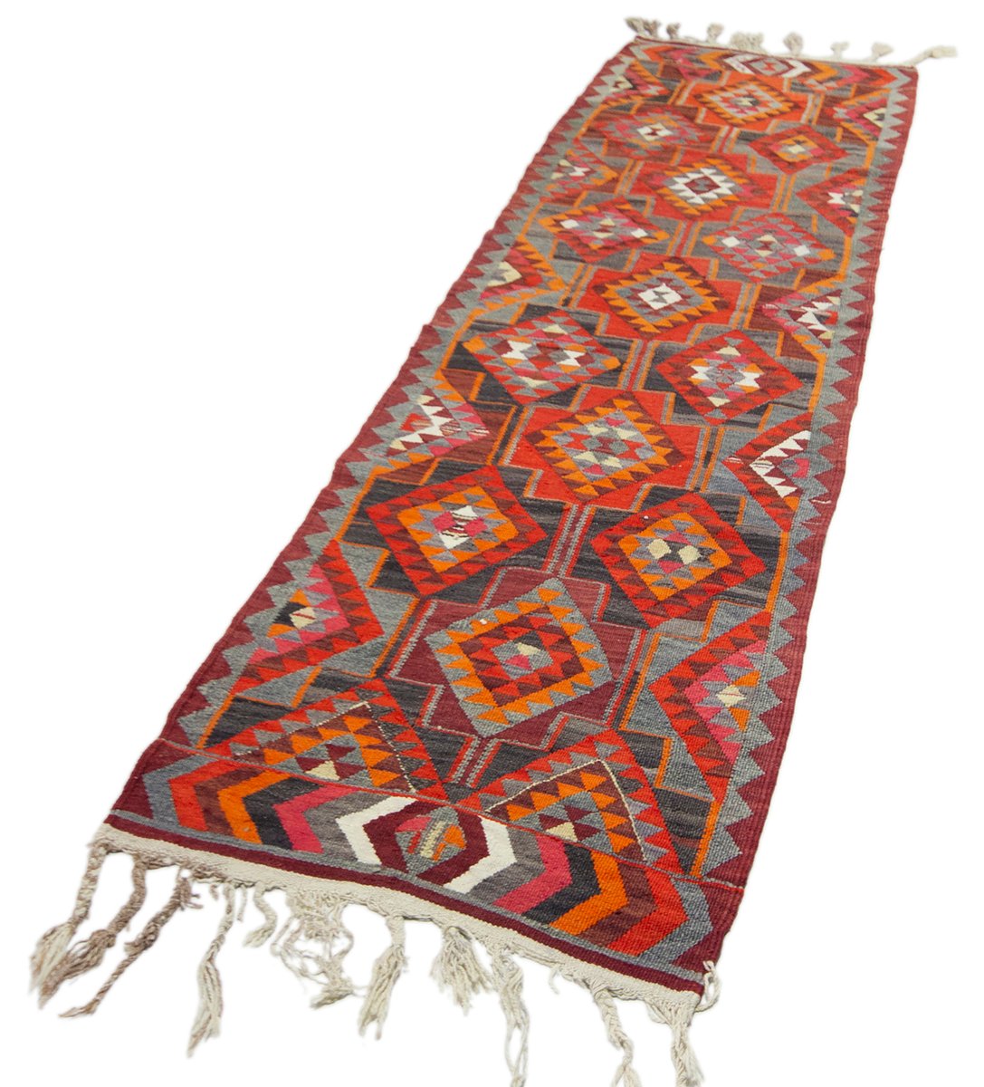 This gorgeous runner flat weave kilim rug is made from wool and has a rough durable texture. This woven piece of art is one-of-a-kind and was made for self use. The pattern and symbols on kilims always have special meanings. They are standing for protection, blessings, abundance or the unity of lovers.