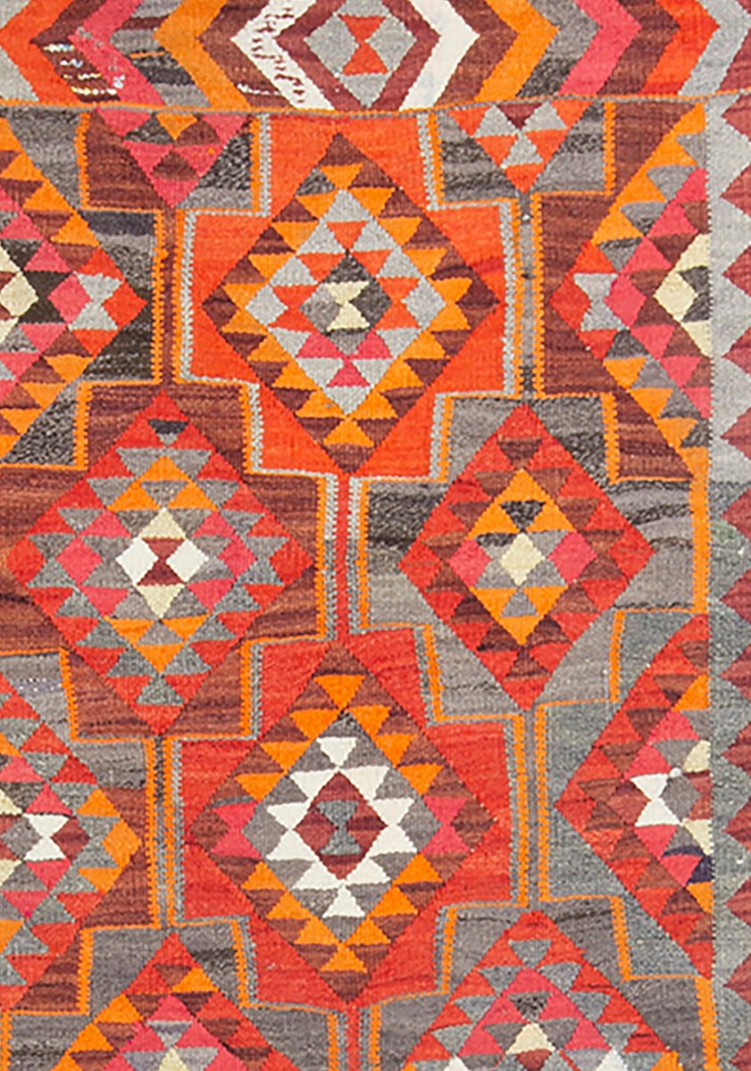 Handwoven in Turkey, this wool kilim features a tribal pattern in bold design. A common theme among tribal weavers, kilims were often used as utilitarian pieces. Today, flat-weave rugs transcend generations with their beauty and distinction, embodying artistic influences from around the world. It has a tribal feel that would easily fit into a boho chic design, but it also has a retro feel, too.