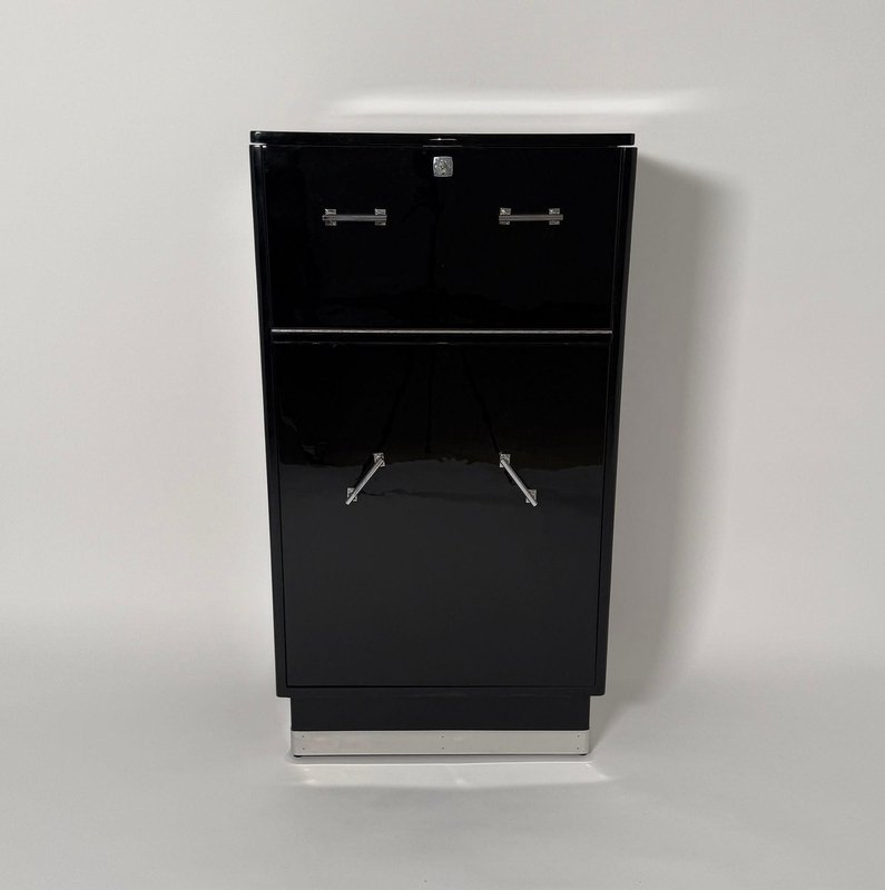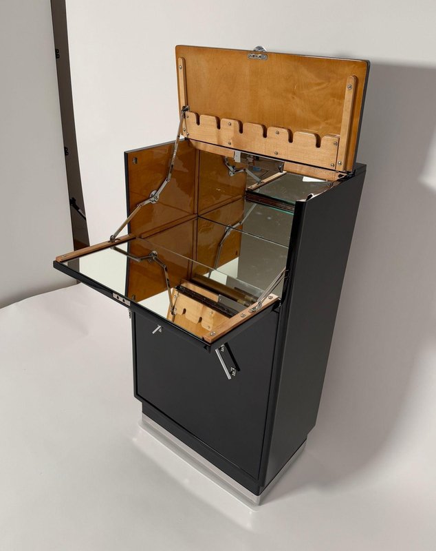 Rotating original Art Deco Bar Cabinet with Chrome fittings, from France around 1930. Black lacquered walnut, polished to a high gloss. Interior in light maple wood, satin finished. Bottom inside in mahogany with two hidden bottle compartments. Chrome-plated original handles. Polished stainless steel trims. Upper section folds out and mirrored inside with lighting. Renewed electrics, cable with european plug. Lower section completely rotatable with bottle holders and original, polished metal parts. Fully restored condition, relacquered. Dimensions: H 113 cm / 44.49 in W 61 cm / 24 in D 35 cm / 13.78 in