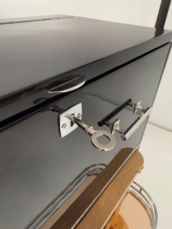 Mobile bar girevole originale Art Déco con accessori cromati, proveniente dalla Francia intorno al 1930. Noce laccato nero, lucidato a specchio. Interno in acero chiaro, satinato. Fondo interno in mogano con due scomparti nascosti per le bottiglie. Maniglie originali cromate. Finiture in acciaio inox lucidato. Parte superiore ribaltabile e interno a specchio con illuminazione. Impianto elettrico rinnovato, cavo con spina europea. Sezione inferiore completamente girevole con portabottiglie e parti metalliche originali lucidate. Completamente restaurato, laccato. Dimensioni: H 113 cm / 44,49 in L 61 cm / 24 in P 35 cm / 13,78 in