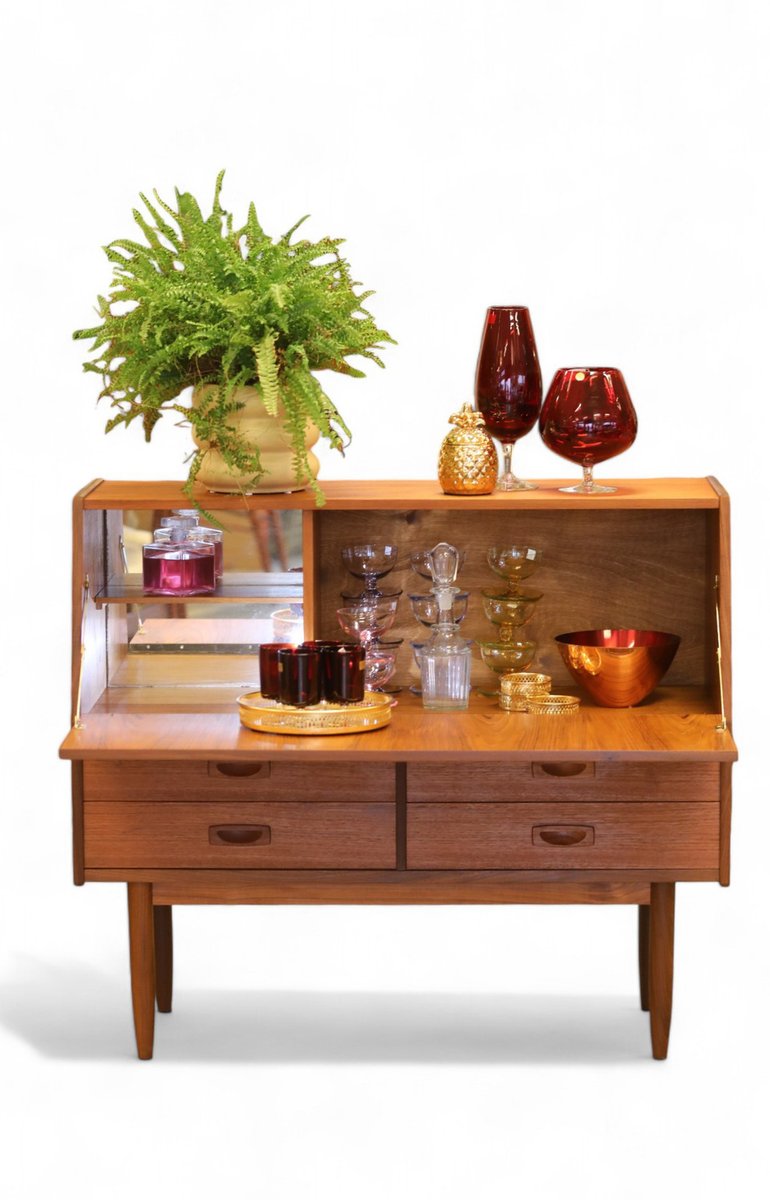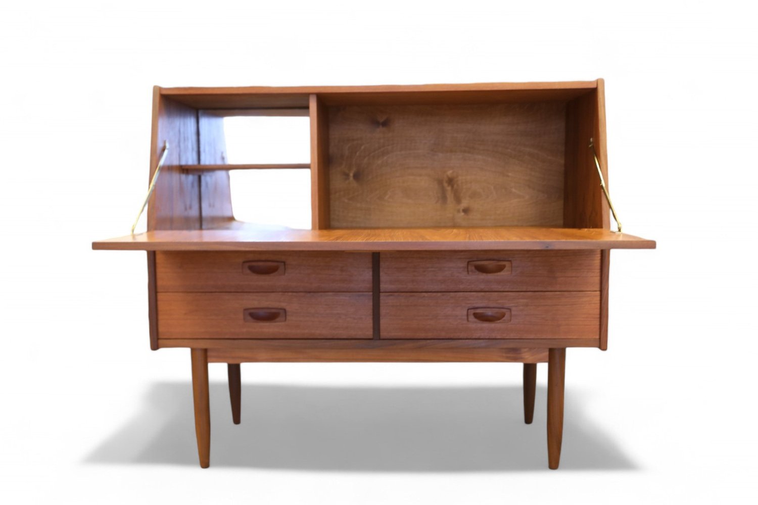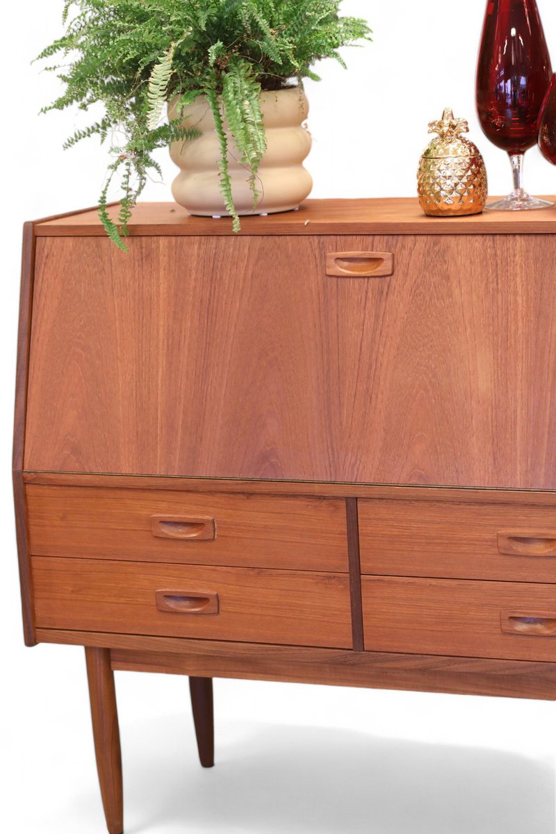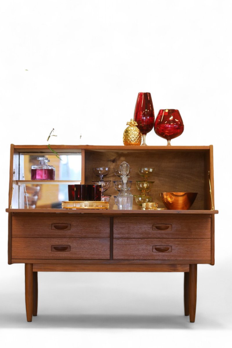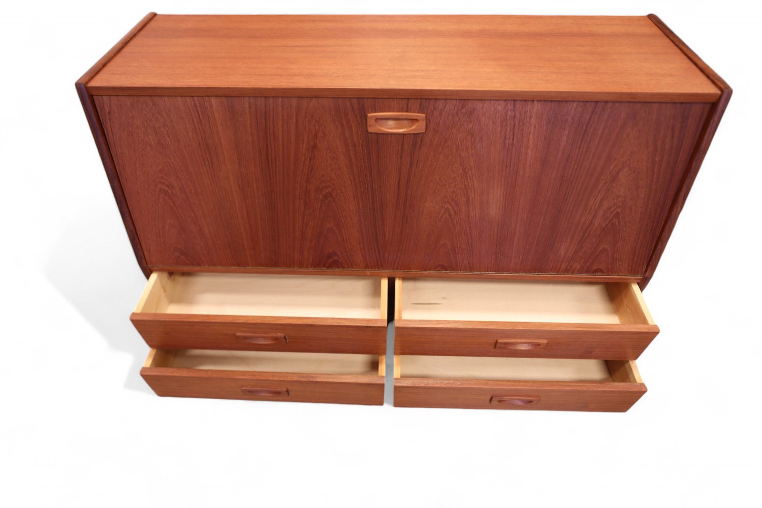 Mobile bar danese indipendente in teak. Il mobile ha dimensioni comode che lo rendono facile da collocare e pratico in diversi ambienti della casa. Il suo design elegante e le linee pulite dello stile lo rendono un bellissimo elemento d'arredo, indipendentemente dal fatto che si trovi in soggiorno, cucina, ingresso o zona pranzo.