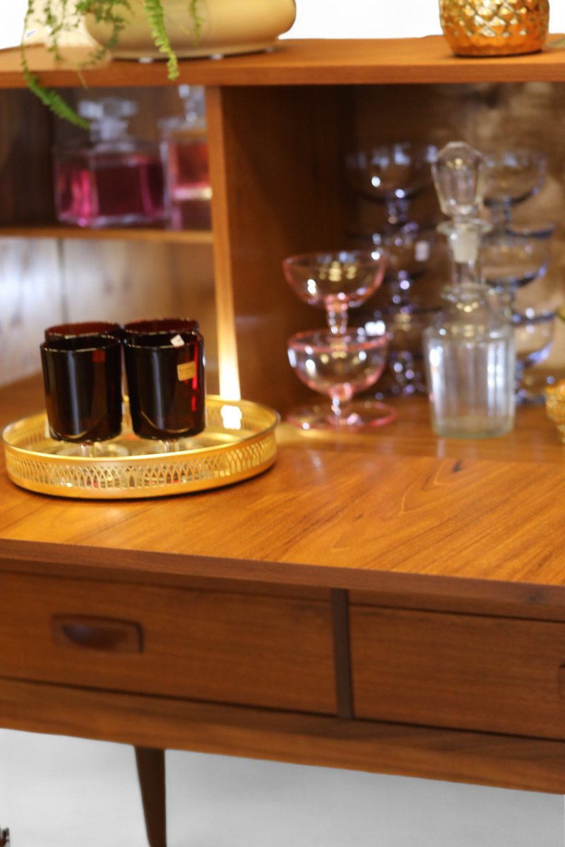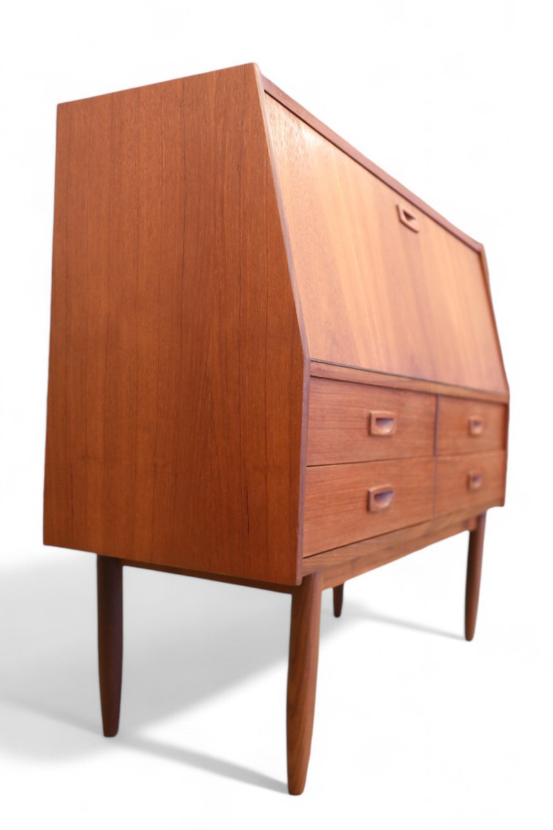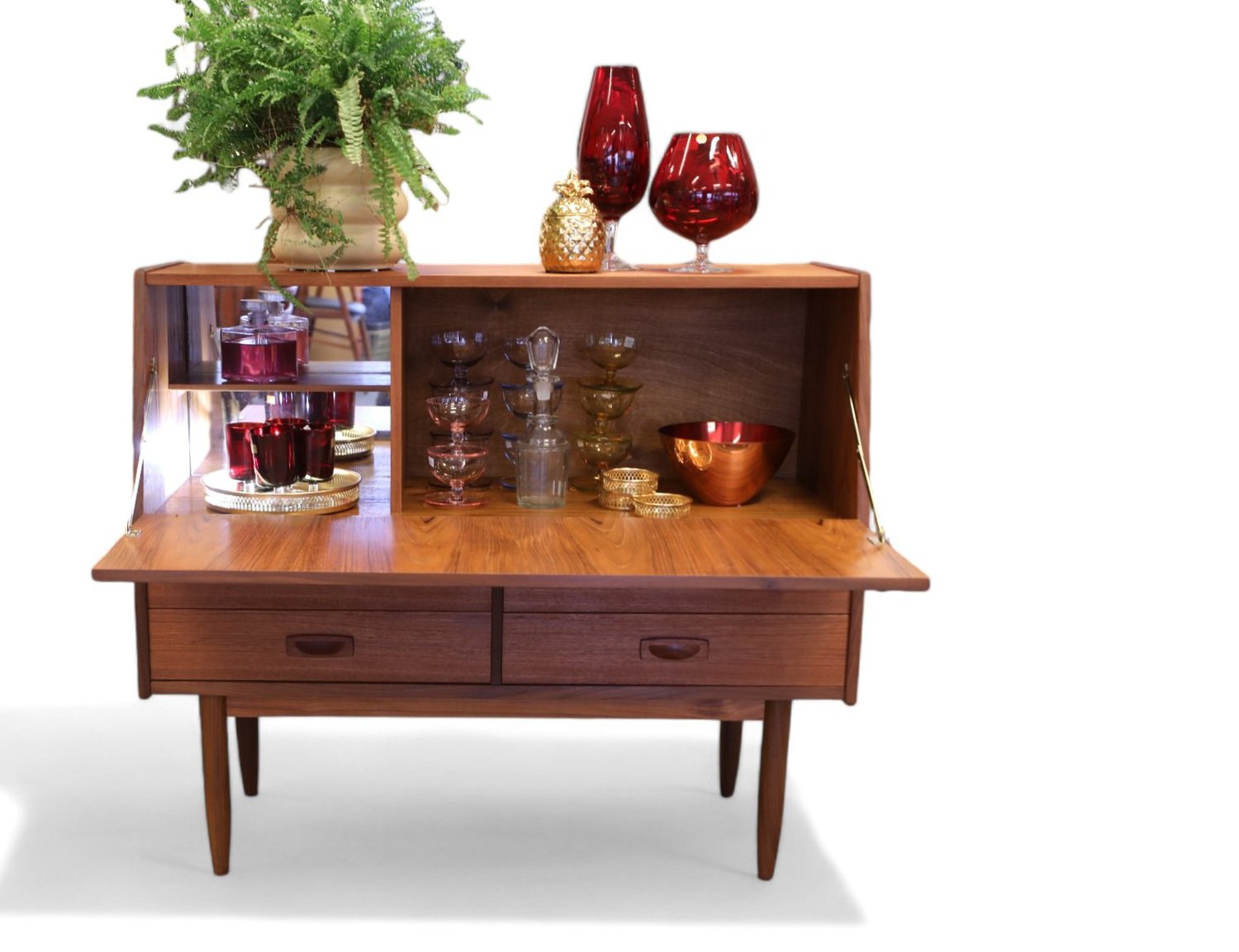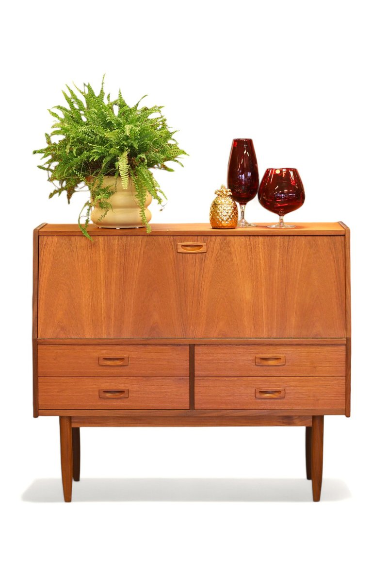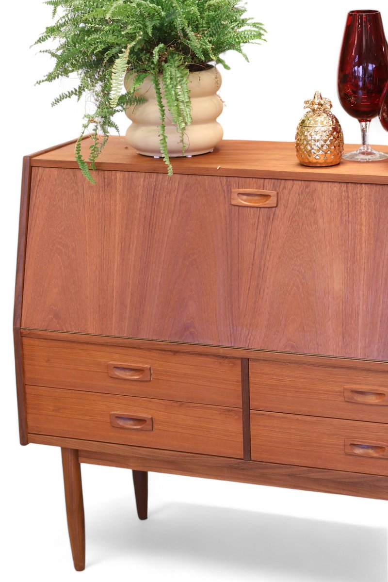 Mobile bar danese indipendente in teak. Il mobile ha dimensioni comode che lo rendono facile da collocare e pratico in diversi ambienti della casa. Il suo design elegante e le linee pulite dello stile lo rendono un bellissimo elemento d'arredo, indipendentemente dal fatto che si trovi in soggiorno, cucina, ingresso o zona pranzo.