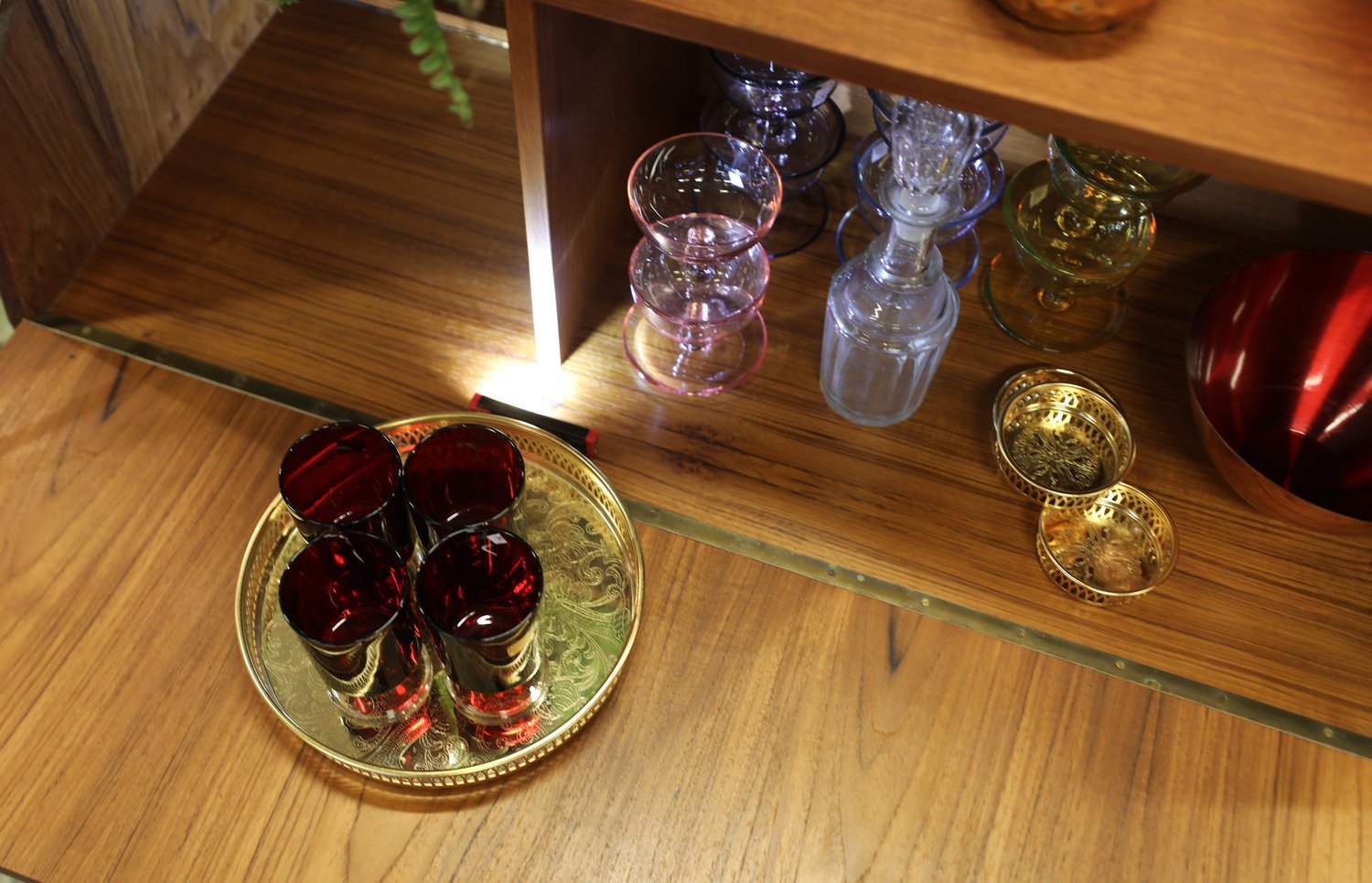 Il mobile è dotato di quattro cassetti e di una pratica botola che consente di raggiungere facilmente il contenuto. Dietro l'anta c'è un ampio spazio per riporre oggetti a diverse altezze, che consente di organizzare tutto, dagli oggetti più piccoli a quelli più grandi. La botola può essere praticamente utilizzata come piano d'appoggio quando si devono mescolare e servire le bevande!