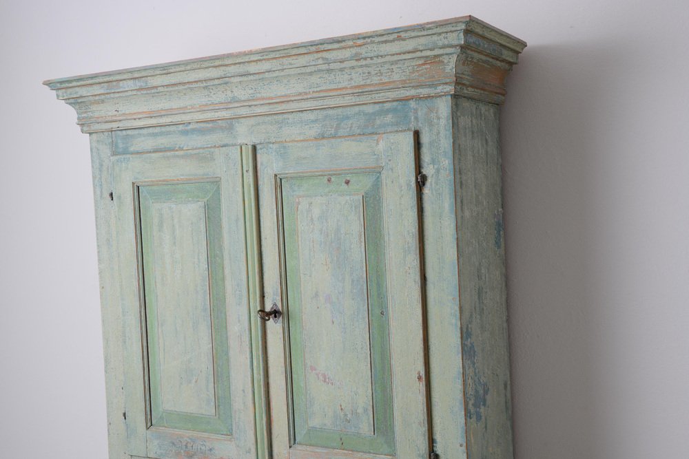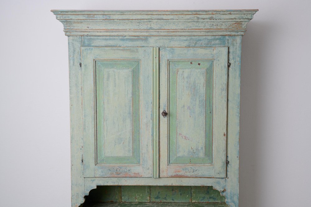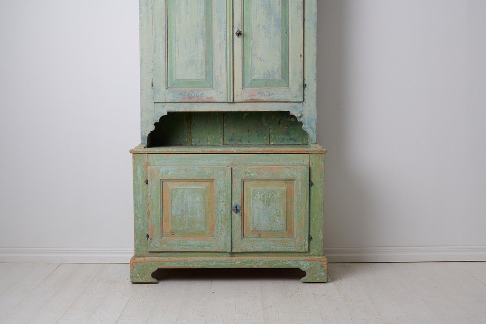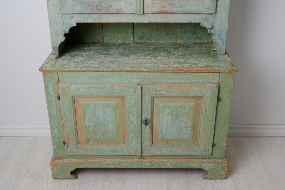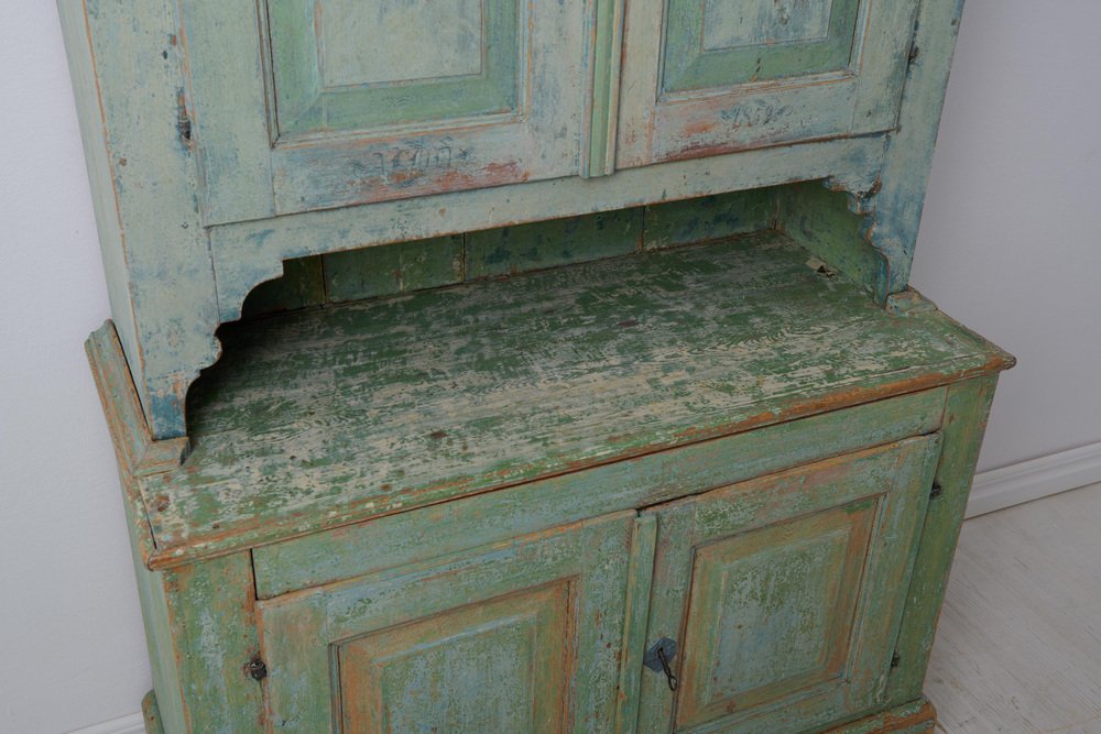 Rare Swedish antique cabinet, a genuine country house furniture in gustavian style from northern Sweden. The cabinet is made by hand in solid pine around 1840 to 1850. Two parts with original paint and genuine distress and patina. The colour of the paint is more unusual. There are traces of a set of initials and year, made in light blue at the bottom of the upper doors. Old original locks and keys which are still functional. Healthy and solid frame that is well-crafted. Traces of a small older repair, left side of the pediment closest to the wall – see picture. The lower cabinet measures 76 cm tall, 110 cm wide and 48 cm deep. The body of the upper cabinet measures 102 cm wide, while the width including the pediment measures 116 cm. Depth of the upper cabinet not including the pediment is 31 cm, and with the pediment 38 cm deep. Height of the upper is 125 cm making the total height 201 cm.