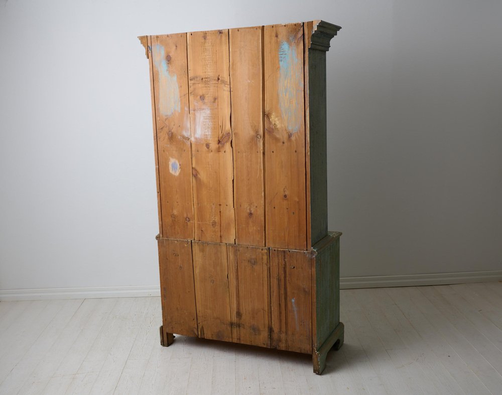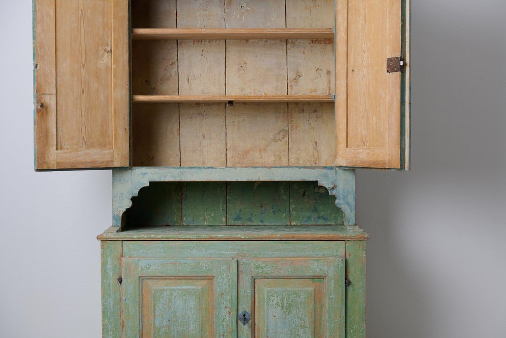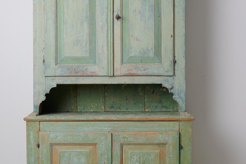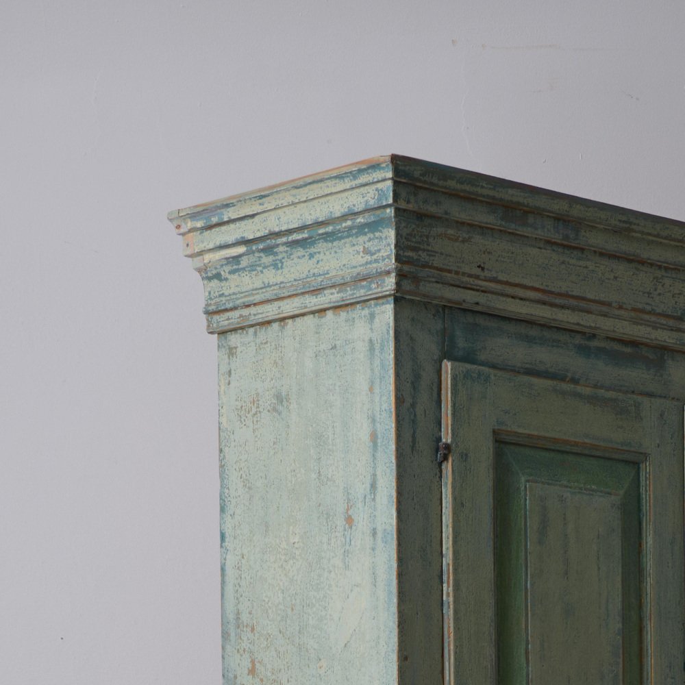 Rare Swedish antique cabinet, a genuine country house furniture in gustavian style from northern Sweden. The cabinet is made by hand in solid pine around 1840 to 1850. Two parts with original paint and genuine distress and patina. The colour of the paint is more unusual. There are traces of a set of initials and year, made in light blue at the bottom of the upper doors. Old original locks and keys which are still functional. Healthy and solid frame that is well-crafted. Traces of a small older repair, left side of the pediment closest to the wall – see picture. The lower cabinet measures 76 cm tall, 110 cm wide and 48 cm deep. The body of the upper cabinet measures 102 cm wide, while the width including the pediment measures 116 cm. Depth of the upper cabinet not including the pediment is 31 cm, and with the pediment 38 cm deep. Height of the upper is 125 cm making the total height 201 cm.