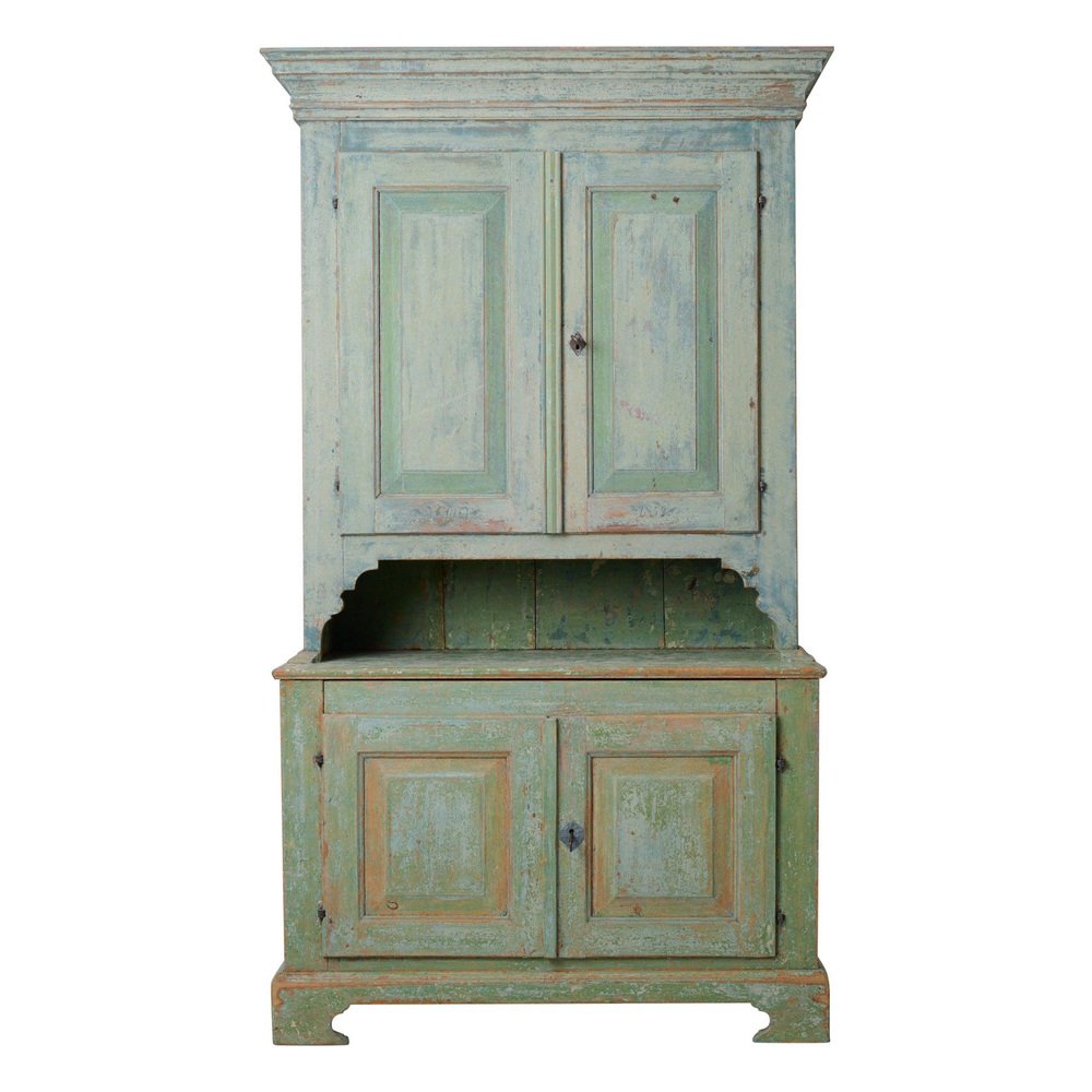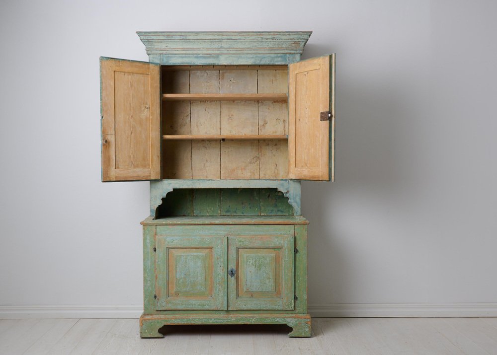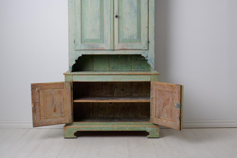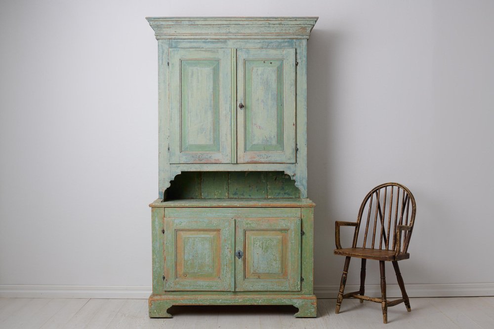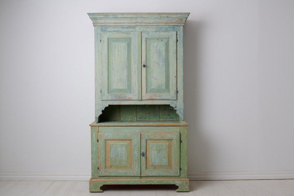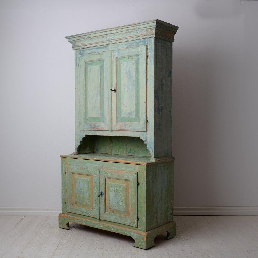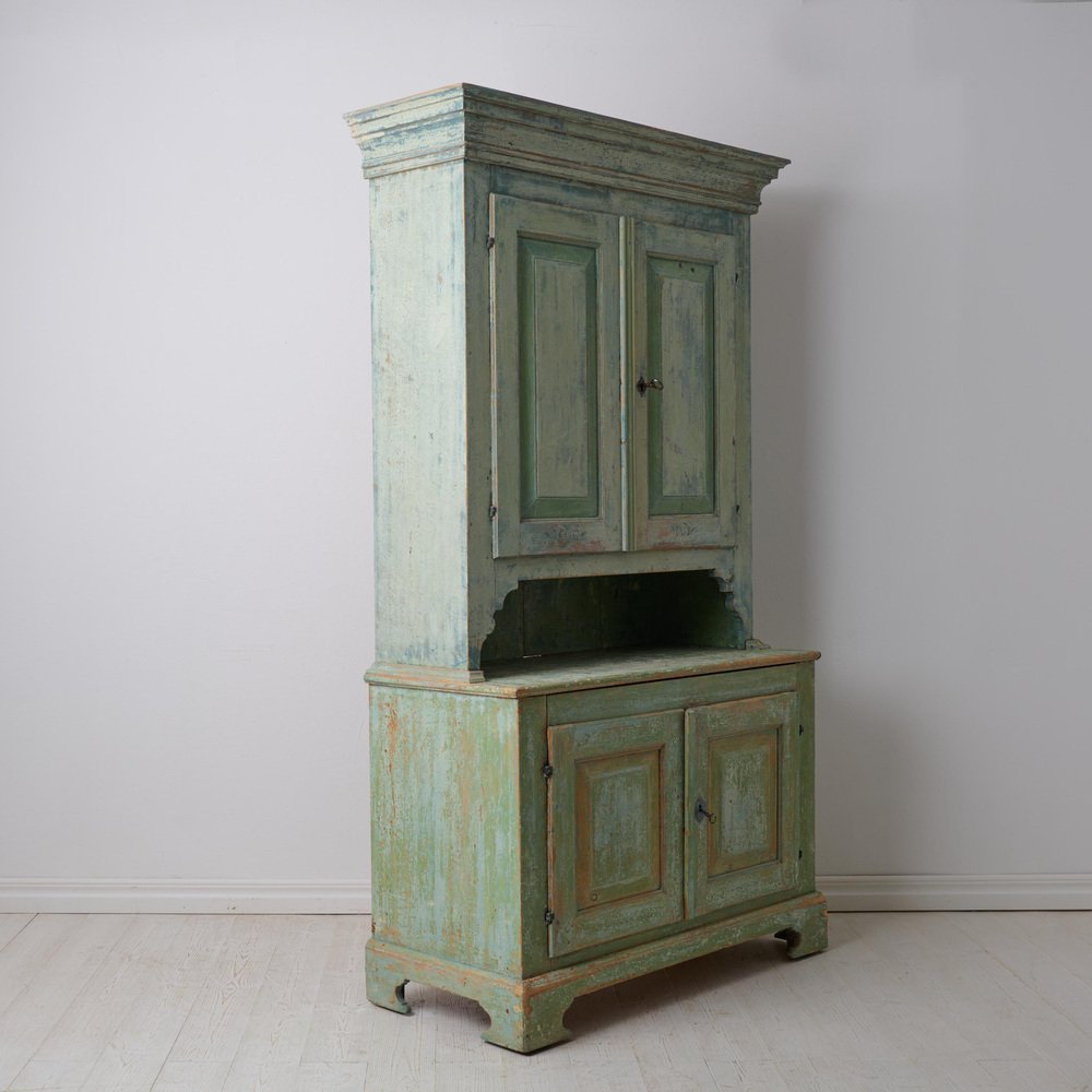 Raro mobile antico svedese, un autentico mobile da casa in stile gustaviano proveniente dalla Svezia settentrionale. Il mobile è stato realizzato a mano in pino massiccio tra il 1840 e il 1850. Due parti con vernice originale e patina autentica. Il colore della vernice è più insolito. Ci sono tracce di una serie di iniziali e dell'anno, realizzate in azzurro nella parte inferiore delle ante superiori. Vecchie serrature e chiavi originali ancora funzionanti. Telaio sano e solido, ben realizzato. Tracce di una piccola riparazione più vecchia, sul lato sinistro del frontone più vicino alla parete - vedi foto. Il mobile inferiore misura 76 cm di altezza, 110 cm di larghezza e 48 cm di profondità. Il corpo del mobile superiore misura 102 cm di larghezza, mentre la larghezza compreso il frontone misura 116 cm. La profondità del mobile superiore senza frontone è di 31 cm, mentre con il frontone è di 38 cm. L'altezza del mobile superiore è di 125 cm, per un totale di 201 cm.