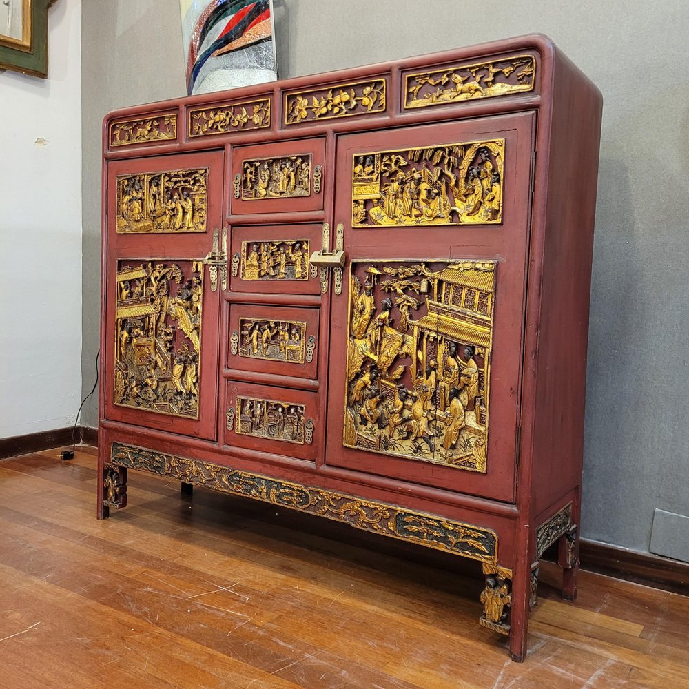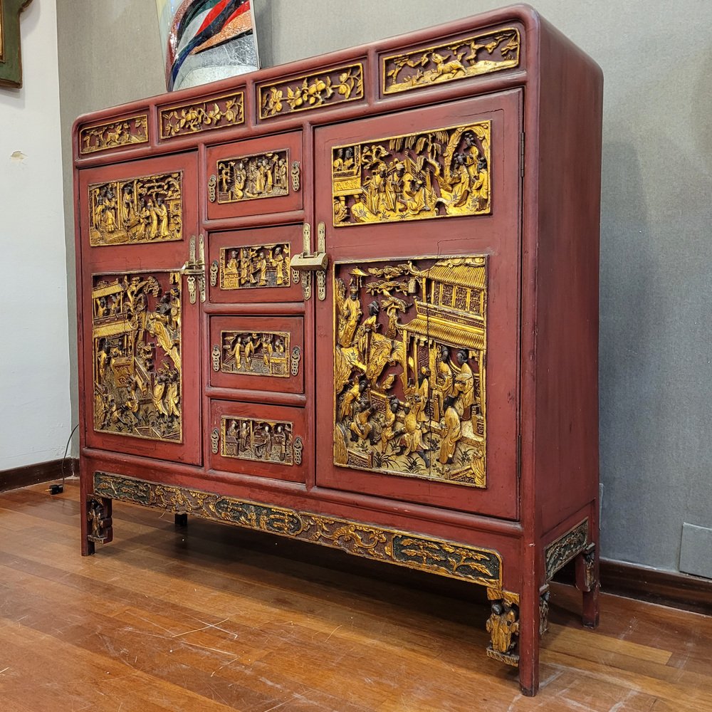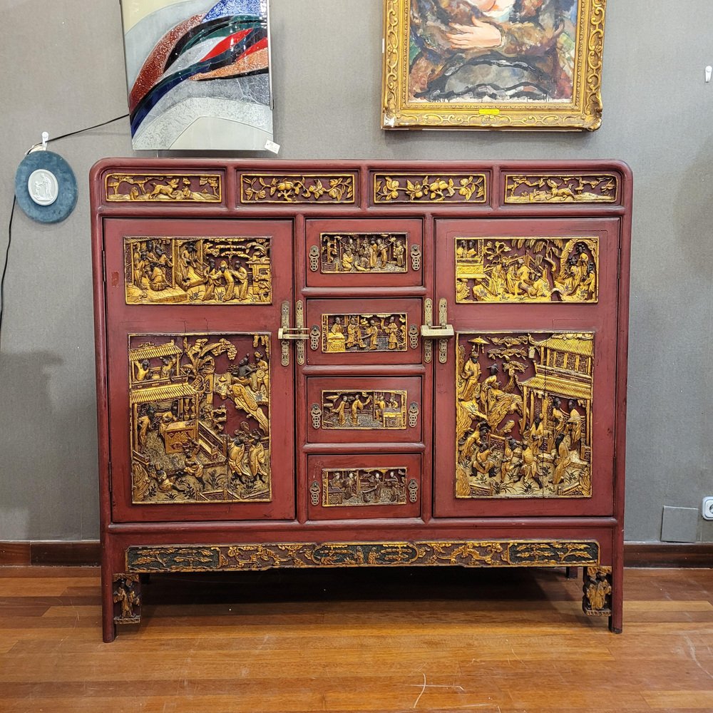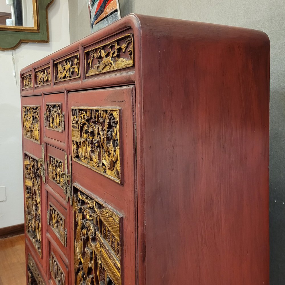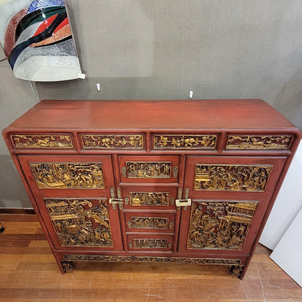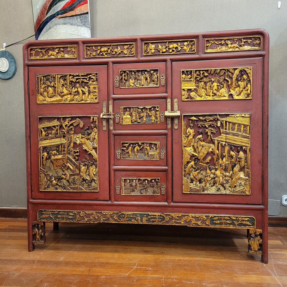 Grande mobile o credenza della fine del XIX secolo, originale della città di Ningbo, Cina. Realizzato in legno laccato, intagliato e dorato. Il colore rosso è legato in questa cultura alla classe aristocratica e imperiale. Corpo rettangolare, con angoli superiori leggermente arrotondati e poggiante su quattro gambe con una piccola gonna. Nella parte centrale presenta quattro registri e, su ciascun lato, una grande porta con una mensola all'interno (la mensola originale sul lato sinistro è mancante, ma potrebbe essere sostituita senza problemi). La distribuzione spaziale dell'interno è splendida, con un'elevata capacità di stoccaggio. Su tutta la facciata sono presenti pannelli scolpiti ad alto rilievo che rappresentano scene di palazzo, elementi vegetali e animali, dorati a foglia d'oro. Le due porte sono chiuse da lucchetti di bronzo, riccamente ornati con draghi e calligrafia cinese. I due lucchetti e le rispettive chiavi sono conservati. Pezzo unico altamente decorativo e molto raffinato.