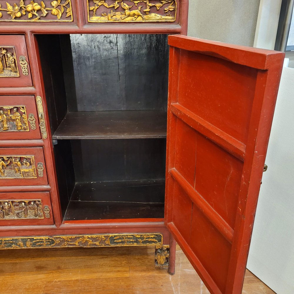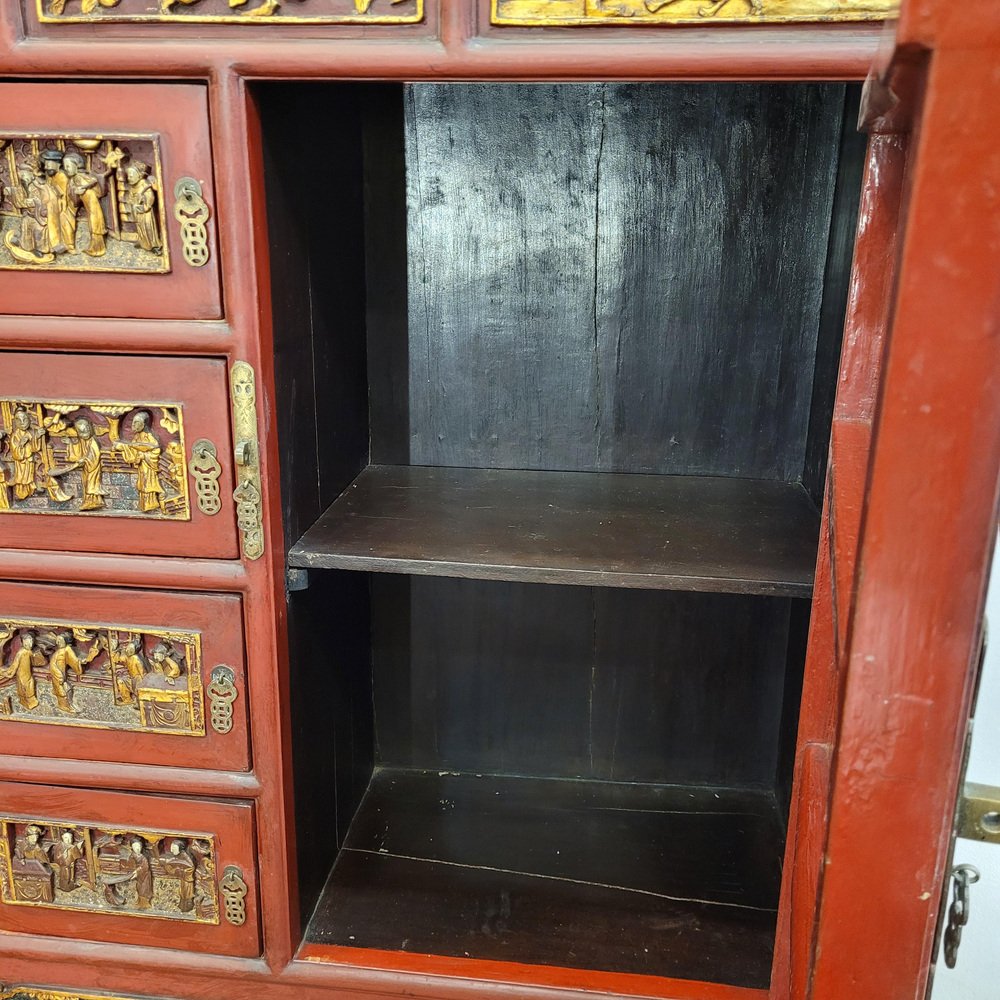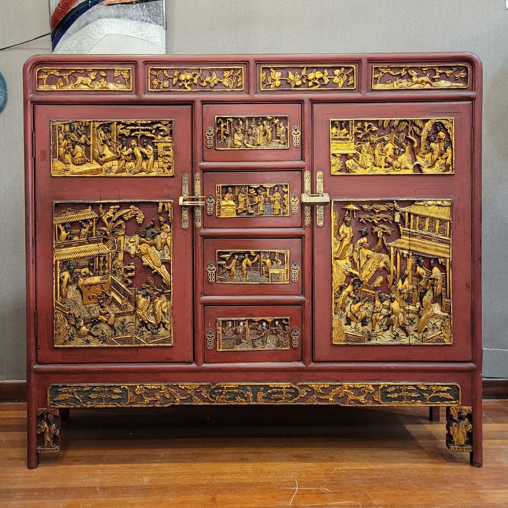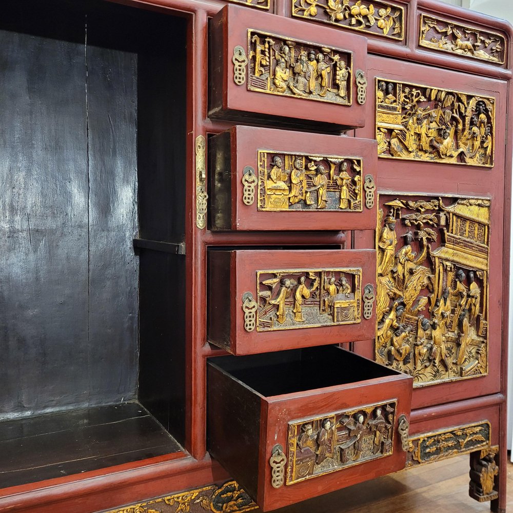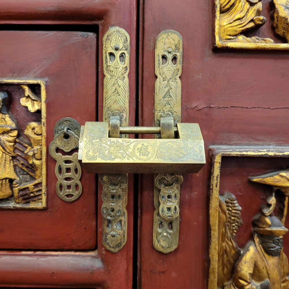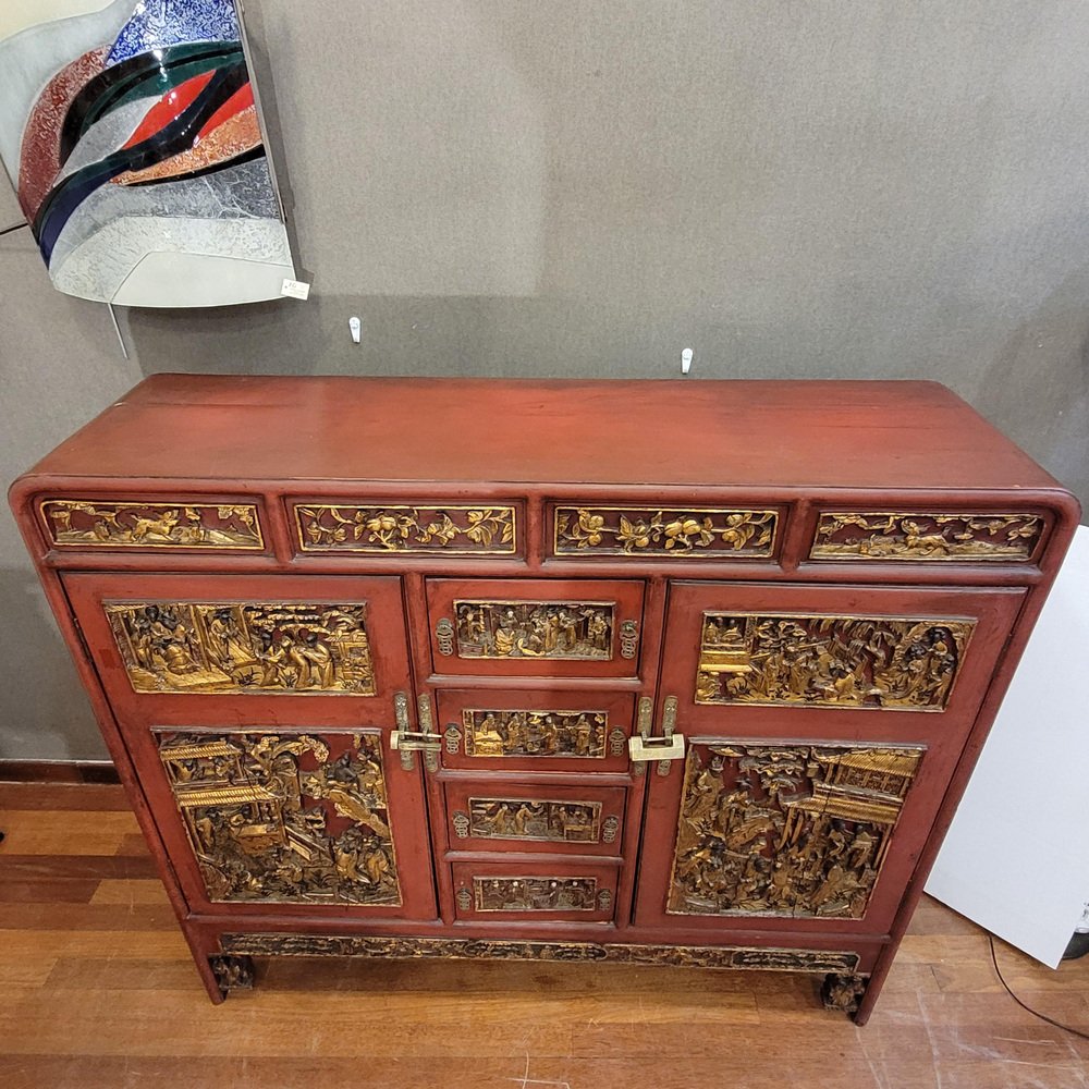 Grande mobile o credenza della fine del XIX secolo, originale della città di Ningbo, Cina. Realizzato in legno laccato, intagliato e dorato. Il colore rosso è legato in questa cultura alla classe aristocratica e imperiale. Corpo rettangolare, con angoli superiori leggermente arrotondati e poggiante su quattro gambe con una piccola gonna. Nella parte centrale presenta quattro registri e, su ciascun lato, una grande porta con una mensola all'interno (la mensola originale sul lato sinistro è mancante, ma potrebbe essere sostituita senza problemi). La distribuzione spaziale dell'interno è splendida, con un'elevata capacità di stoccaggio. Su tutta la facciata sono presenti pannelli scolpiti ad alto rilievo che rappresentano scene di palazzo, elementi vegetali e animali, dorati a foglia d'oro. Le due porte sono chiuse da lucchetti di bronzo, riccamente ornati con draghi e calligrafia cinese. I due lucchetti e le rispettive chiavi sono conservati. Pezzo unico altamente decorativo e molto raffinato.