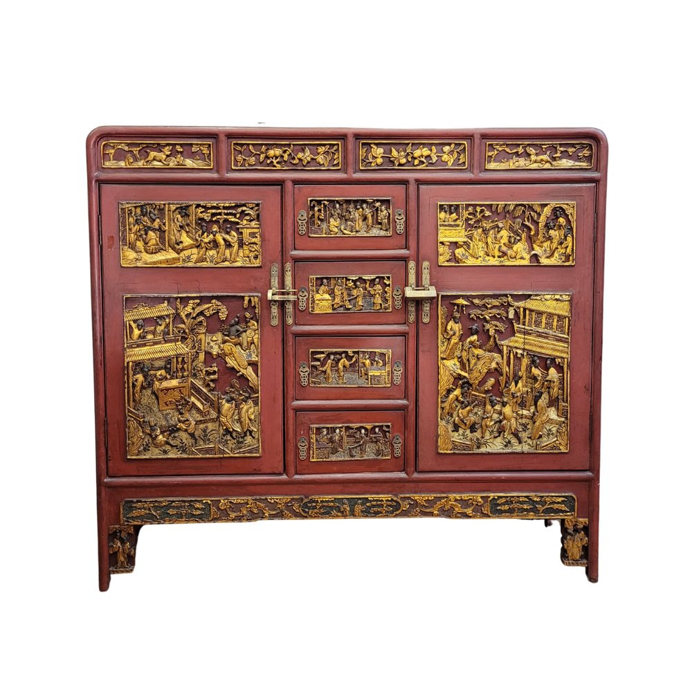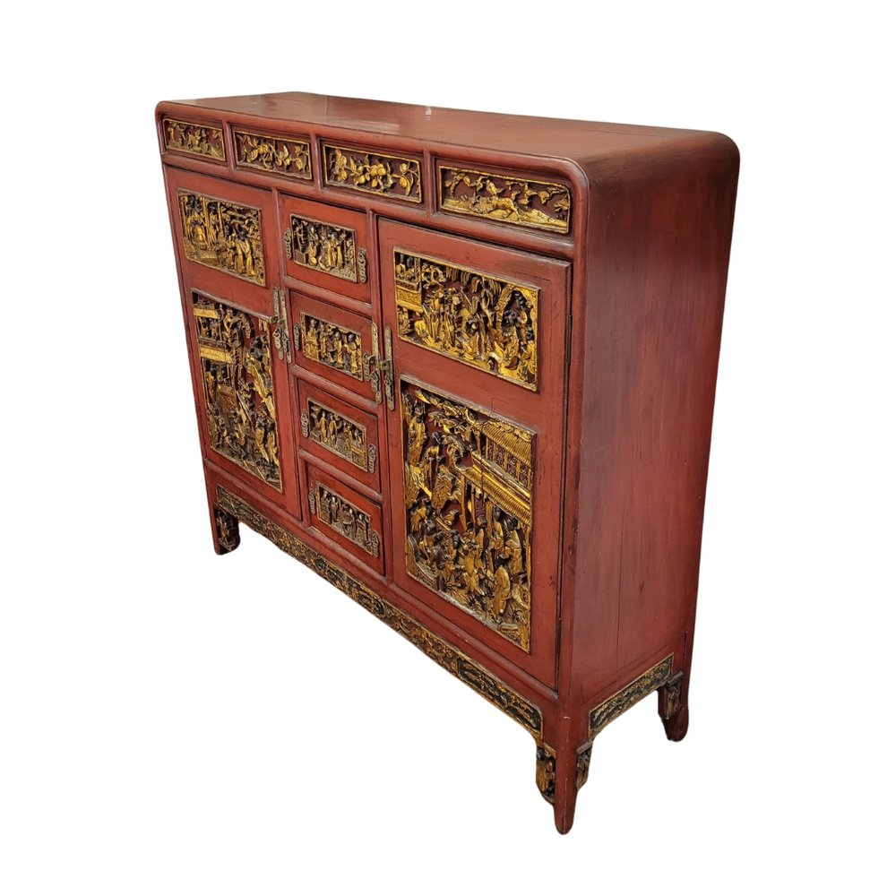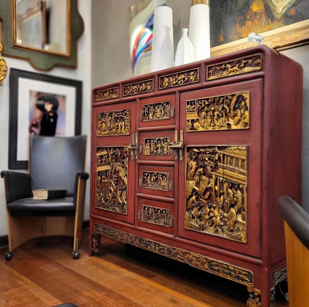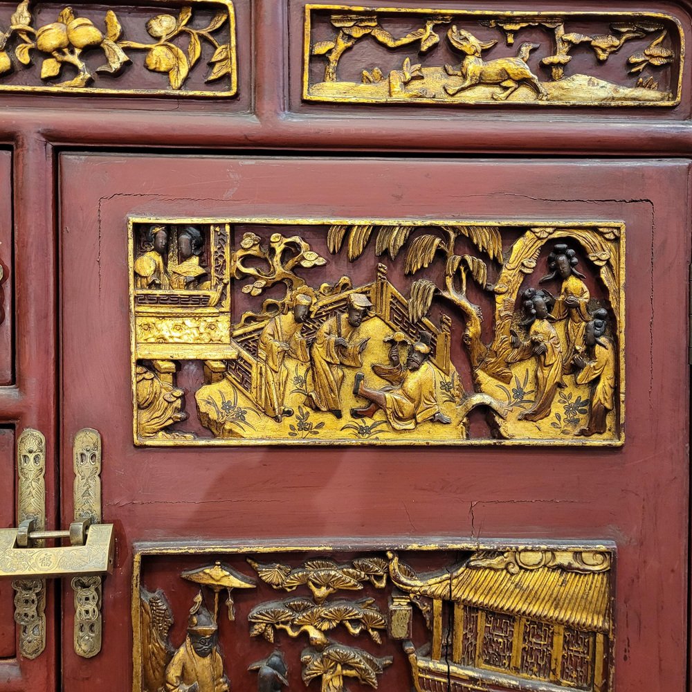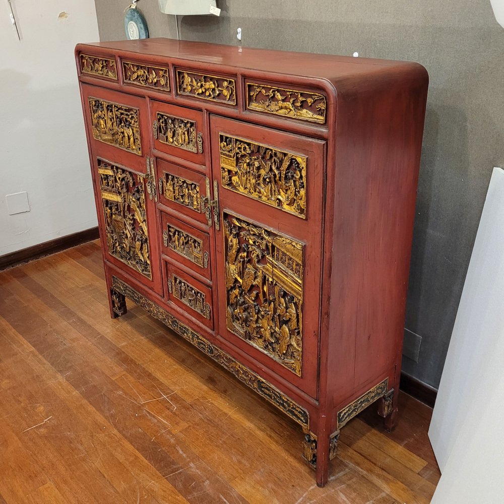 Grande mobile o credenza della fine del XIX secolo, originale della città di Ningbo, Cina. Realizzato in legno laccato, intagliato e dorato. Il colore rosso è legato in questa cultura alla classe aristocratica e imperiale. Corpo rettangolare, con angoli superiori leggermente arrotondati e poggiante su quattro gambe con una piccola gonna. Nella parte centrale presenta quattro registri e, su ciascun lato, una grande porta con una mensola all'interno (la mensola originale sul lato sinistro è mancante, ma potrebbe essere sostituita senza problemi). La distribuzione spaziale dell'interno è splendida, con un'elevata capacità di stoccaggio. Su tutta la facciata sono presenti pannelli scolpiti ad alto rilievo che rappresentano scene di palazzo, elementi vegetali e animali, dorati a foglia d'oro. Le due porte sono chiuse da lucchetti di bronzo, riccamente ornati con draghi e calligrafia cinese. I due lucchetti e le rispettive chiavi sono conservati. Pezzo unico altamente decorativo e molto raffinato.