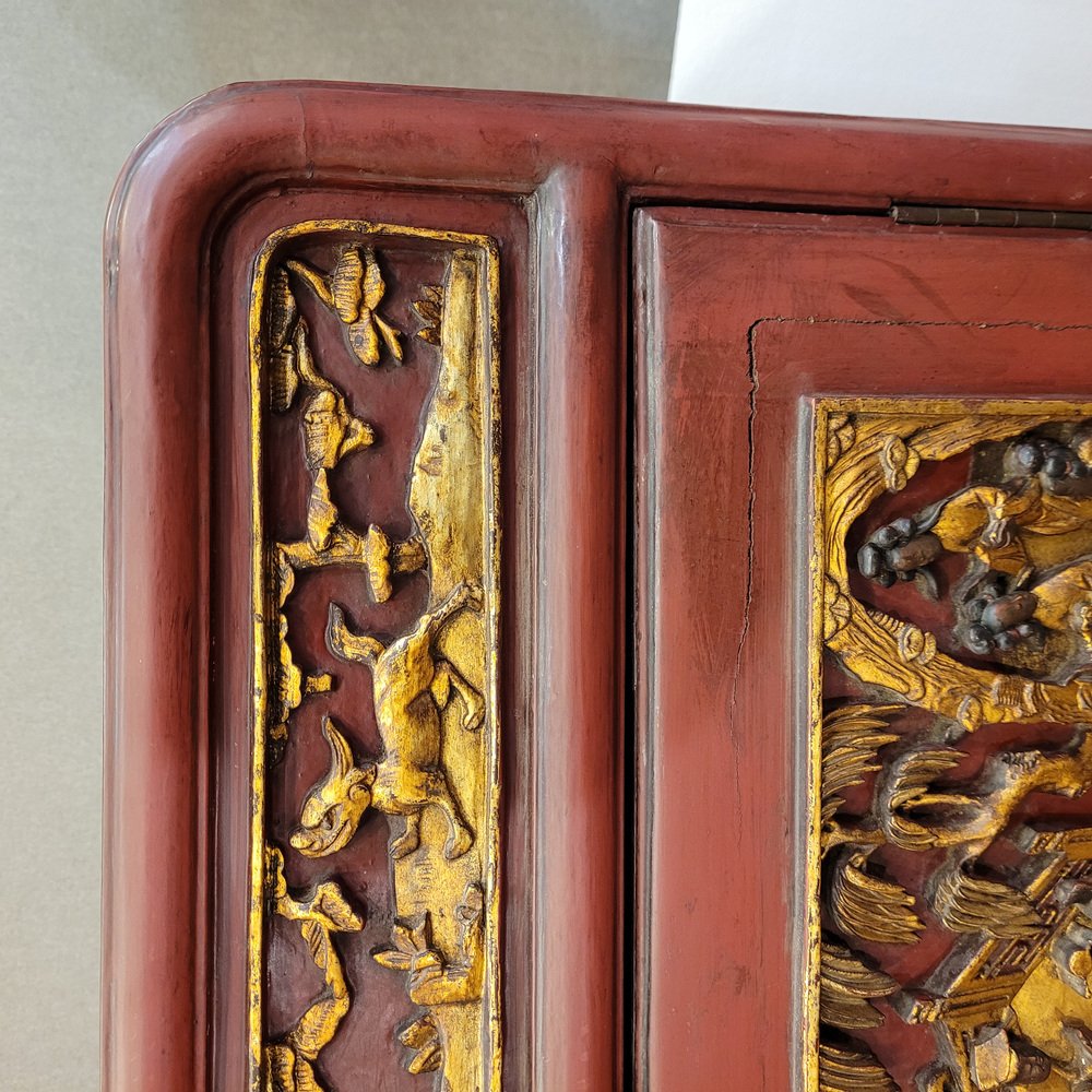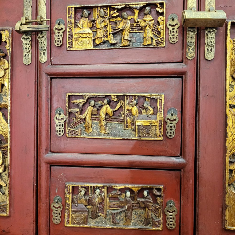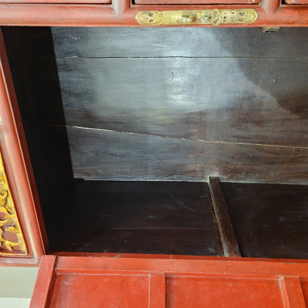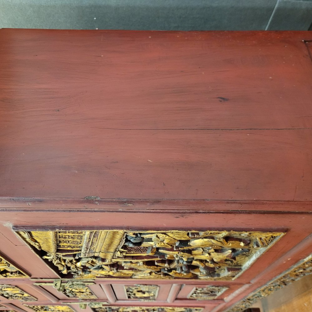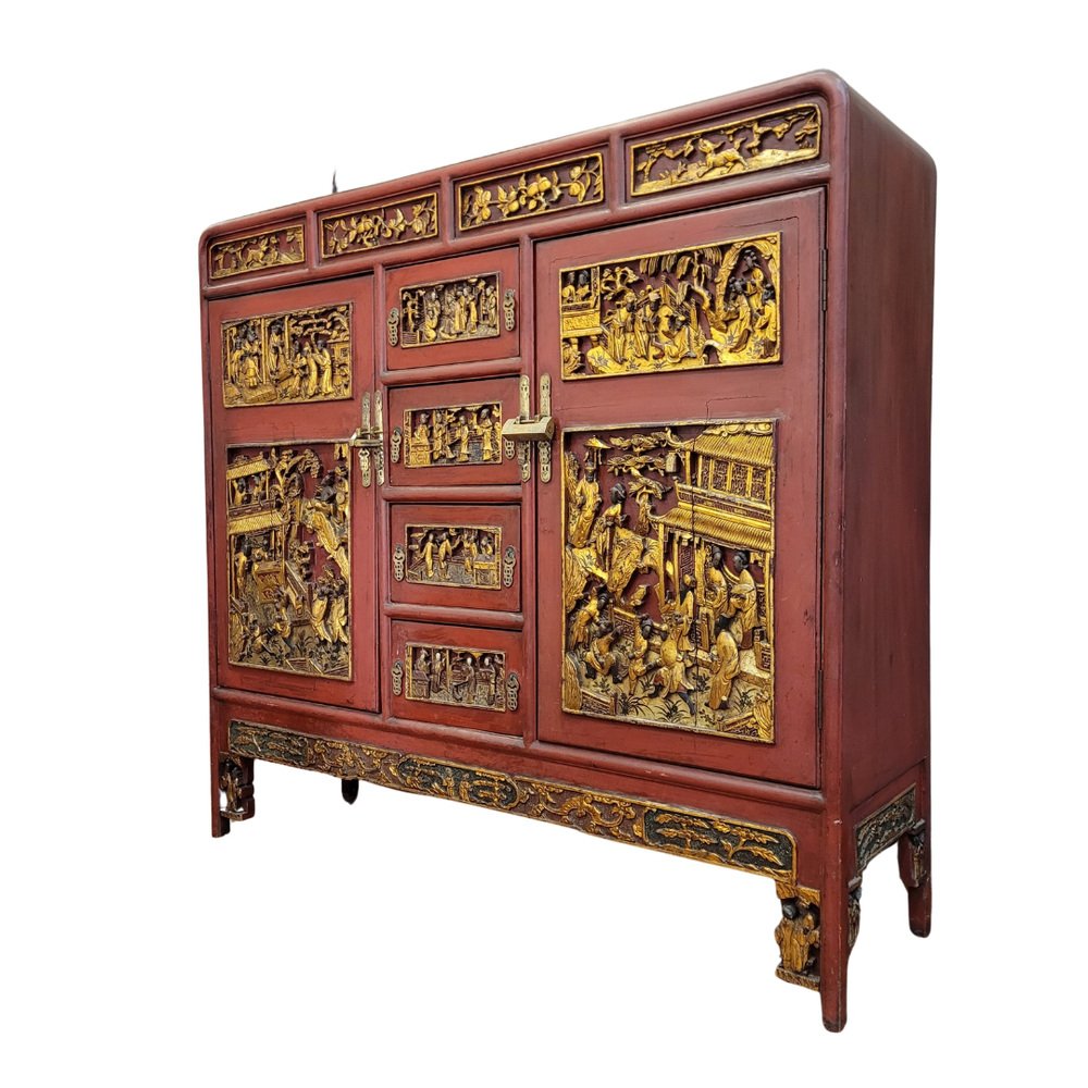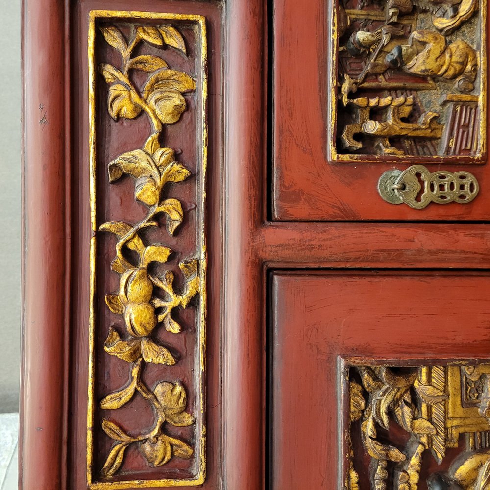 Grande mobile o credenza della fine del XIX secolo, originale della città di Ningbo, Cina. Realizzato in legno laccato, intagliato e dorato. Il colore rosso è legato in questa cultura alla classe aristocratica e imperiale. Corpo rettangolare, con angoli superiori leggermente arrotondati e poggiante su quattro gambe con una piccola gonna. Nella parte centrale presenta quattro registri e, su ciascun lato, una grande porta con una mensola all'interno (la mensola originale sul lato sinistro è mancante, ma potrebbe essere sostituita senza problemi). La distribuzione spaziale dell'interno è splendida, con un'elevata capacità di stoccaggio. Su tutta la facciata sono presenti pannelli scolpiti ad alto rilievo che rappresentano scene di palazzo, elementi vegetali e animali, dorati a foglia d'oro. Le due porte sono chiuse da lucchetti di bronzo, riccamente ornati con draghi e calligrafia cinese. I due lucchetti e le rispettive chiavi sono conservati. Pezzo unico altamente decorativo e molto raffinato.