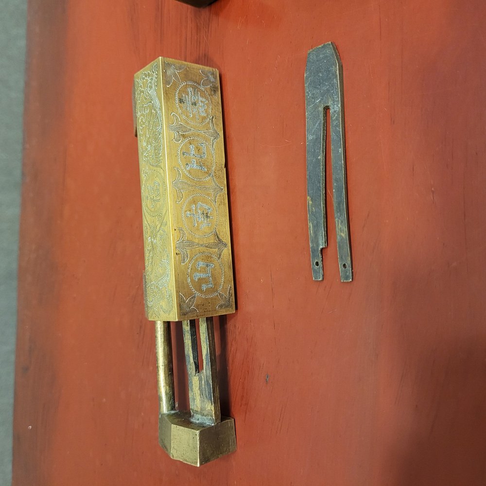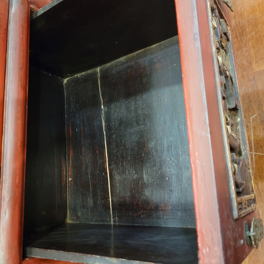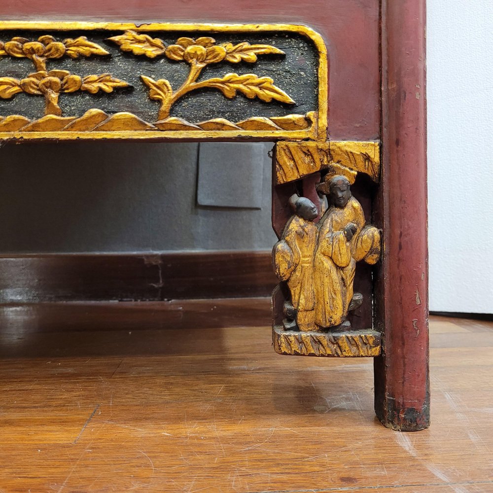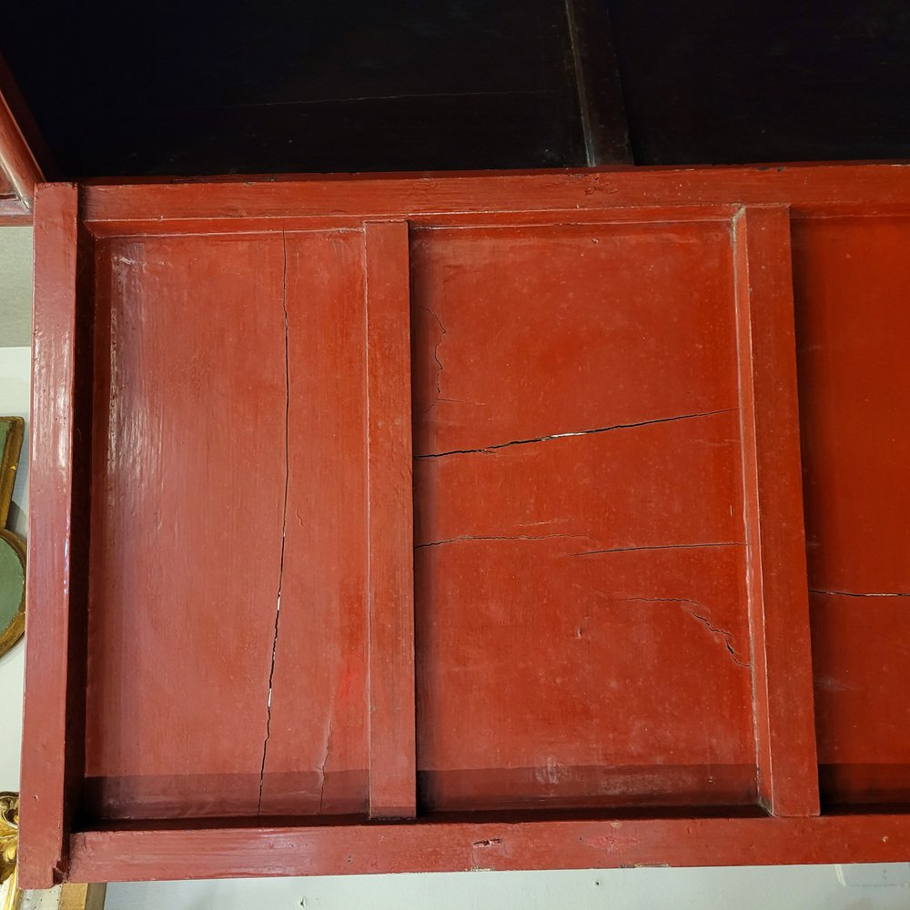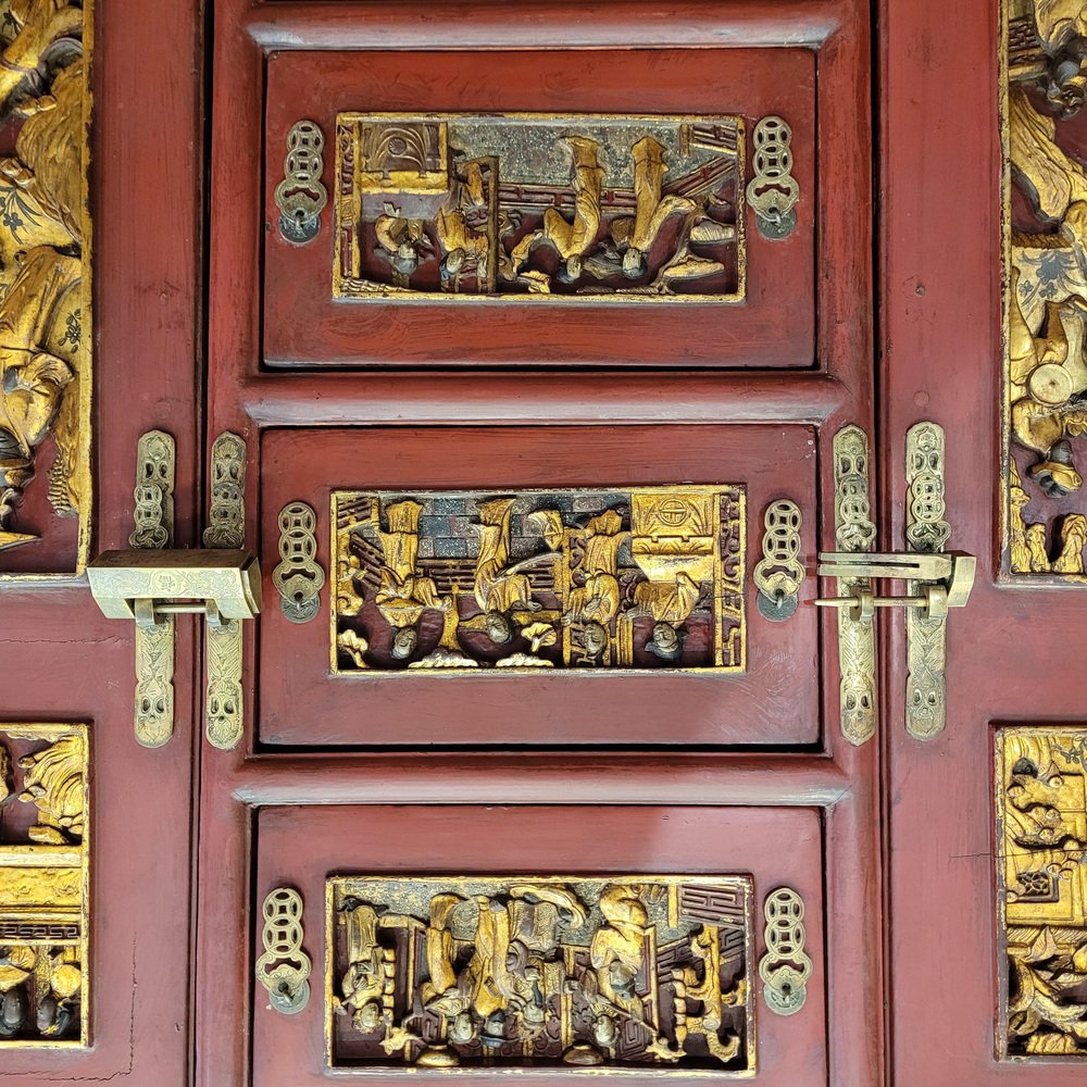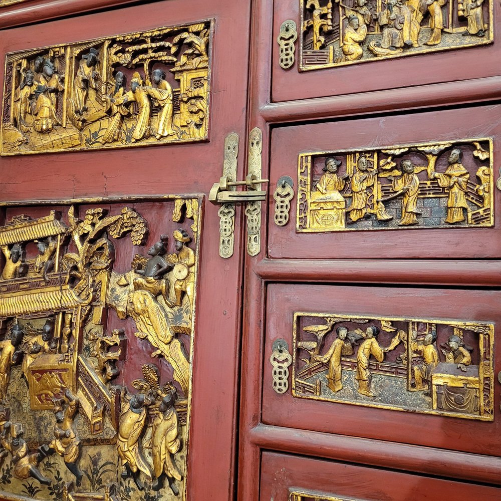 Grande mobile o credenza della fine del XIX secolo, originale della città di Ningbo, Cina. Realizzato in legno laccato, intagliato e dorato. Il colore rosso è legato in questa cultura alla classe aristocratica e imperiale. Corpo rettangolare, con angoli superiori leggermente arrotondati e poggiante su quattro gambe con una piccola gonna. Nella parte centrale presenta quattro registri e, su ciascun lato, una grande porta con una mensola all'interno (la mensola originale sul lato sinistro è mancante, ma potrebbe essere sostituita senza problemi). La distribuzione spaziale dell'interno è splendida, con un'elevata capacità di stoccaggio. Su tutta la facciata sono presenti pannelli scolpiti ad alto rilievo che rappresentano scene di palazzo, elementi vegetali e animali, dorati a foglia d'oro. Le due porte sono chiuse da lucchetti di bronzo, riccamente ornati con draghi e calligrafia cinese. I due lucchetti e le rispettive chiavi sono conservati. Pezzo unico altamente decorativo e molto raffinato.