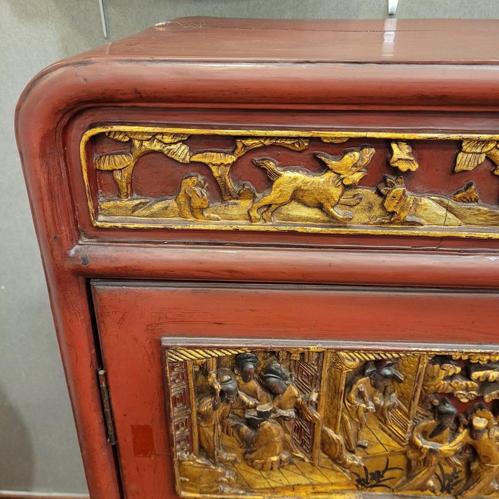 Large cabinet or sideboard from the late 19th century, original from the city of Ningbo, China. Made of lacquered, carved and gilded wood. The color red is related in this culture to the aristocratic and imperial class. Rectangular body, with slightly rounded upper corners and resting on four legs with a small skirt. In the central part it has four registers and, on each side, a large door with a shelf inside (the original shelf on the left side is missing, but it could be replaced without problems). The spatial distribution of the interior is splendid, with high storage capacity. Throughout the front there are panels carved in high relief that represent palace scenes, plant and animal elements, gilded with gold leaf. The two doors are closed by bronze padlocks, richly ornamented with dragons and Chinese calligraphy. The two padlocks and their respective keys are preserved. Highly decorative and very refined unique piece.