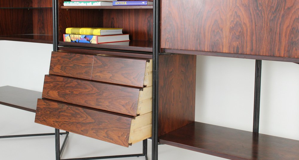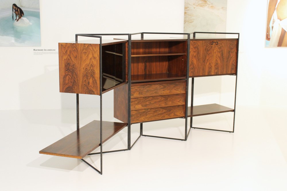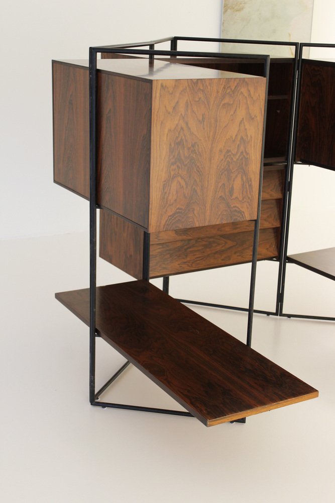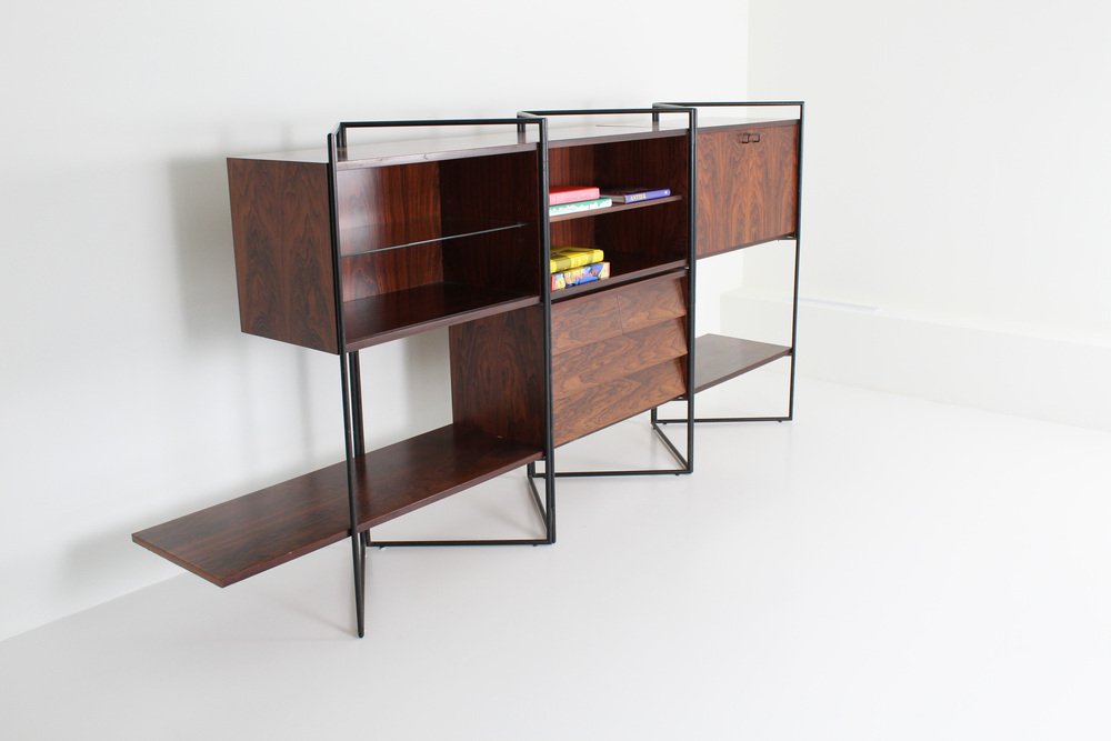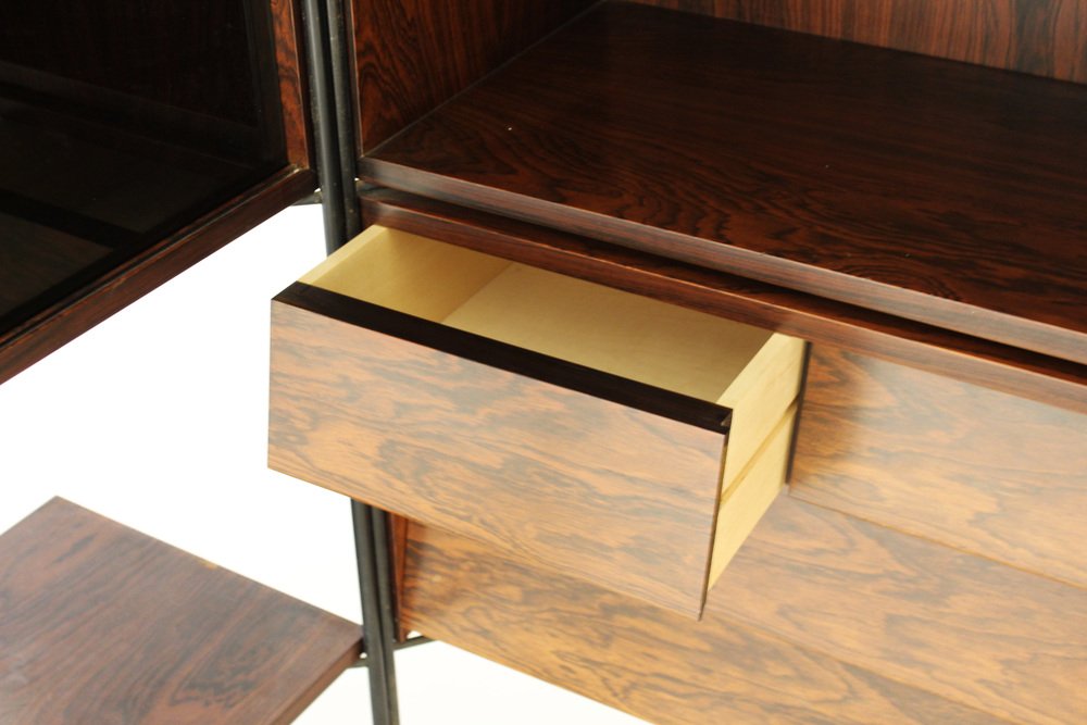 Taichiro Nakay (Nakai) per La Permanente Mobili, libreria, ferro laccato, teak, vetro, ottone, acero, 1953 ca
