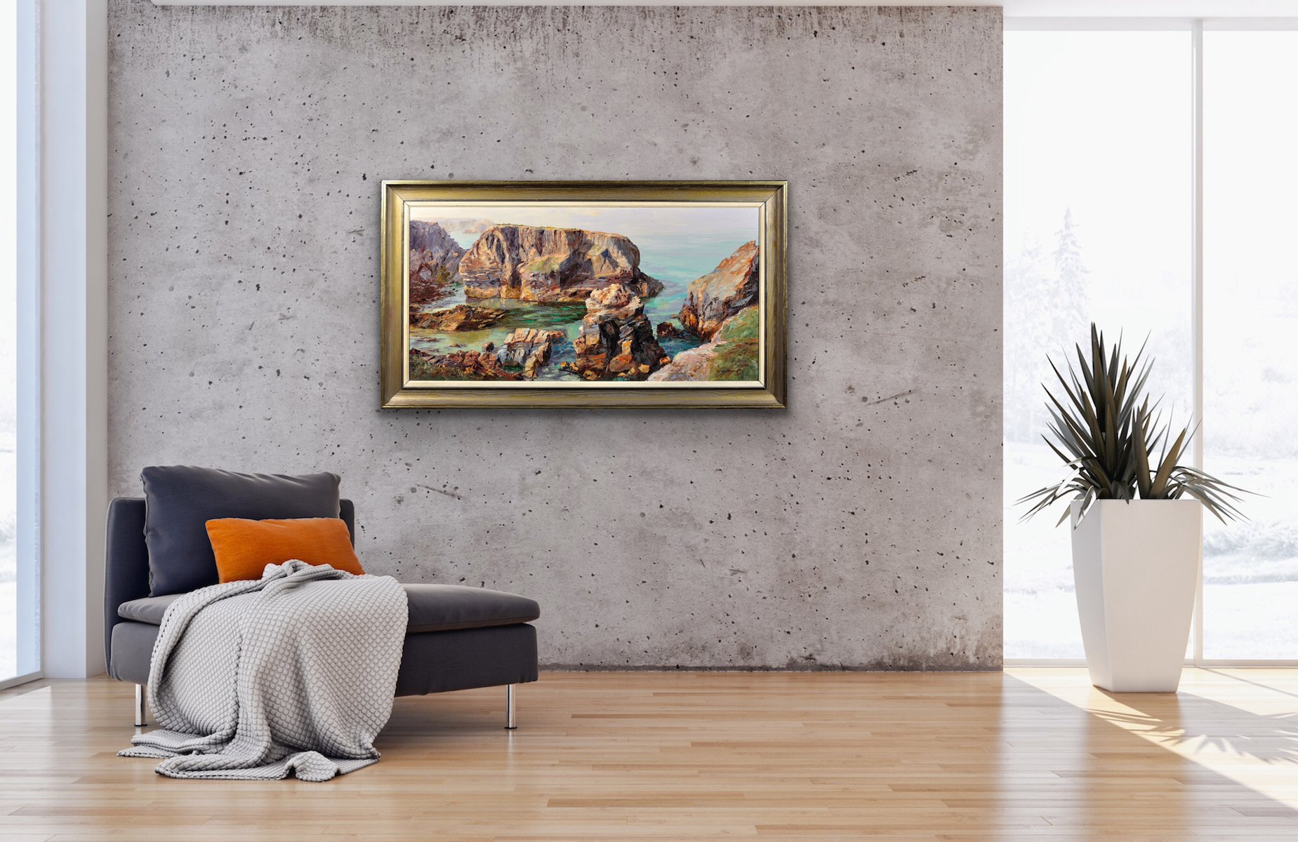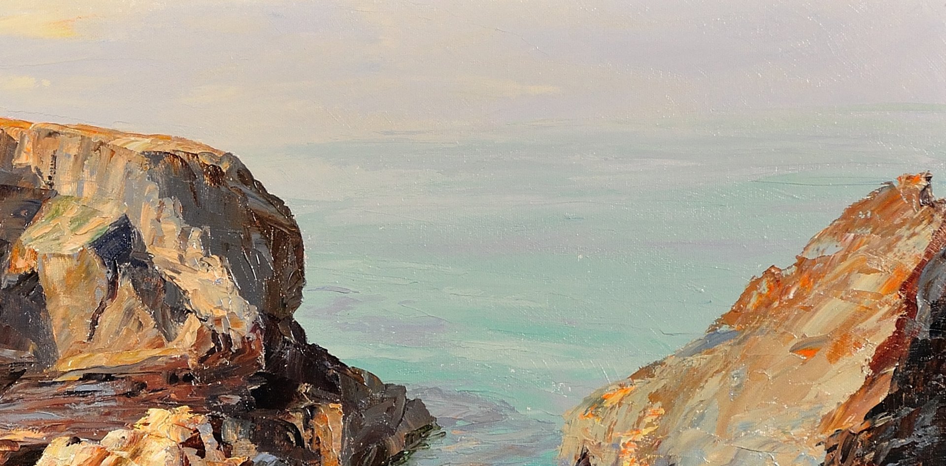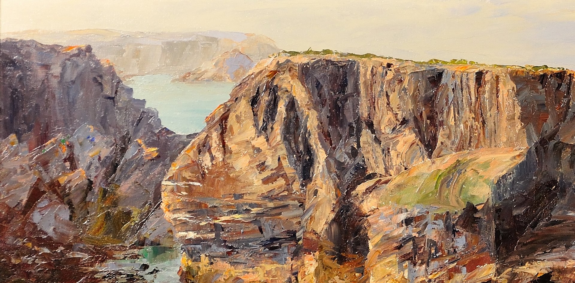 The Minnows Islands are a group of large rocks in the sea off the coast of Cornwall, north of Porthcothan, near Fox Cove. They are part of a particularly dramatic and beautiful coastline. This original oil on canvas shows a view of the Minnows from the shore, from an elevated vantage point. The craggy rocks, in delicate shades of stone and brown, stand solid and proud, whilst the sea beneath them looks clear and calm. The use of turquoise in the waters is particularly effective here, giving a translucent property to the sea. In the distance the sky is pale, with the horizon almost indistinguishable from the ocean.