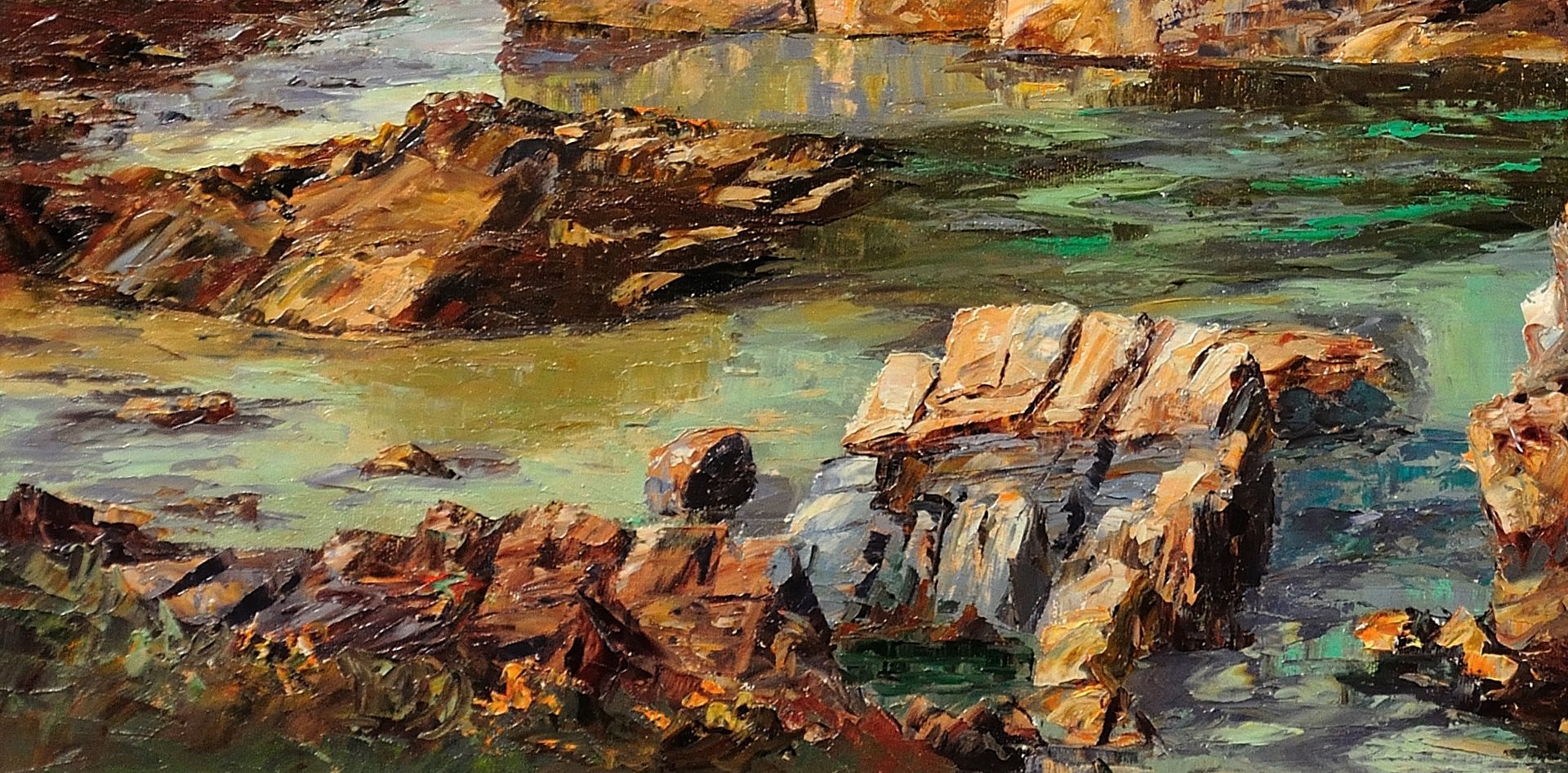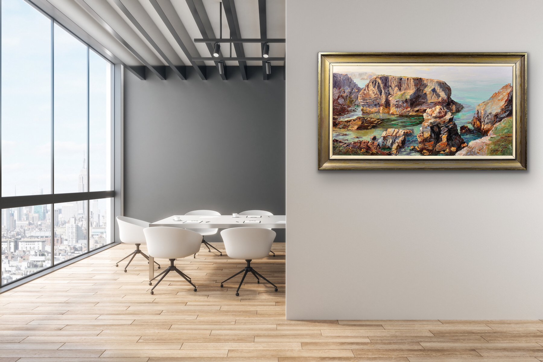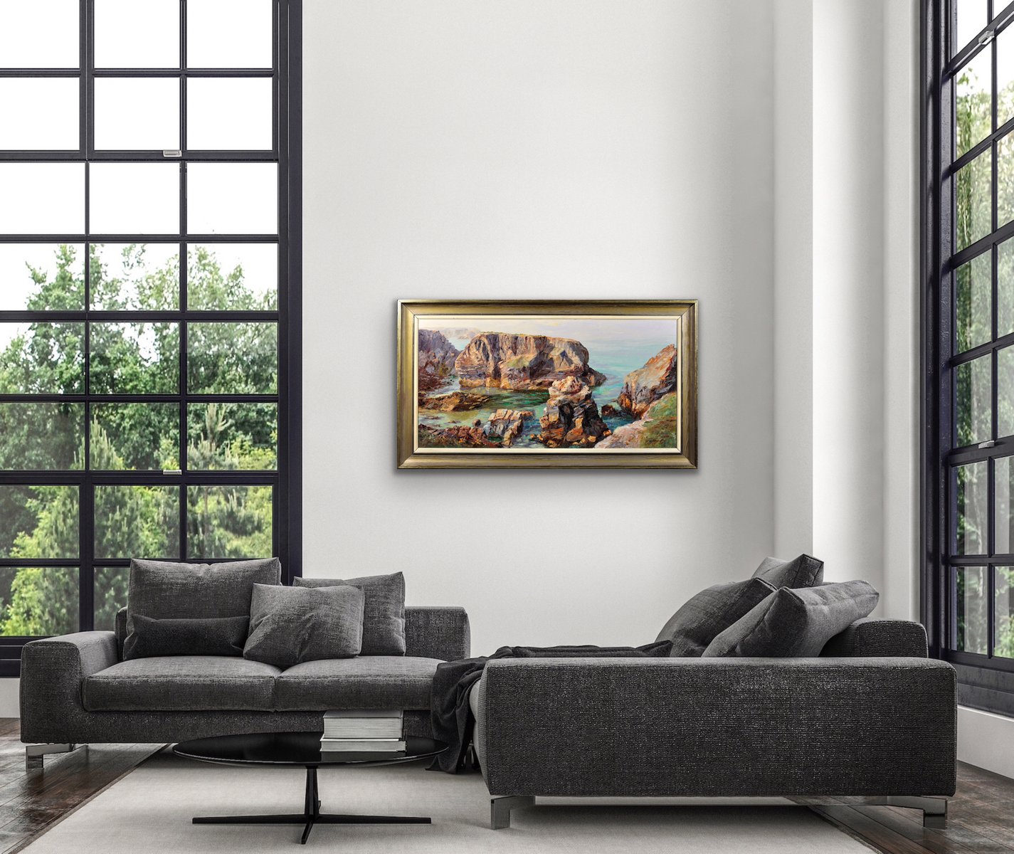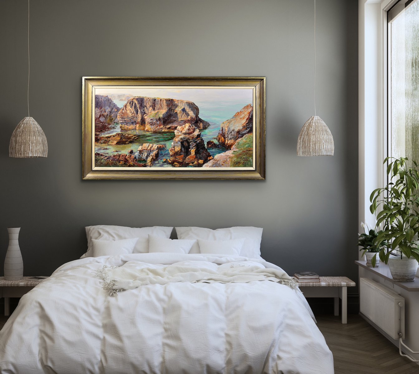 The Minnows Islands are a group of large rocks in the sea off the coast of Cornwall, north of Porthcothan, near Fox Cove. They are part of a particularly dramatic and beautiful coastline. This original oil on canvas shows a view of the Minnows from the shore, from an elevated vantage point. The craggy rocks, in delicate shades of stone and brown, stand solid and proud, whilst the sea beneath them looks clear and calm. The use of turquoise in the waters is particularly effective here, giving a translucent property to the sea. In the distance the sky is pale, with the horizon almost indistinguishable from the ocean.